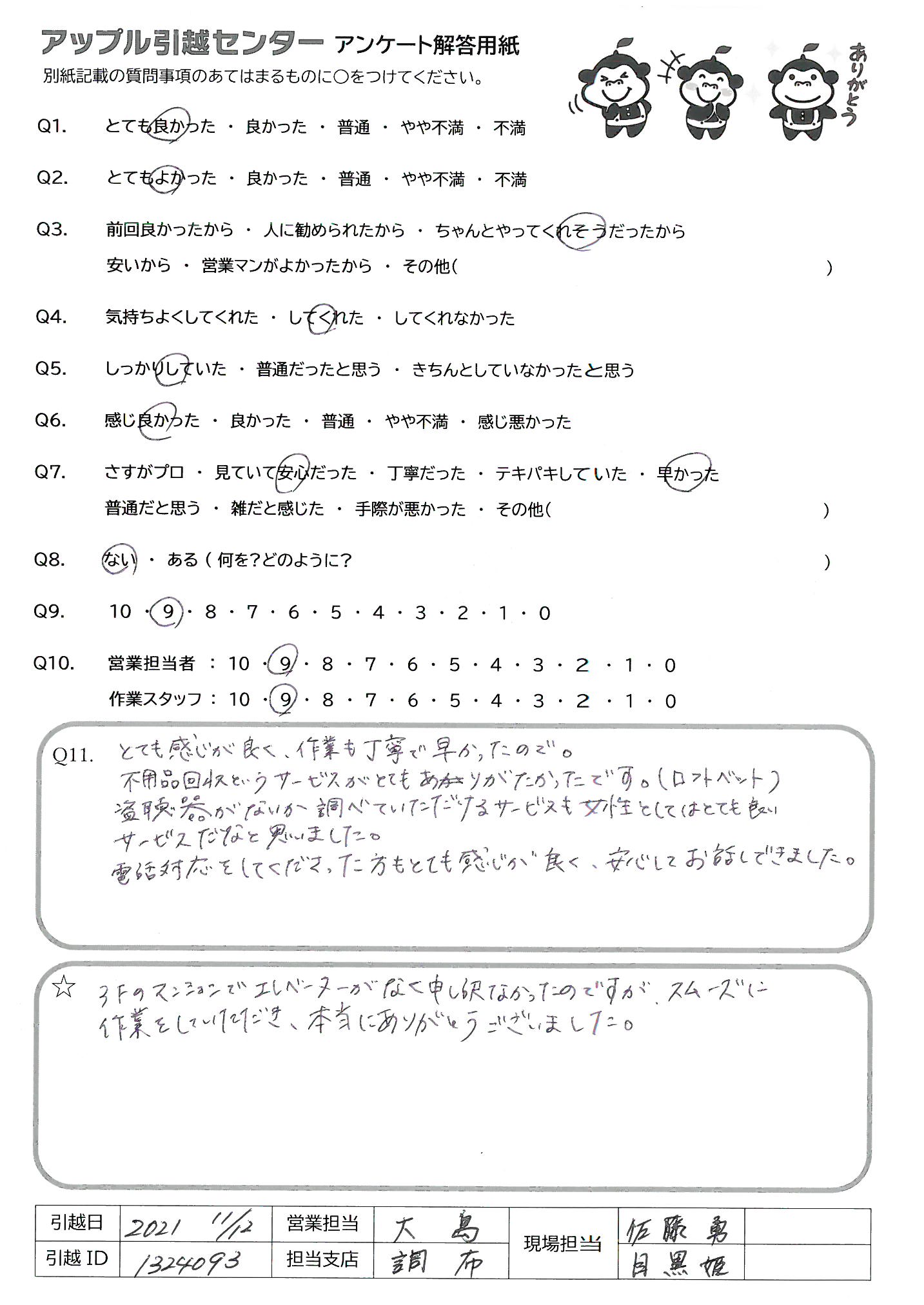 引越し日:2021年11月12日 エリア:神奈川県横浜市港北区