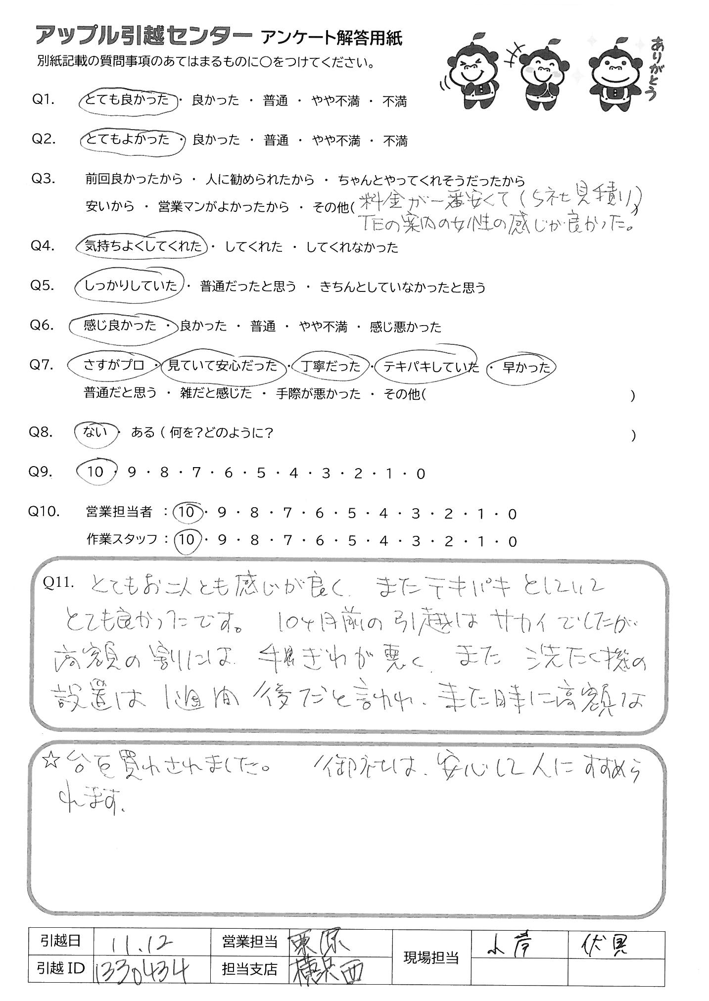 A.これまで3回、お願いしましたが、(始めの2回は荷物の運搬的なものでほとんど問題ありませんでしたが)3回目である今回は引っ越し作業そのもので、残念ながら満足のゆく感じではありませんでした。次回(11月26日)は、よろしくお願いします。
