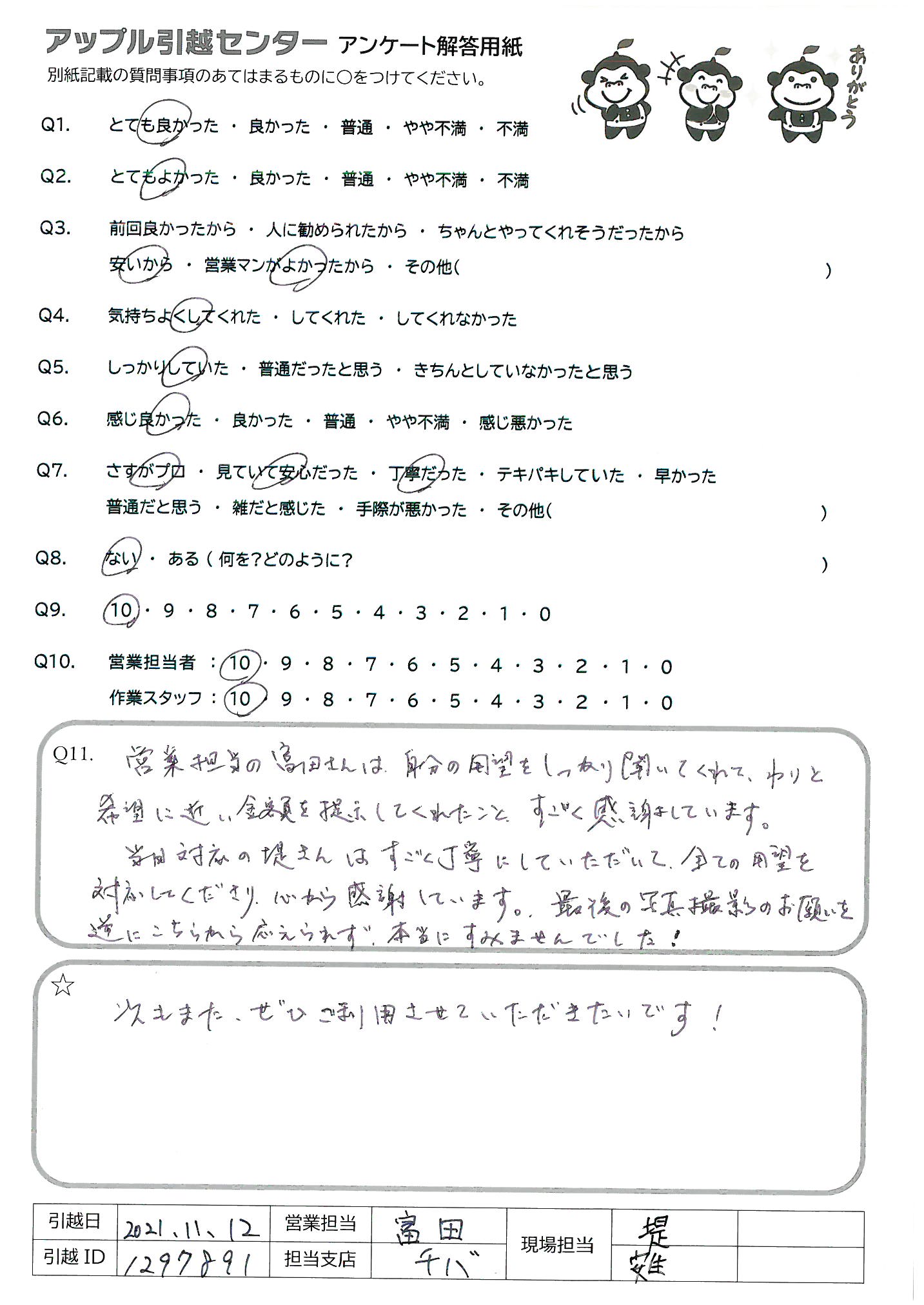 A.営業担当の富田さんは自分要望をしっかり聞いてくれて、わりと希望に近い金額を提示してくれたこと、すごく感謝しています。 当日対応の堤さんはすごく丁寧にしていただいて、全ての要望を対応してくださり心から感謝しています。最後の写真撮影のお願いを逆にこちらから応えられず、本当にすみませんでした!
