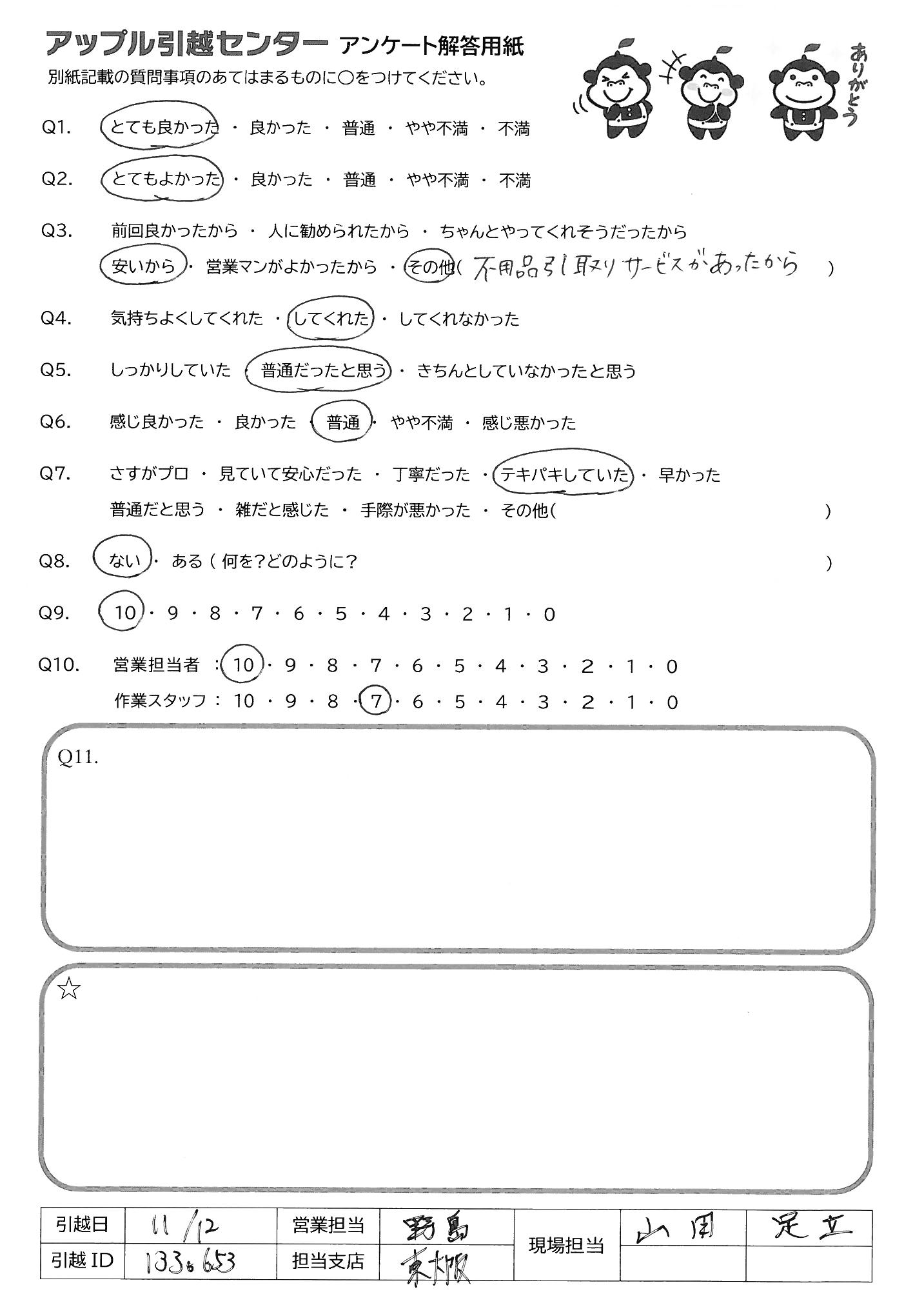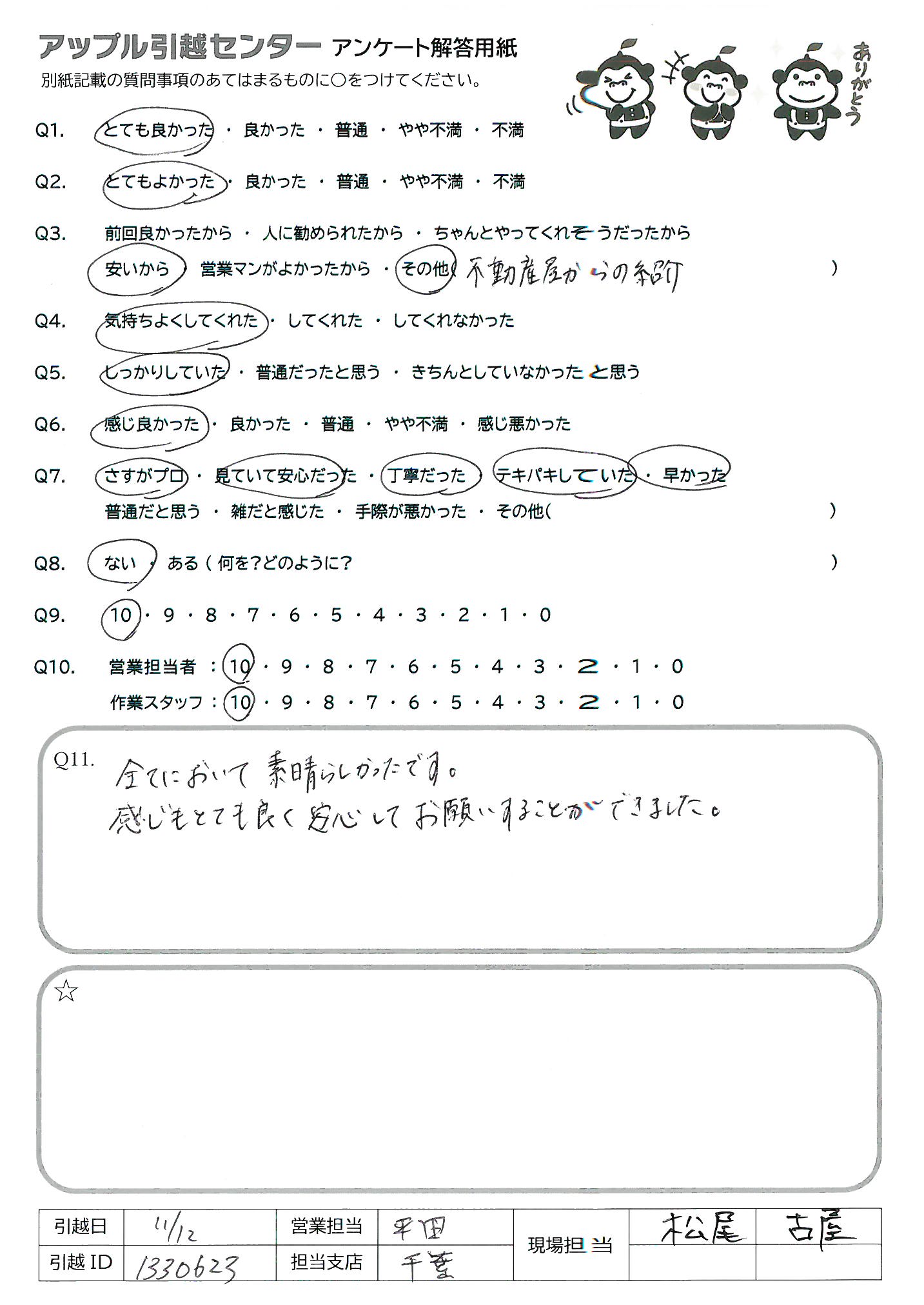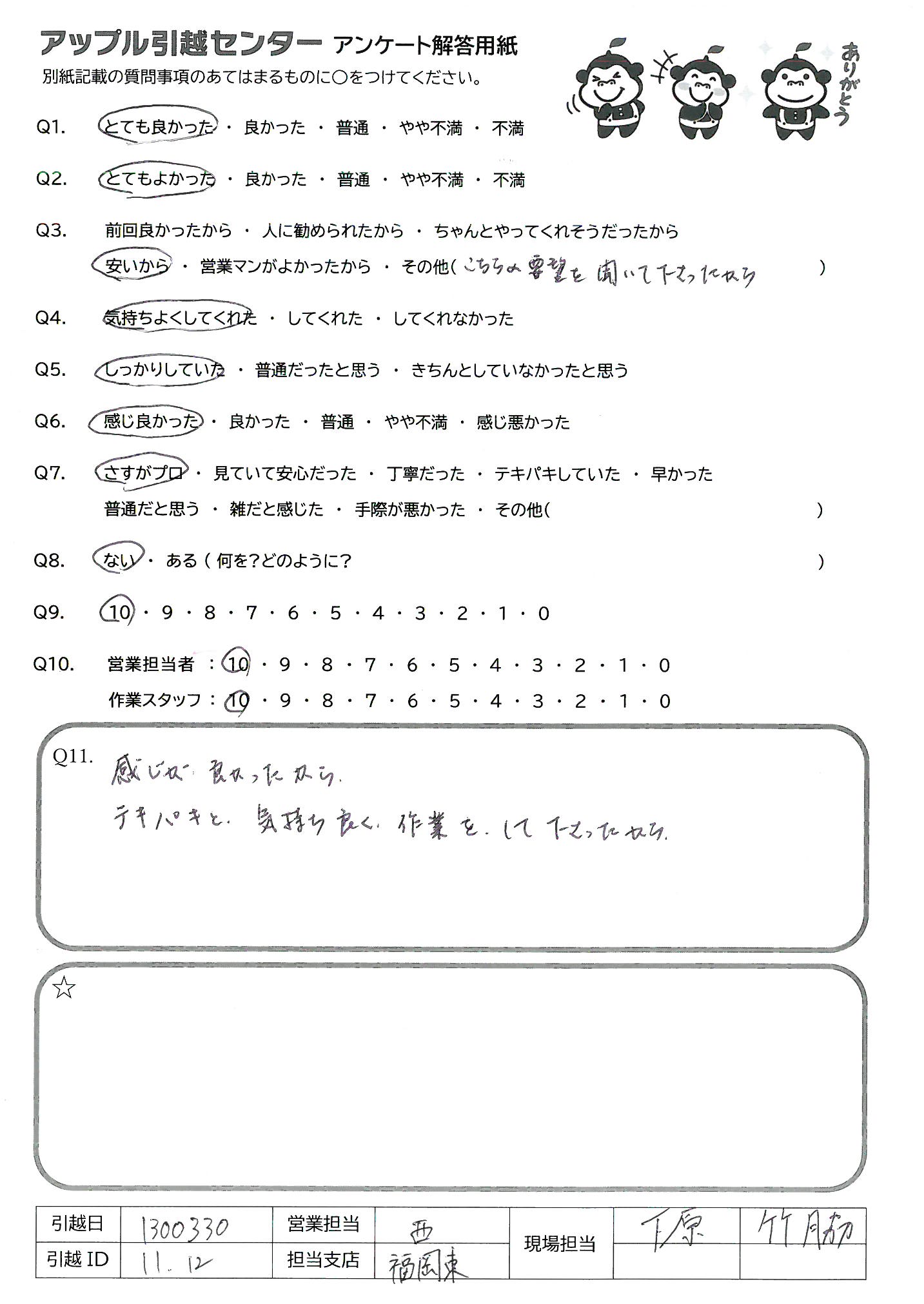 A.山田様、吉田様 とても気持ちよく手際良く荷物を運んでいただき ありがとうございました。