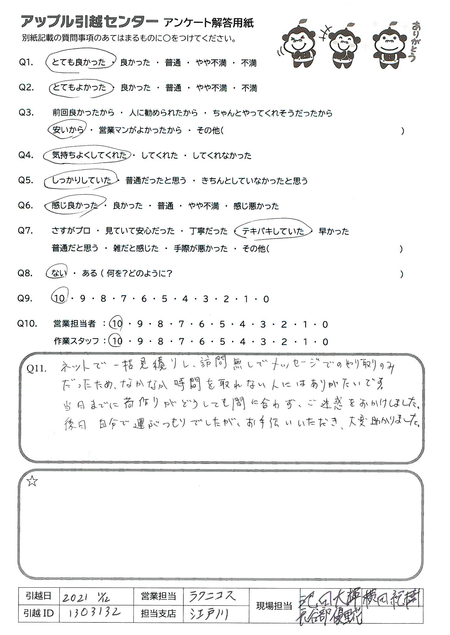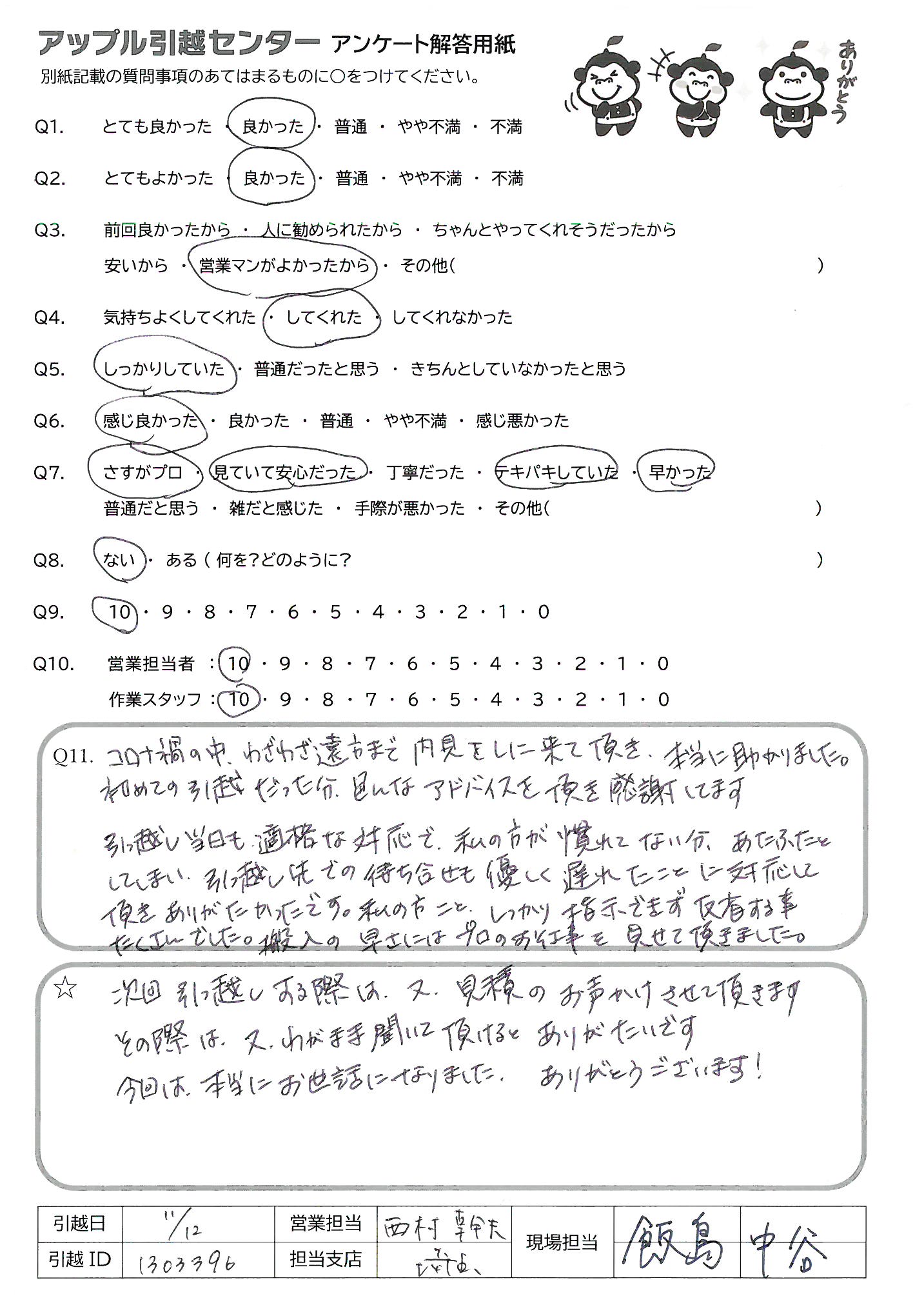 A.コロナ禍の中、わざわざ遠方まで内見をしに来て頂き、本当に助かりました。 初めての引越だった分、色んなアドバイスを頂き感謝しています。 引っ越し当日も、適格な対応で、私の方が慣れてない分、あたふたとしてしまい、引っ越し先での待ち合せも優しく遅れたことに対応して頂きありがたかったです。私の方のこと、しっかり指示できず反省する事たくさんでした。搬入の早さにはプロのお仕事を見せて頂きました。