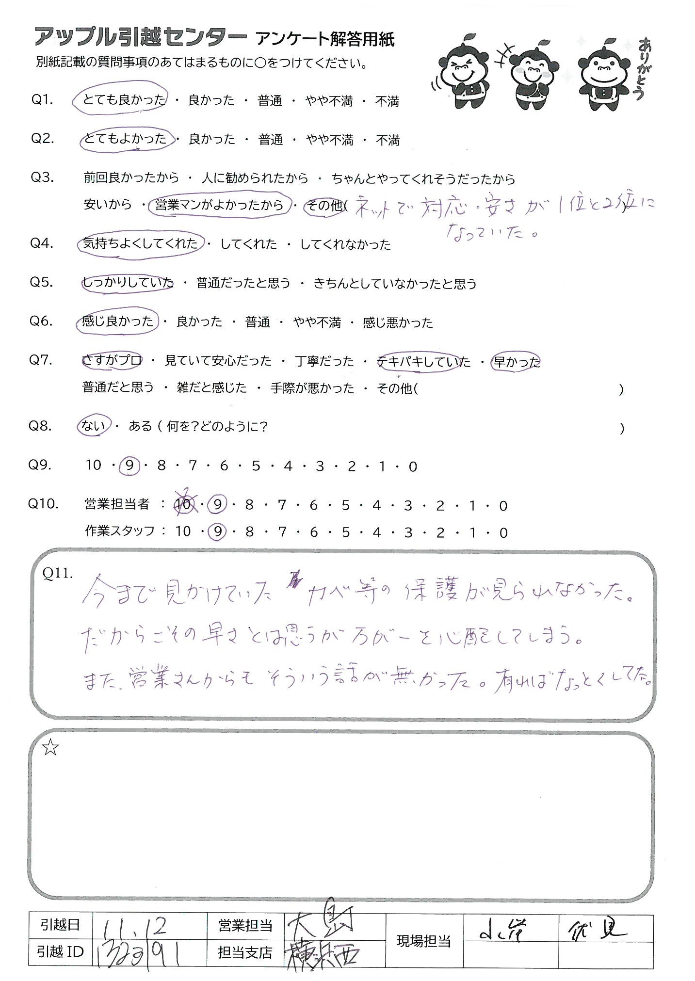 A.とても感じも良く、手際も良く、終始優しく、事情があり準備万端ではなかった私に「ゆっくり詰めていただいて大丈夫ですよ。」とお声かけいただき焦っていた気持ちが落ち着けました。ありがとうございました。 100点と付けたいところですが、食器棚のネジのつけ忘れがあったのと、盗聴器サービスが、私がトラックの荷物確認へ行って席を外した際にやったと言う事で目の前で見れなかったので、後から本当にやってくれたのかな。大丈夫だったかな。と言う気持ちになってしまいました。きっとやって下さっているとは思いますが、目の前でやっていただけたら安心できだと思います。せっかく無料でとてもいいサービスをして下さっているのに結局その姿が目の前で見れなかったので、やってくれたとはおっしゃっていましたが、真実が分からないのが残念でした。