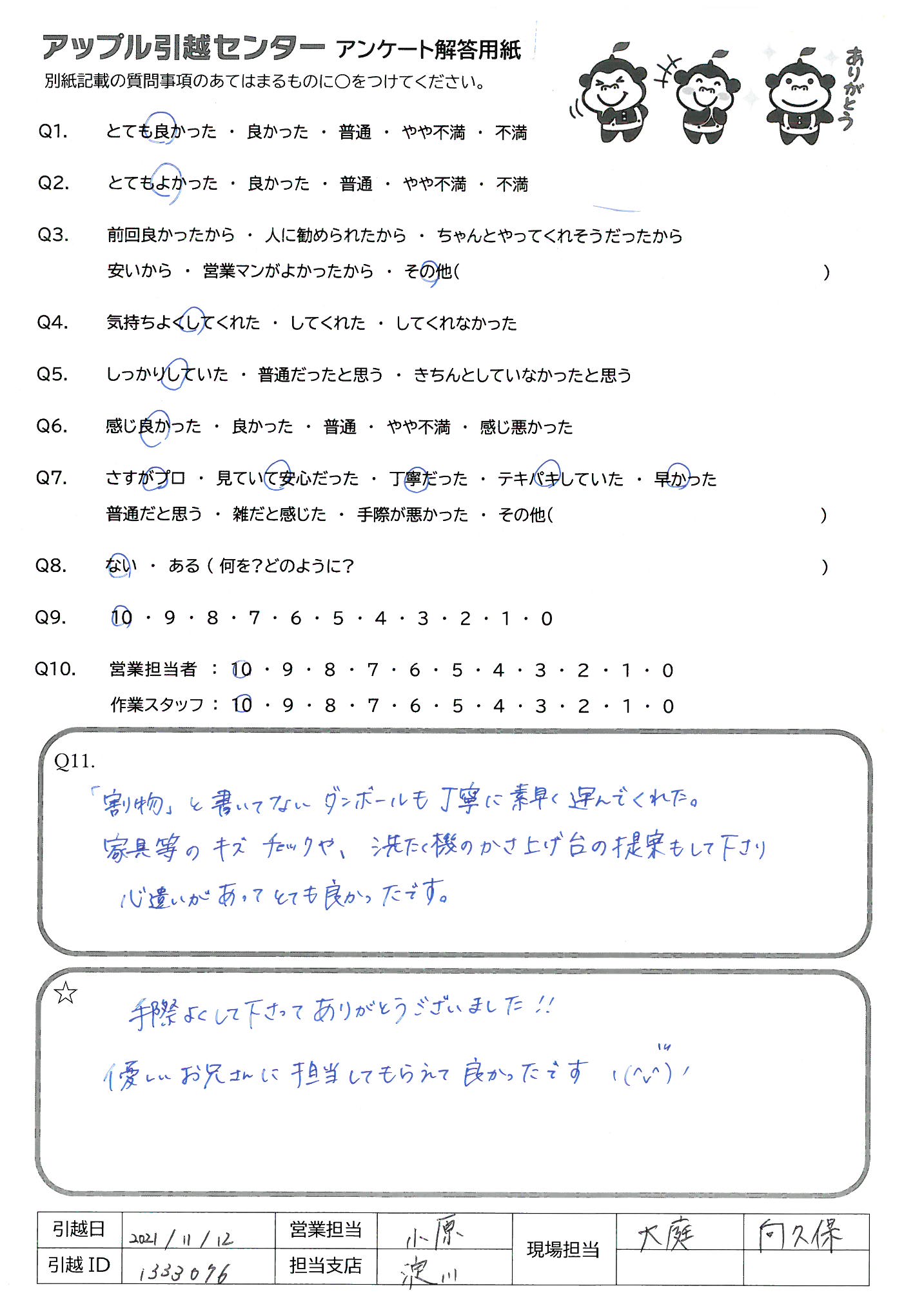 A.二回目お願いしましたが、実際作業していただいたスタッフさん全員が印象が良かったです。 引き取りもしていただけて、大変助かりました。 とても良いサービスでした。 しかし、今回段ボールの引き取りにとても手間取りました。 引越し前日の仕事終わりに車で仙台から東京に移動のため、配達時間が21時でも間に合わないので、クロネコヤマトに問い合わせをしました。 エントランスに置いて欲しいとお願いしましたが、宅配ボックスに入らなかったら持ち帰ると言われてしまいました。 引越しは次の日の午後でしたが、配達を午前中に指定してもお昼近くになるかもしれないということで、それでは間に合わないので引越し当日の朝にわざわざカートを持って引き取りに行くハメになりました。 そのため、前日の夜に荷造りが出来ず予想外の展開で大変でした。 荷物を引き取ってから気付いたのですが、貼り付けられた伝票のメモに、不在の際にはエントランスに置いてもらうように書いてありました。 しかし、クロネコヤマトの問い合わせの際にはアップルさんからもそう依頼されているという話は一切ありませんでした。 これはクロネコヤマト側の問題なので、アップルさんの全体の評価は満点です。 このようなトラブルもあったことを念のためにお知らせいたします。 また機会がありましたら、よろしくお願いします。