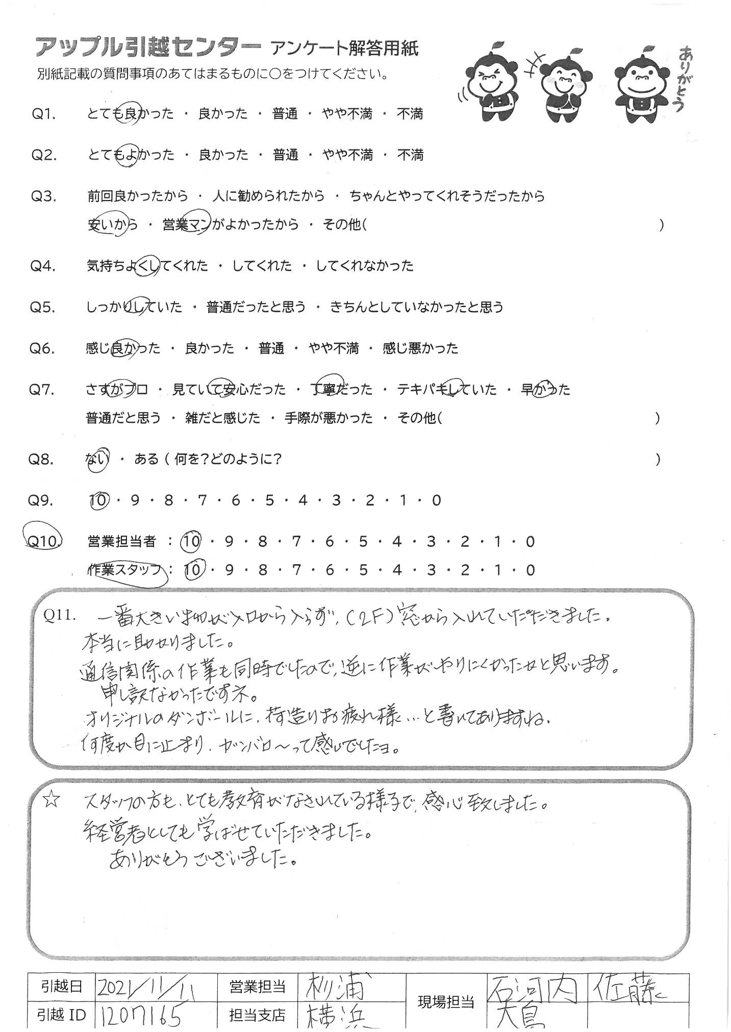 引越し日:2021年11月11日 エリア:神奈川県横浜市港北区
