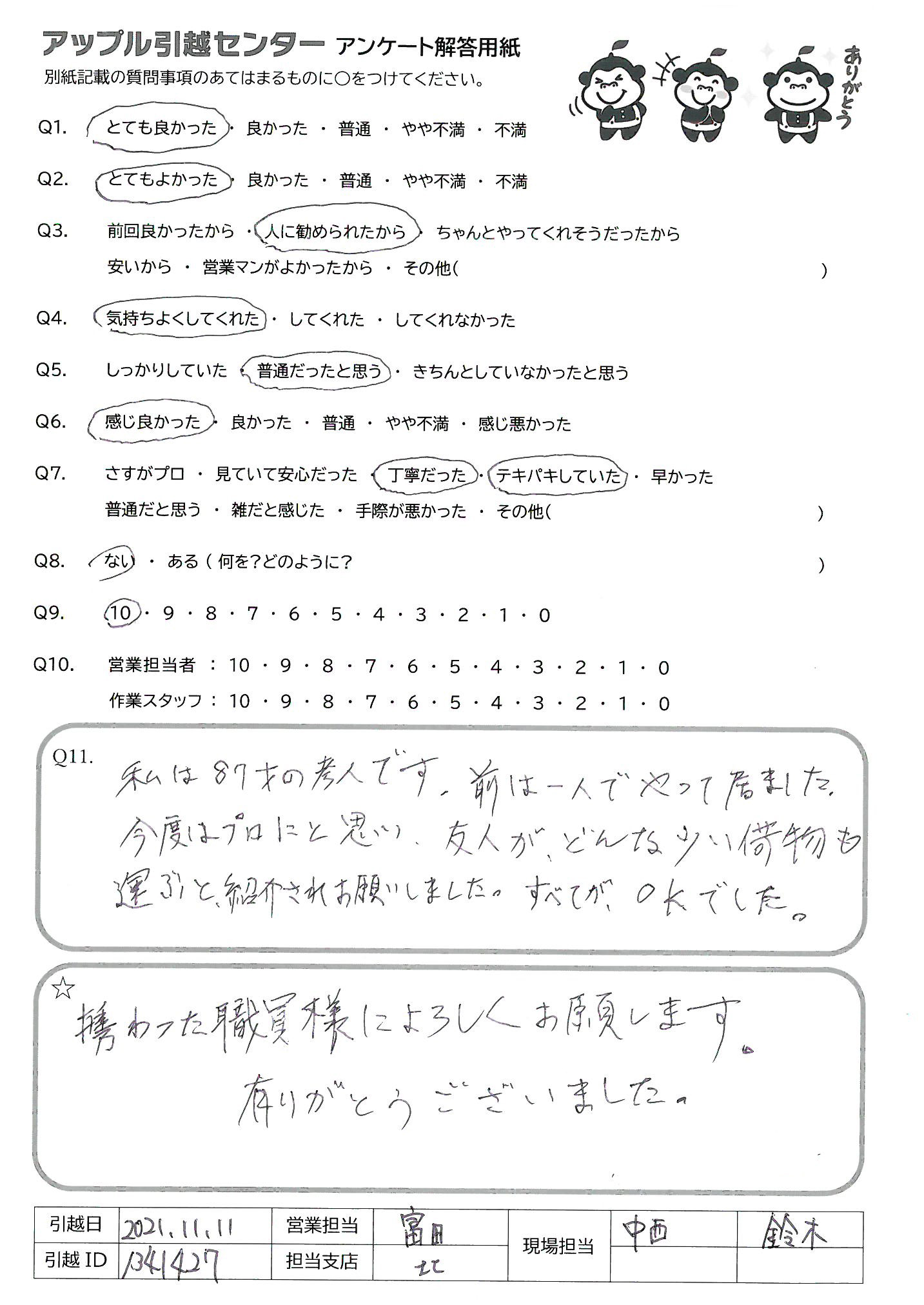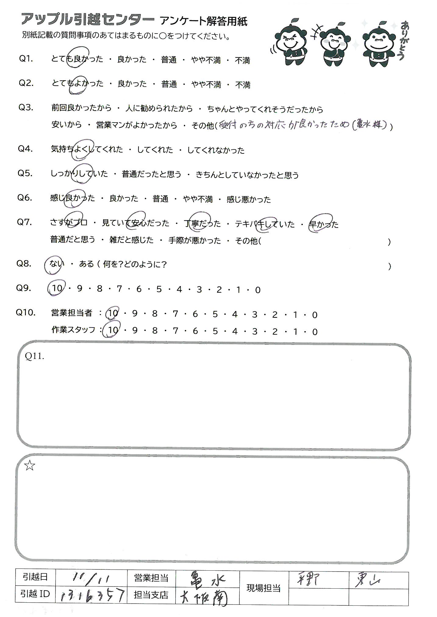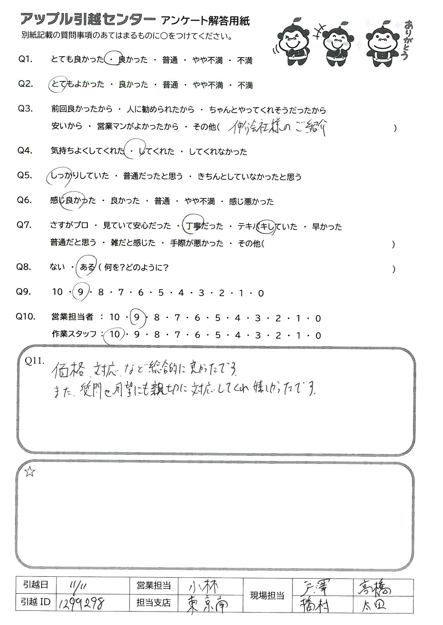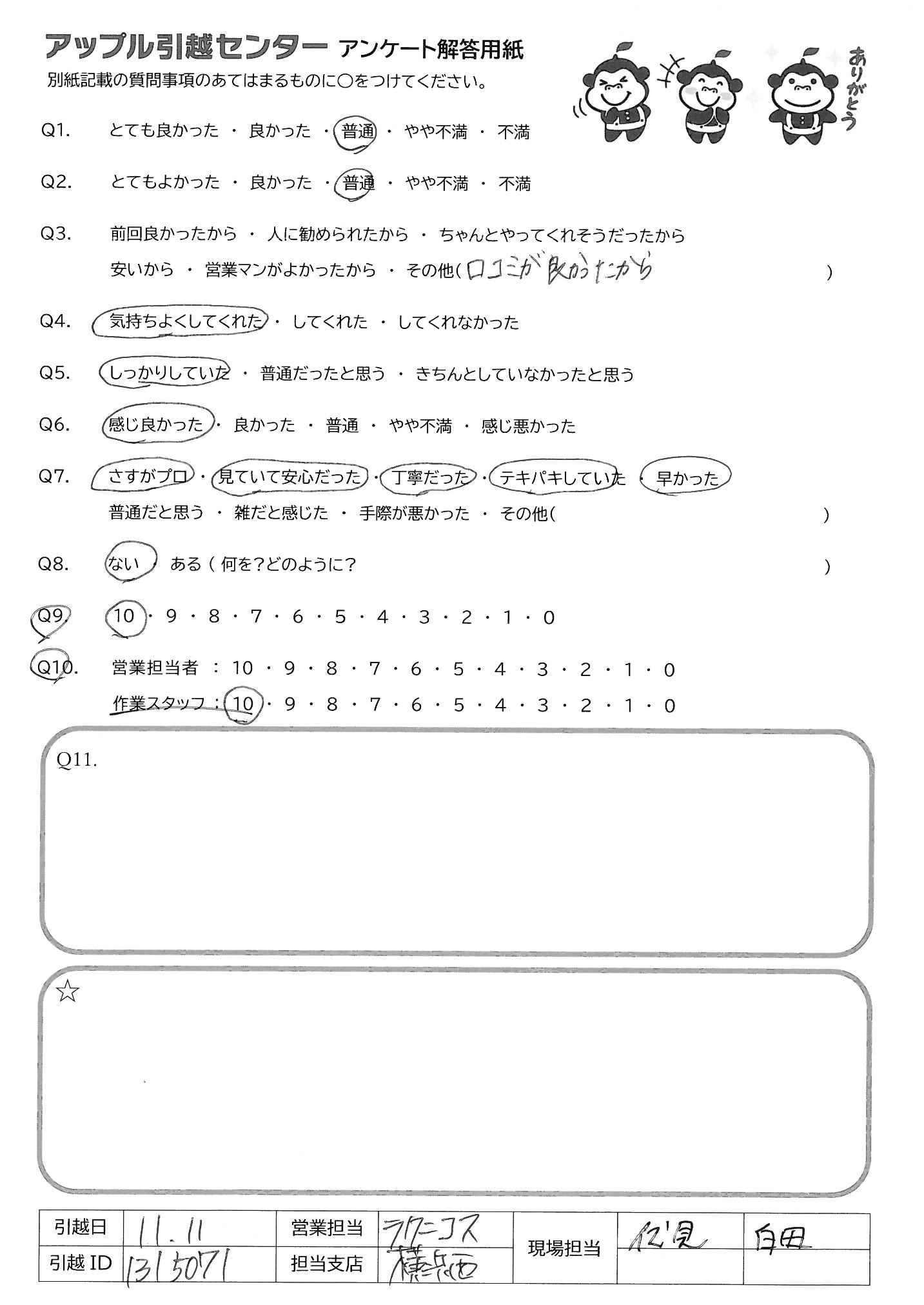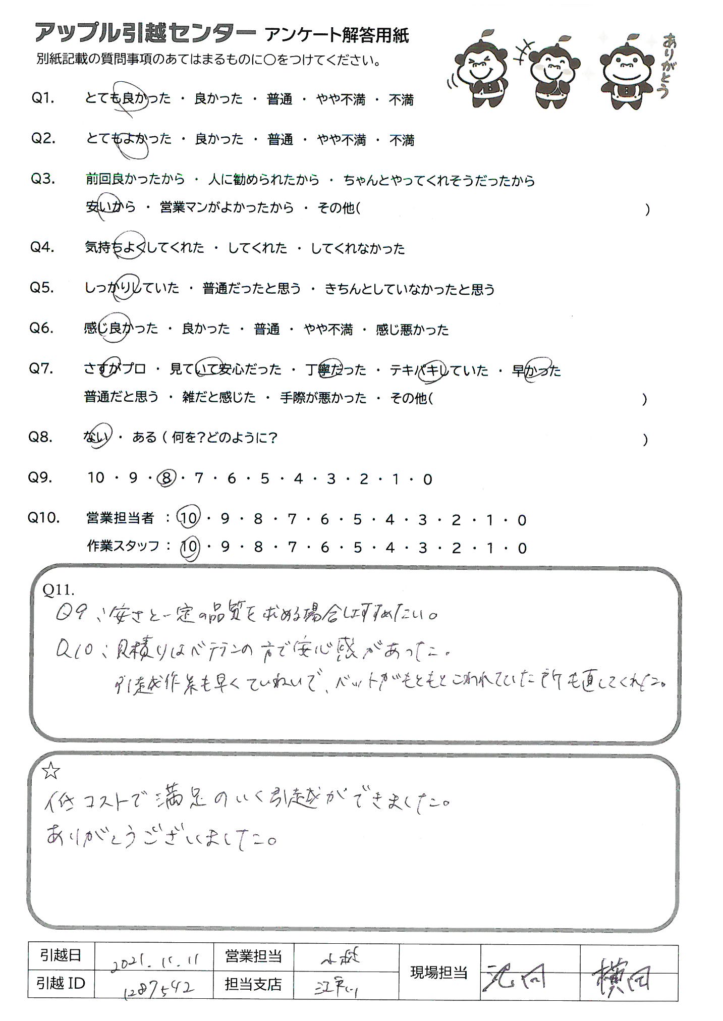 A.Q9:安さと一定の品質を求める場合はすすめたい。 Q10:見積りはベテランの方で安心感があった。 引越作業も早くていねいで、ベットがもともとこわれていた所も直してくれた。