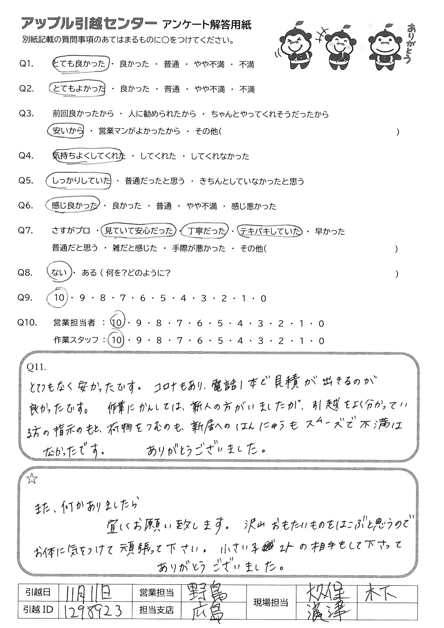 引越し日:2021年11月11日 エリア:広島県広島市安佐南区