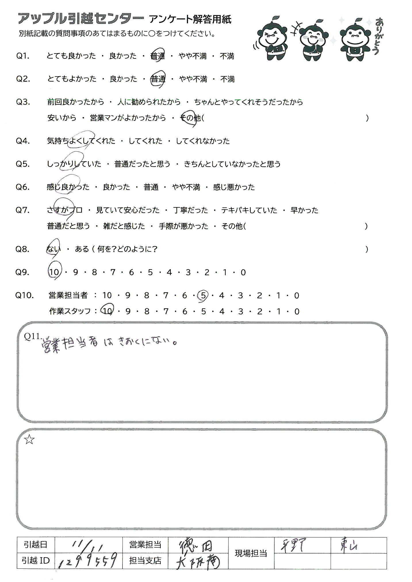 A.営業担当者はわかりませんが、作業を担当されたかたは、とてもテキパキしており、早く丁寧でした。また、時間が遅くなってしまったが、夜遅くまで笑顔で対応して下さり本当に気持ちよかったです。また、利用したいと思います。