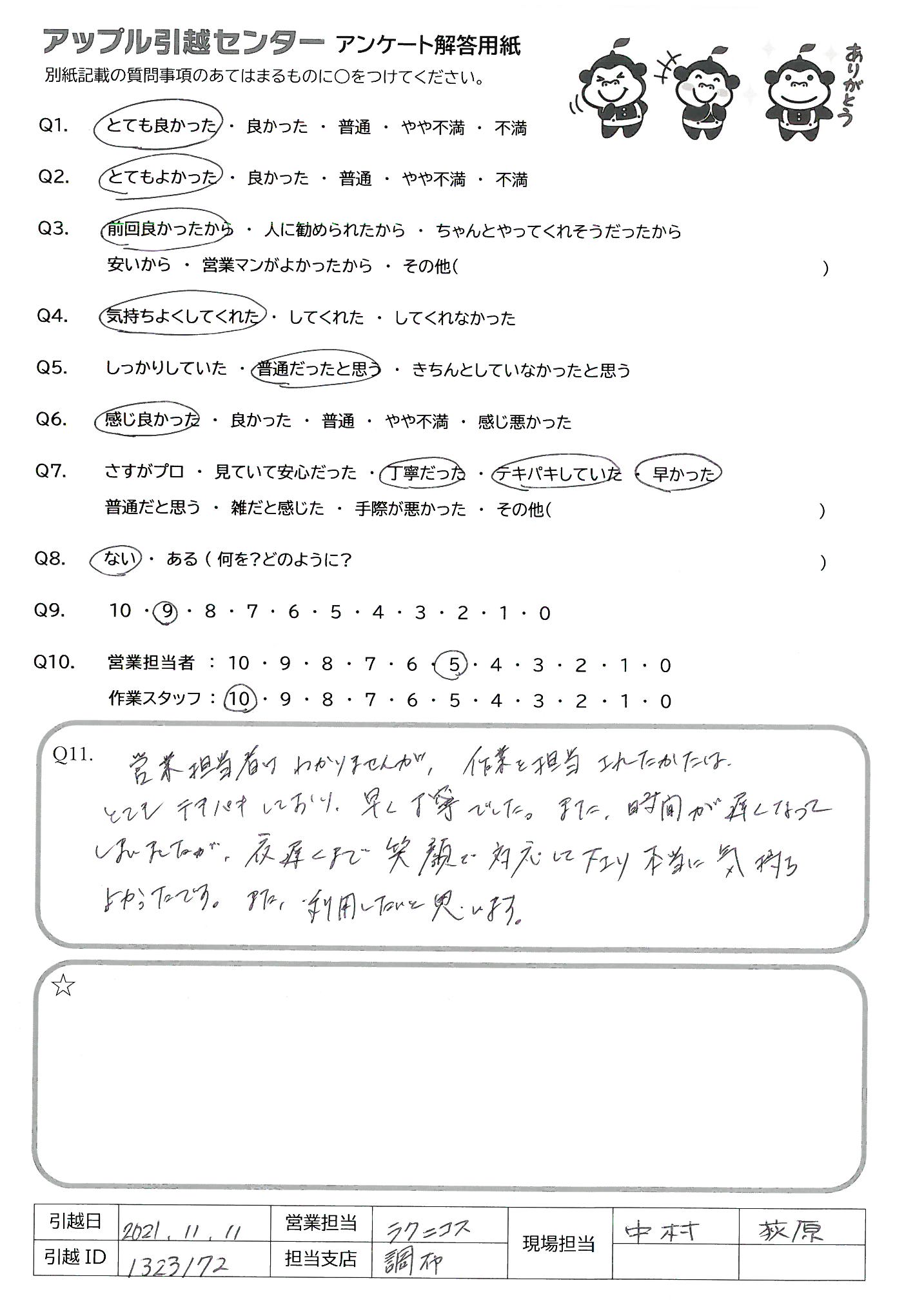 A.リーダーとサブスタッフ2名の協力、 連携がスムーズで、作業も早かったため。 初めての引越しでしたが、安心して お任せできました。 ありがとうございました。
