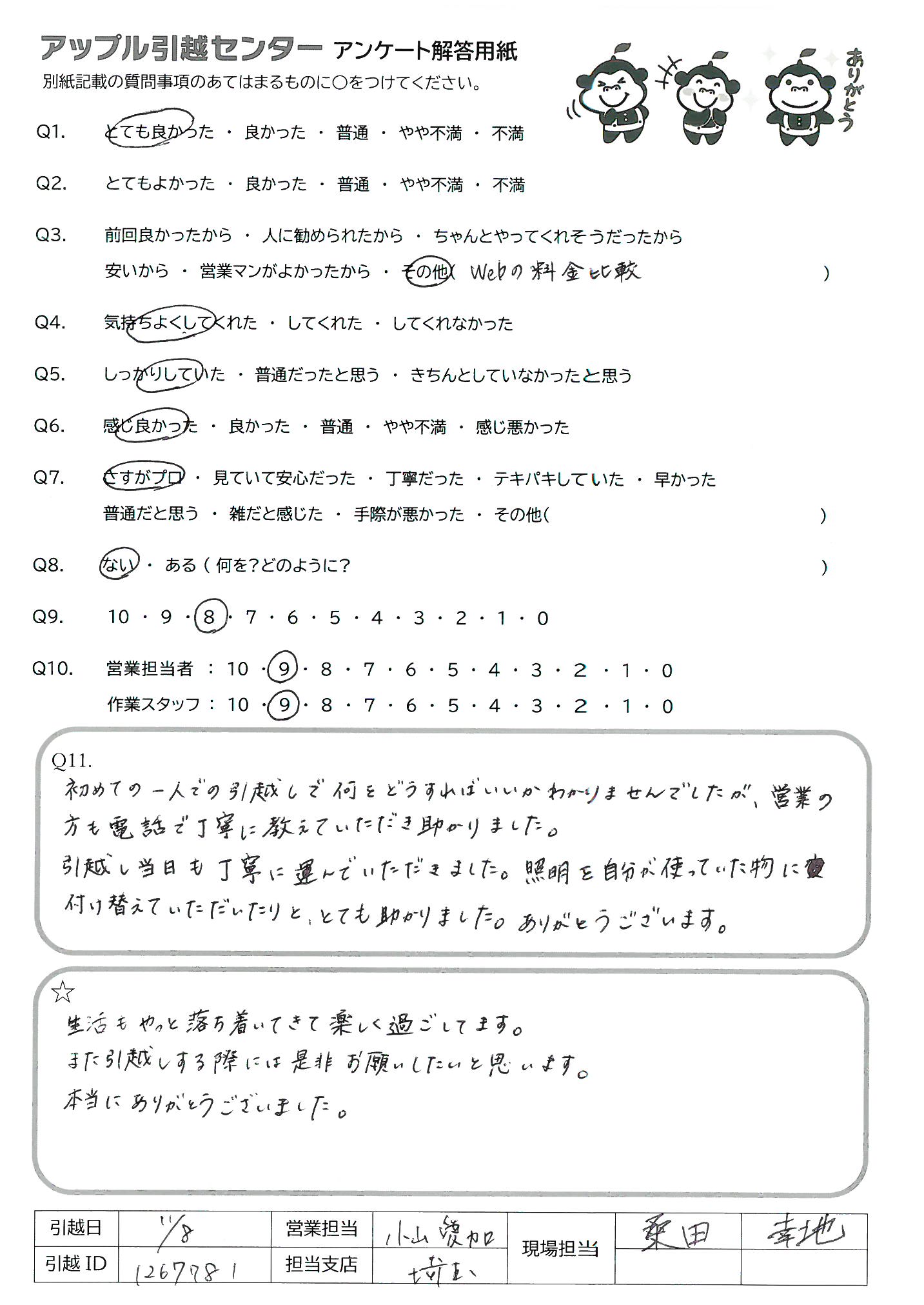 A.初めての一人での引越しで何をどうすればいいかわかりませんでしたが、営業の方も電話で丁寧に教えていただき助かりました。 引越し当日も丁寧に運んでいただきました。照明を自分が使っていた物に付け替えていただいたりと、とても助かりました。ありがとうございます。