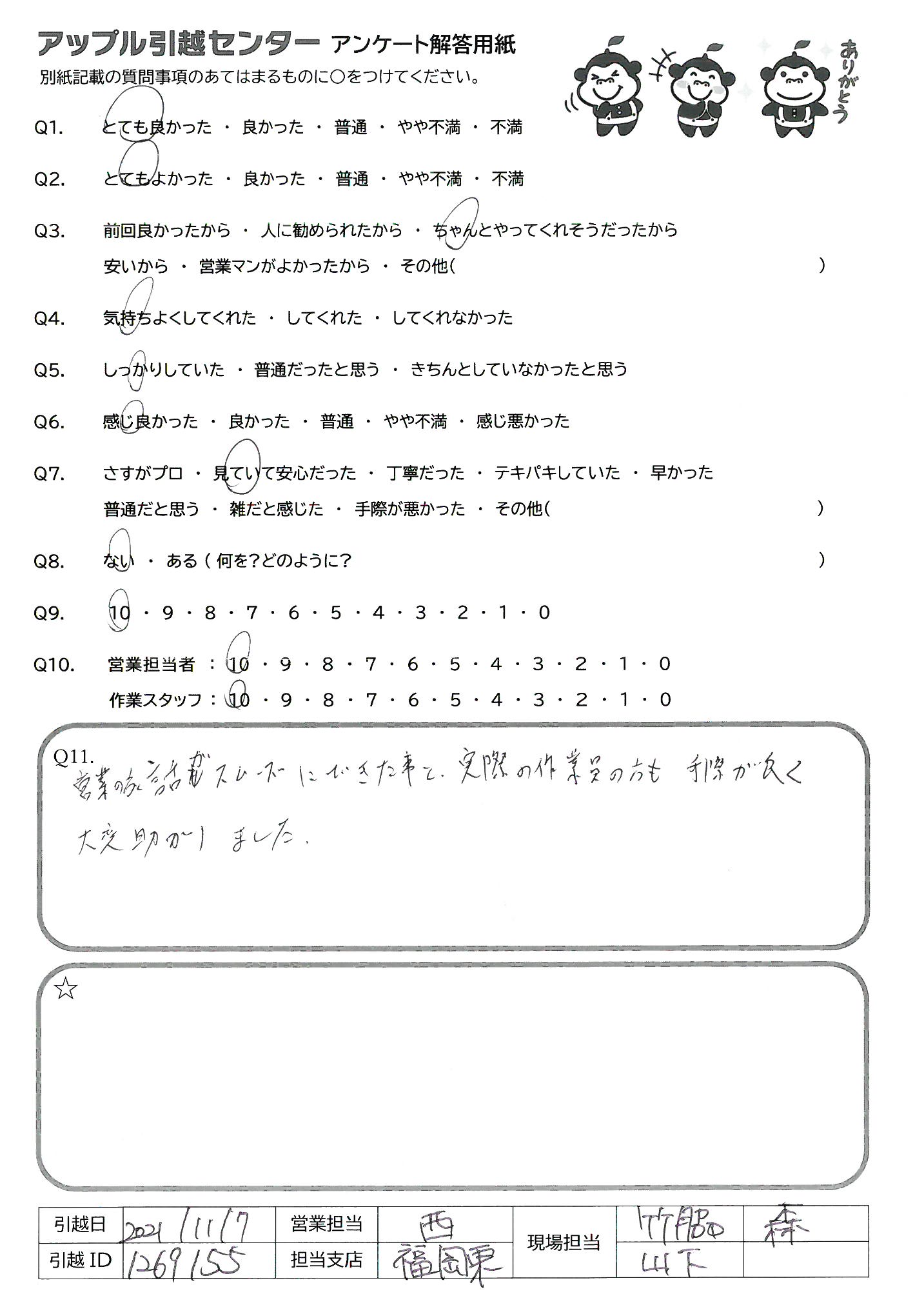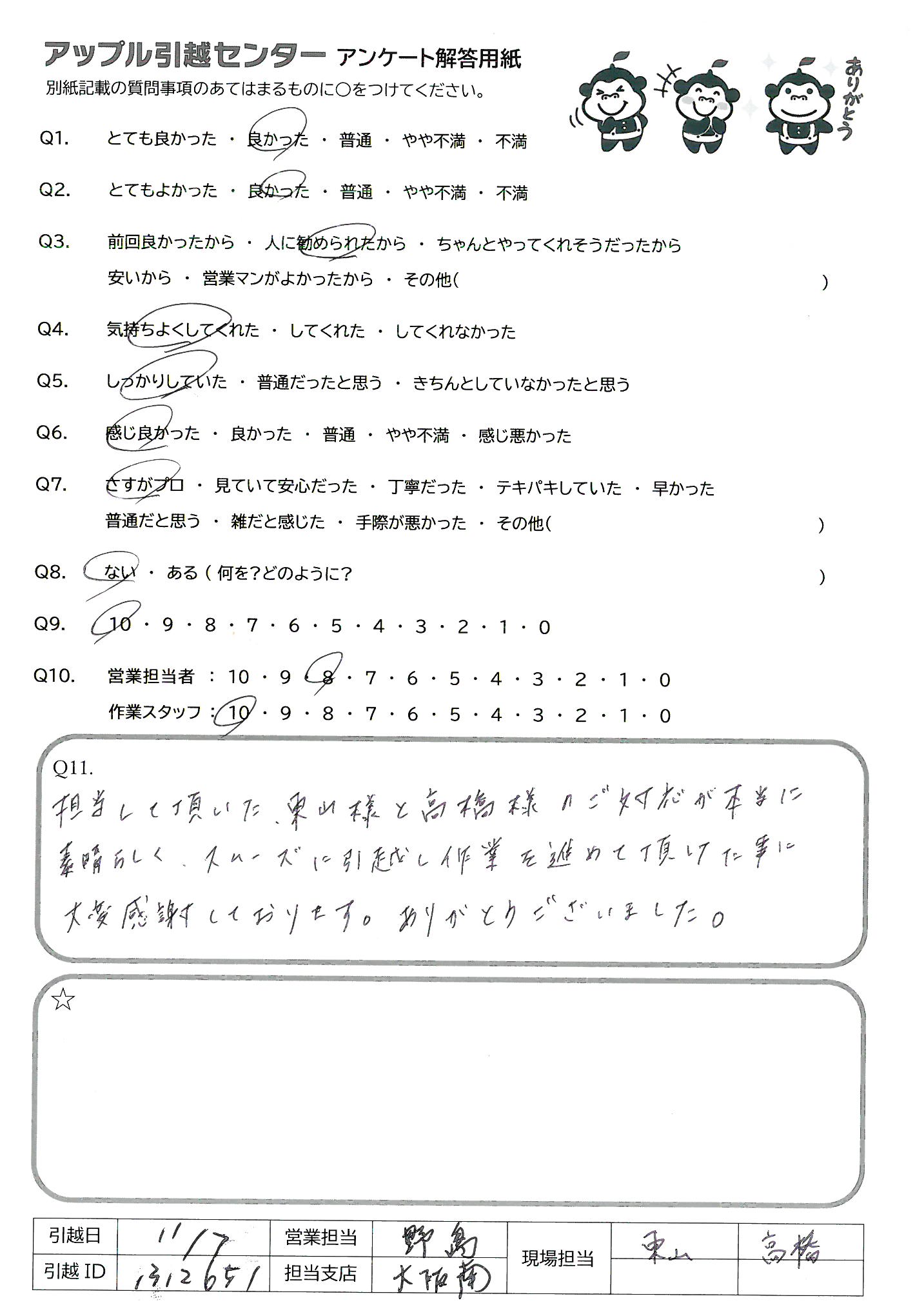A.担当して頂いた東山様と高橋様のご対応が本当に素晴らしく、スムーズに引越し作業を進めて頂けたことに大変感謝しております。ありがとうございました。