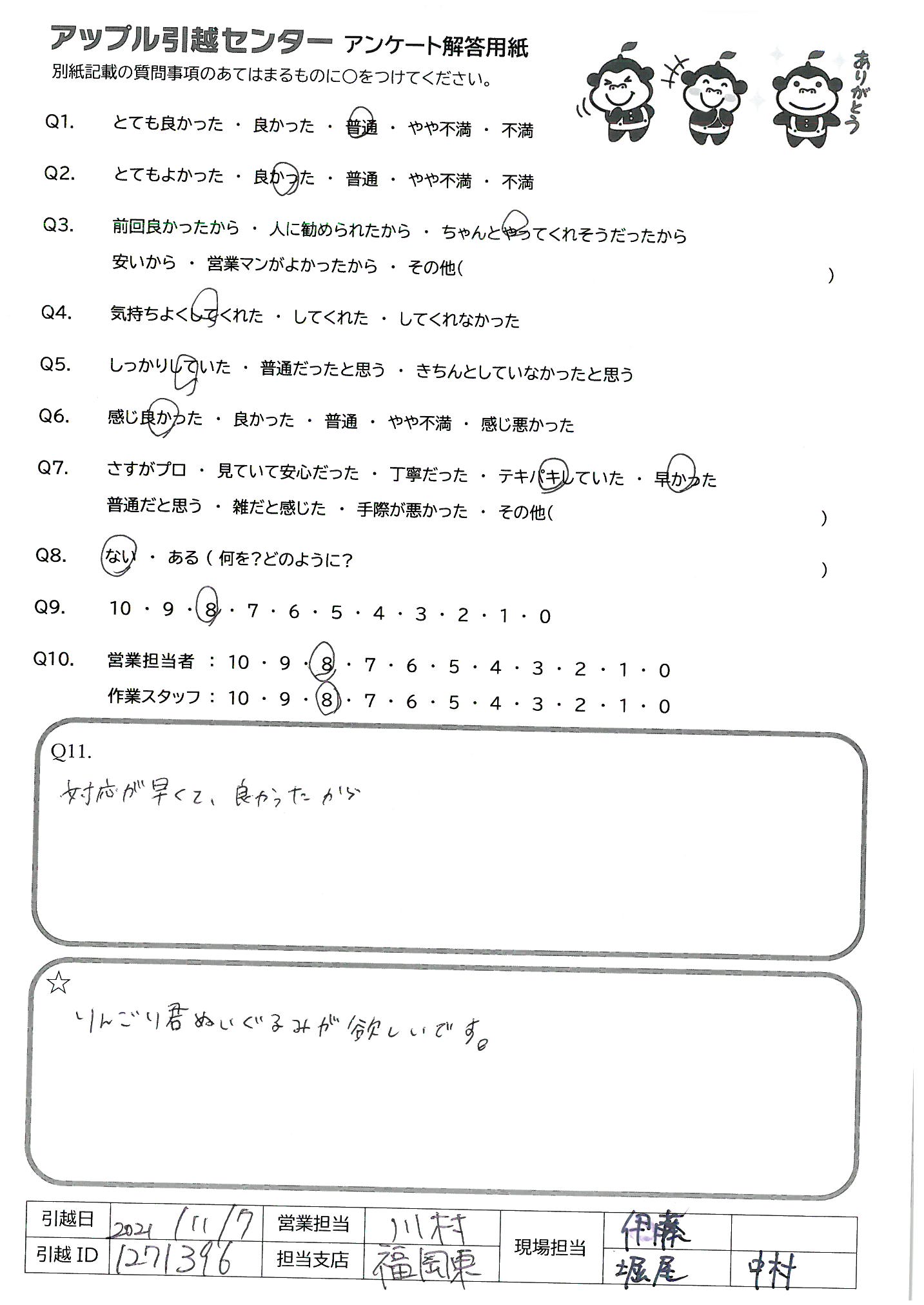 A.現場の作業は本当に迅速で丁寧で、社員の方はもちろん一番お若いアルバイトと思われる方も「他にやることはありますか」とお声がけしてくださり、本当にありがたかったです。また同じ方にお願いしたいと皆で話しておりました。ありがとうございました。