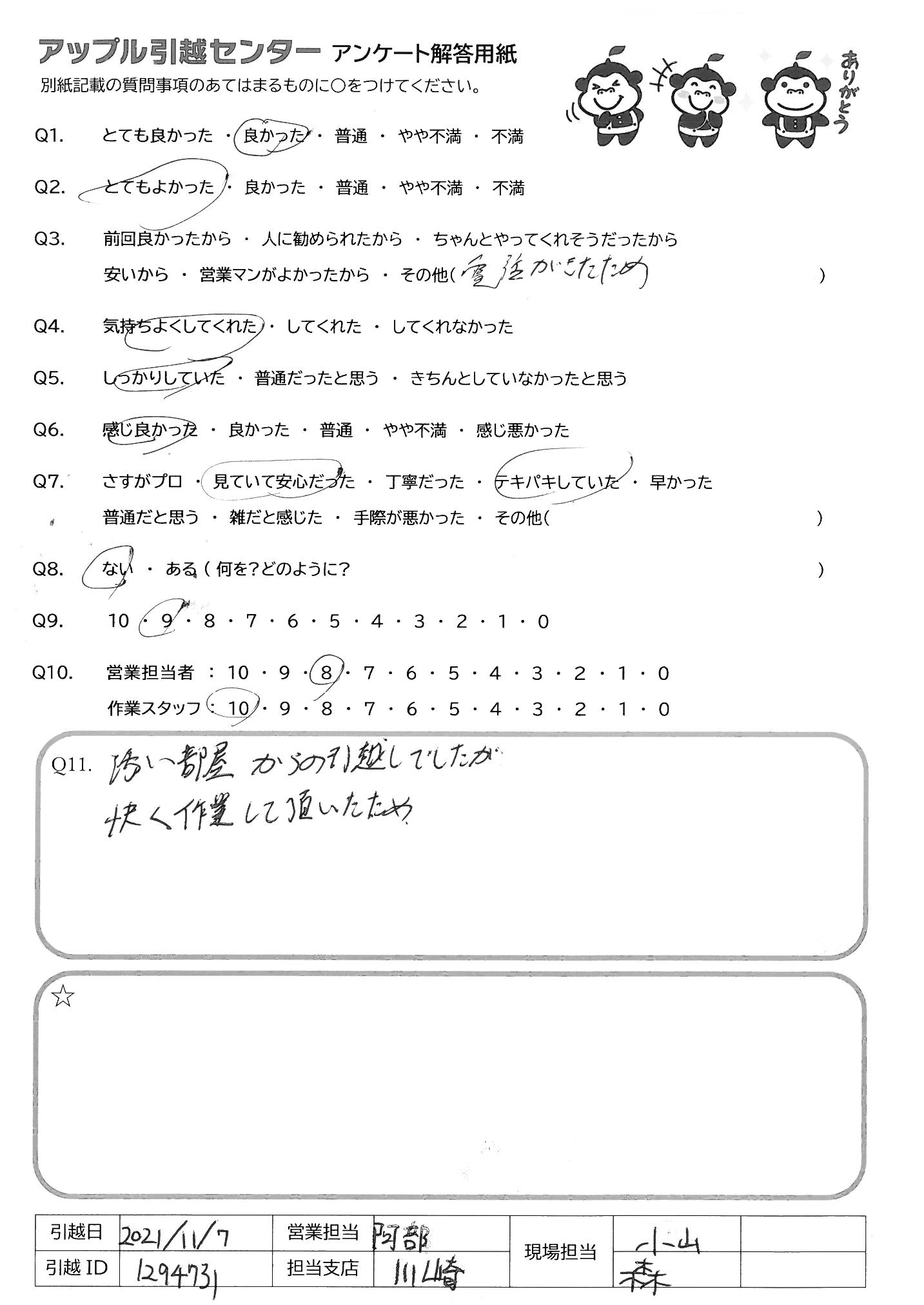 A.初めての引っ越しでしたが、対応含め安心してお任せすることができました。 次の引っ越しのときもお願いしたいと思っています。 ありがとうございました。