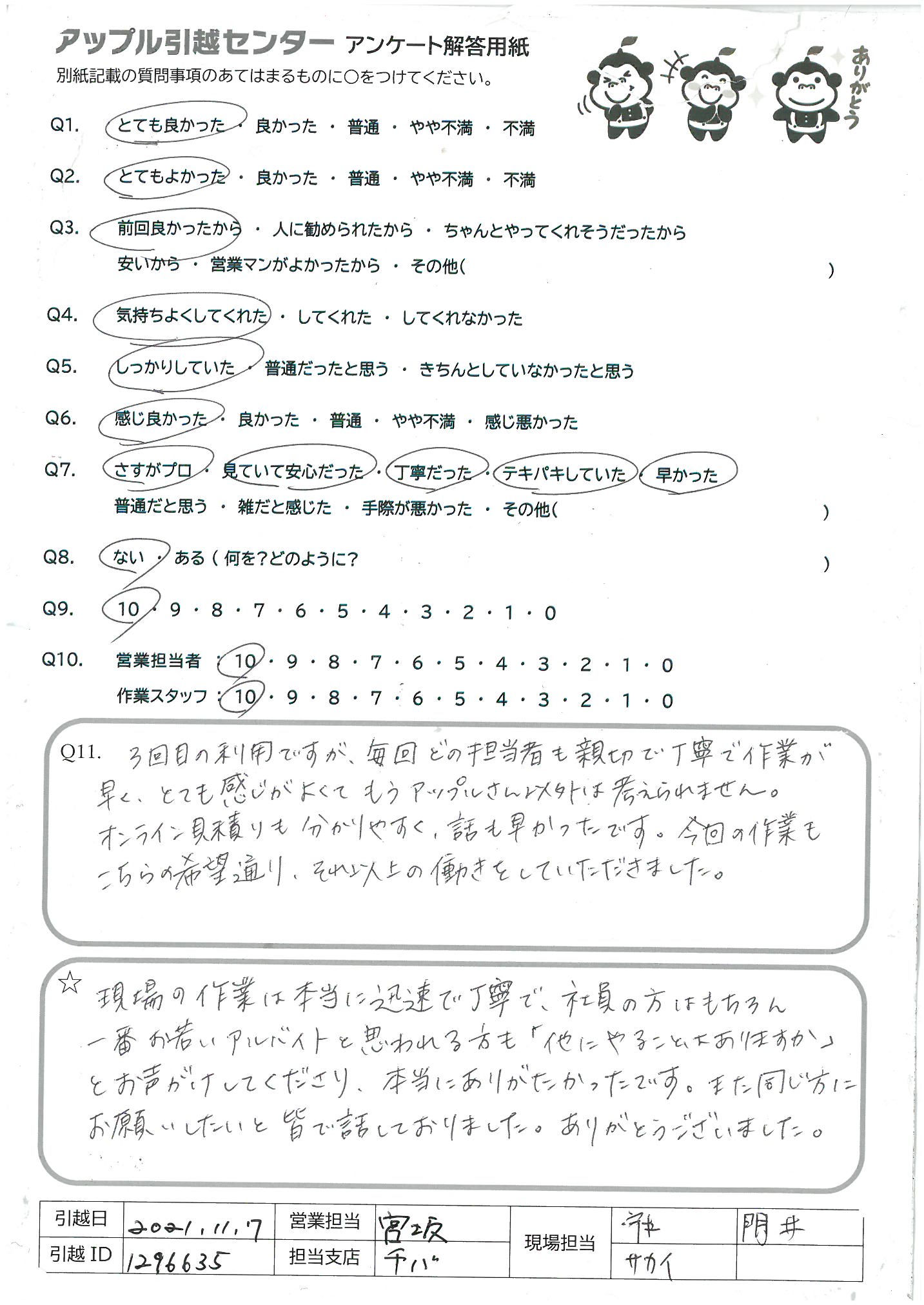引越し日:2021年11月07日 エリア:千葉県市川市