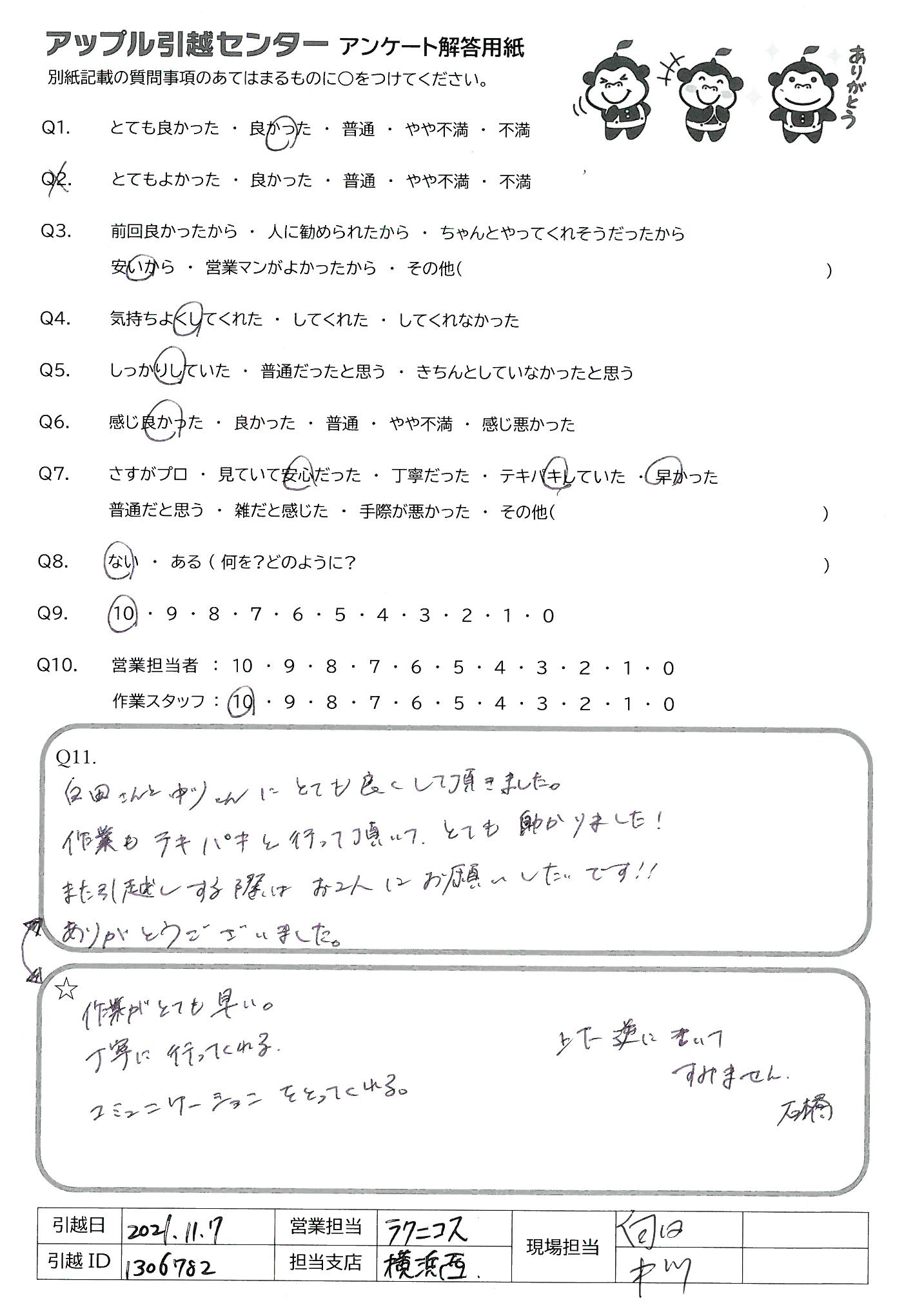 引越し日:2021年11月07日 エリア:神奈川県横浜市旭区