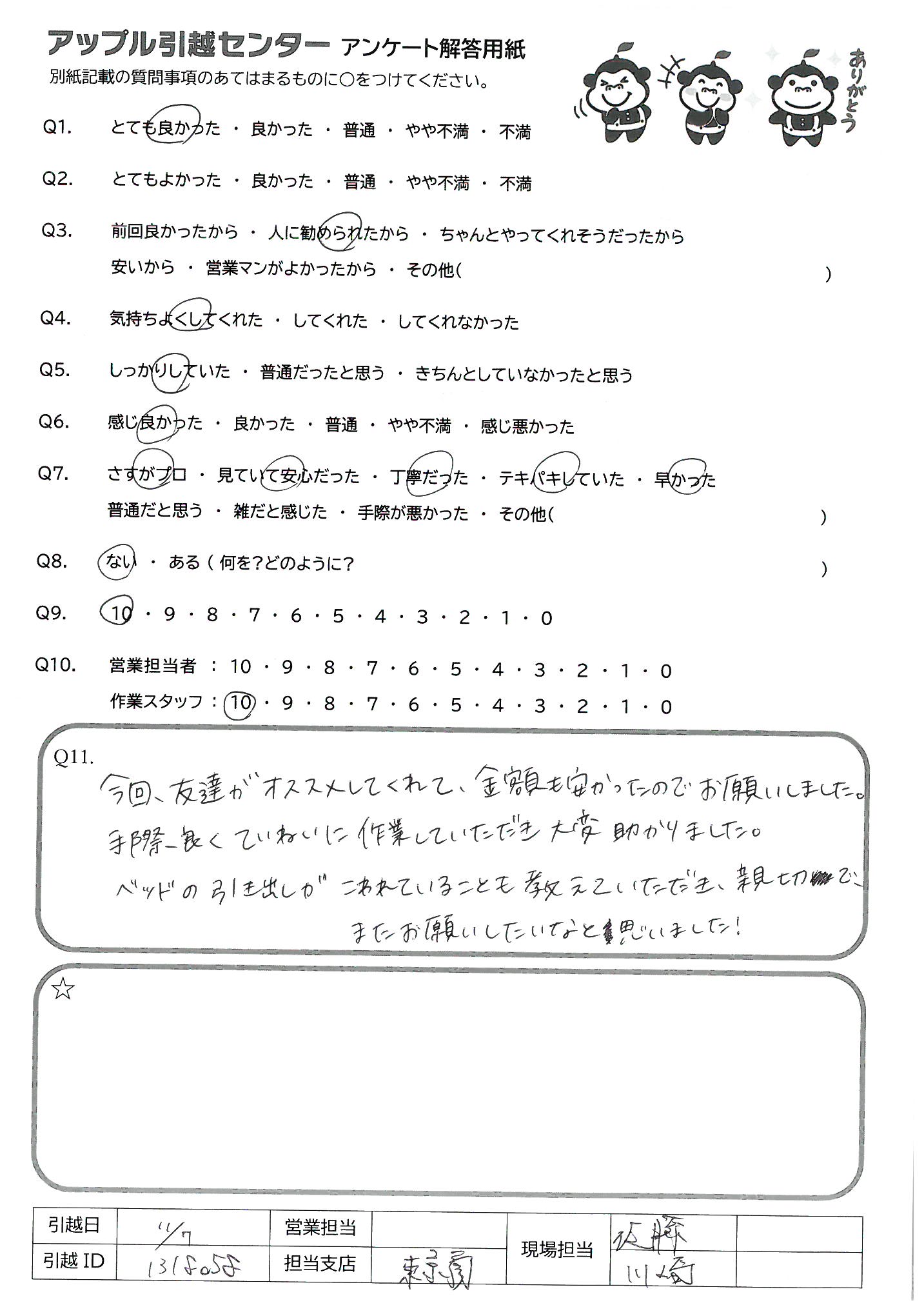 A.今回、友達がオススメしてくれて、金額も安かったのでお願いしました。 手際良くていねいに作業していただき大変助かりました。 ベッドの引き出しがこわれていることも教えていただき、親切でまたお願いしたいなと思いました!