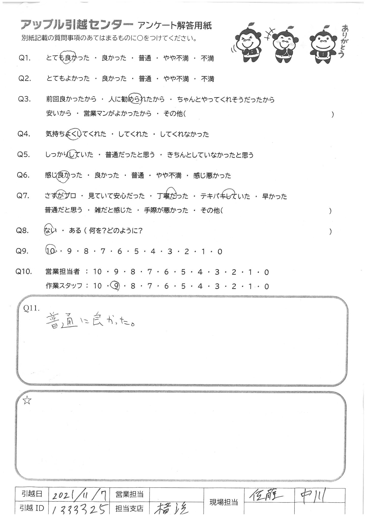 引越し日:2021年11月07日 エリア:神奈川県横浜市港北区