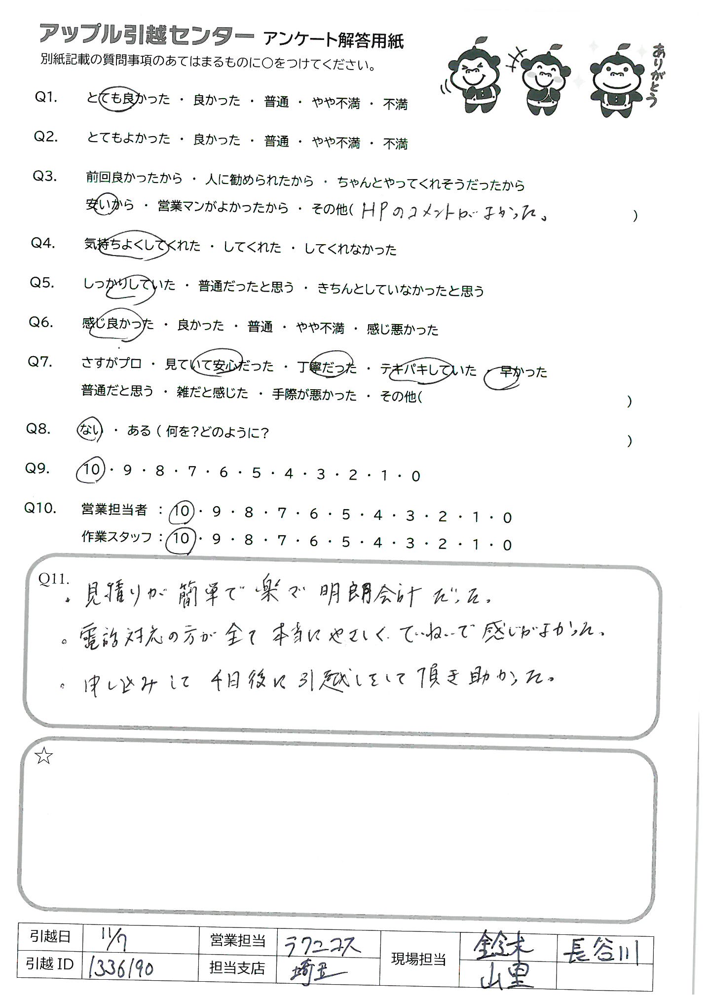 A.・見積りが簡単で楽で明朗会計だった。 ・電話対応の方が全て本当にやさしくていねいで感じがよかった。 ・申し込みして4日後に引越しをして頂き助かった。