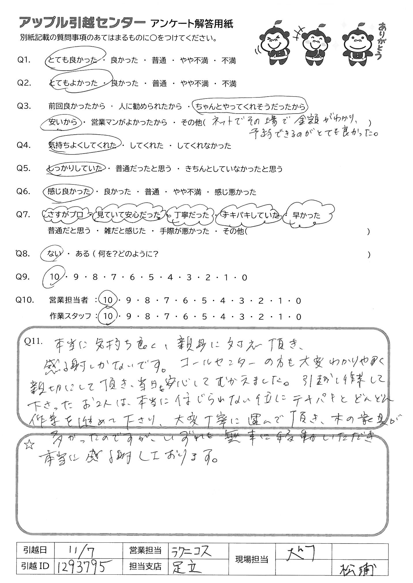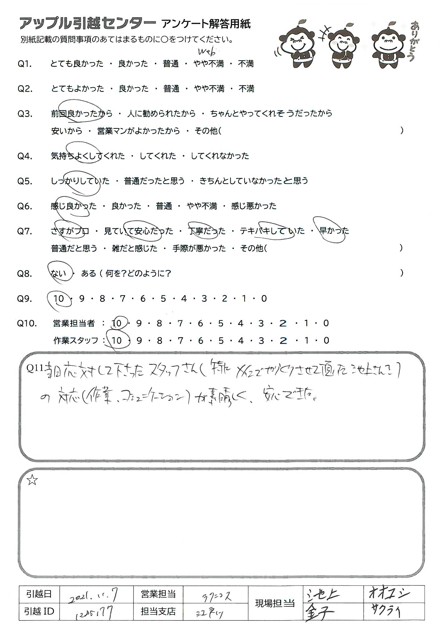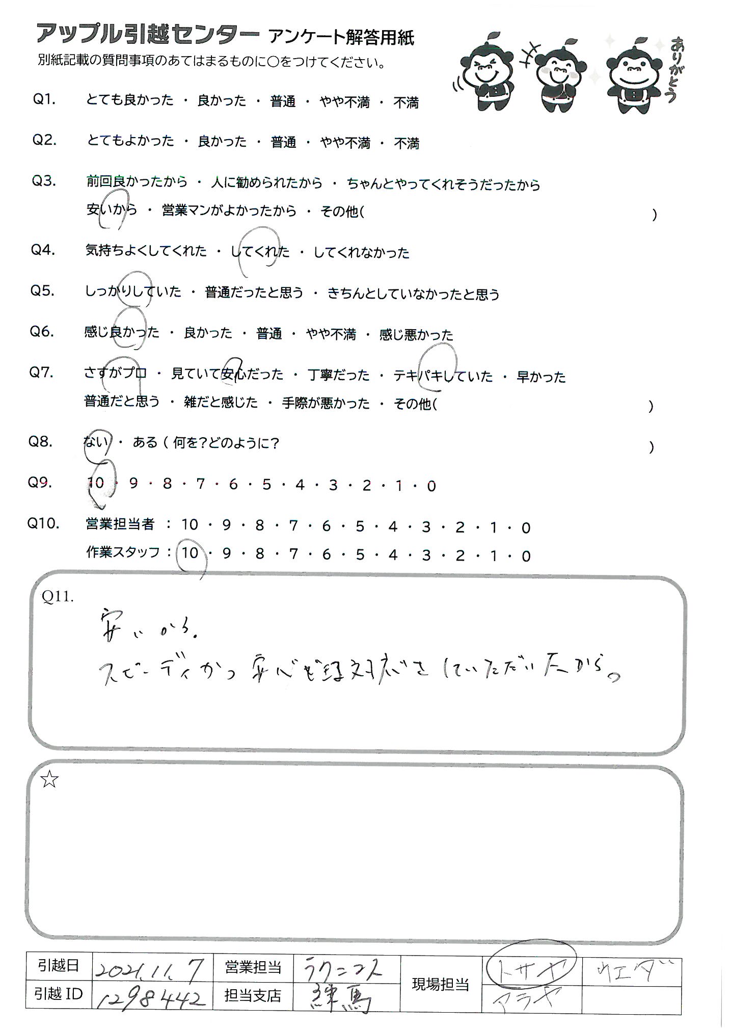 A.今度また、引越しの際は迷わずアップルさんに依頼します。アークの見積りの方は「ネームバリューが」とか訳の分からん事を並べたてていたのでお断りして正解でした。