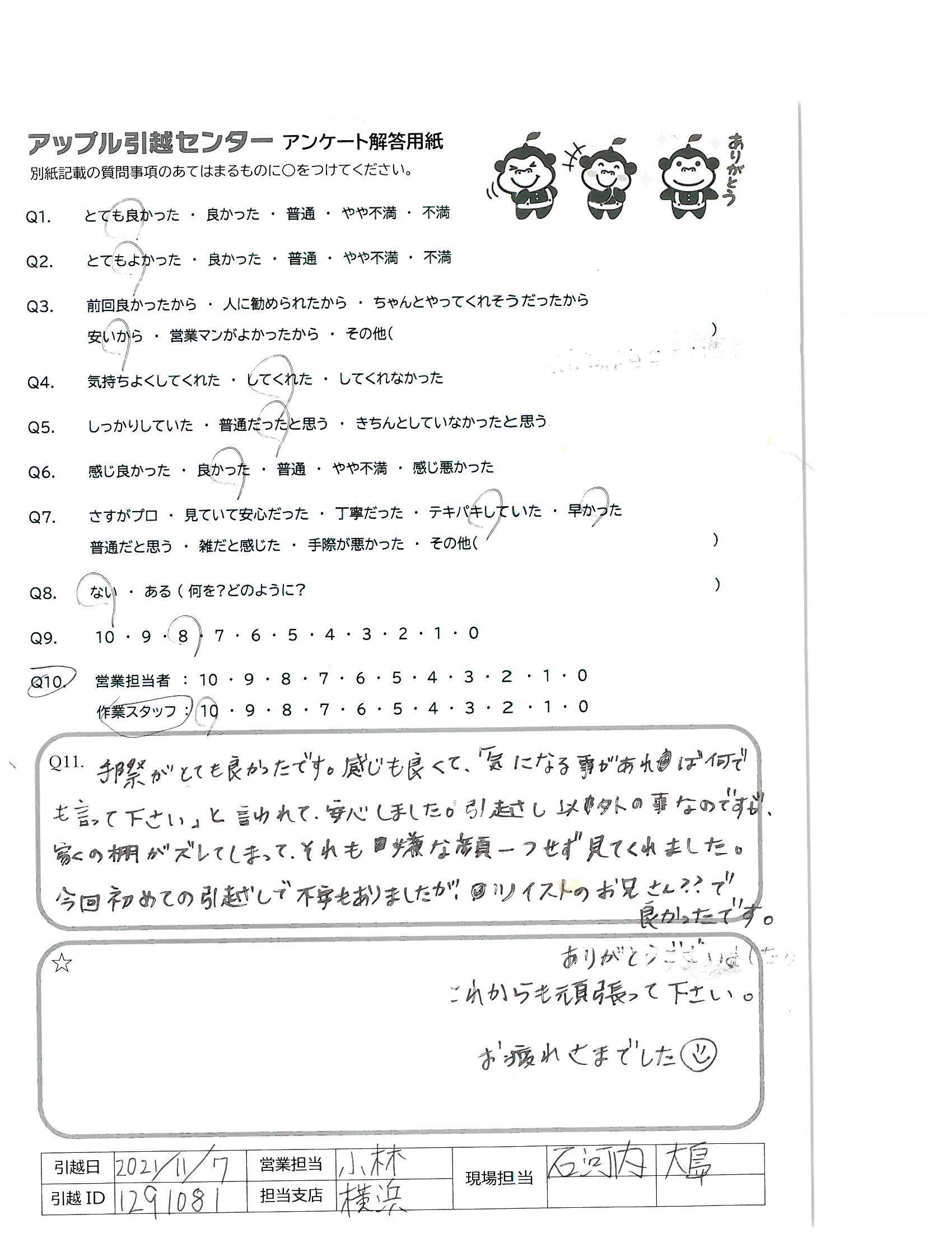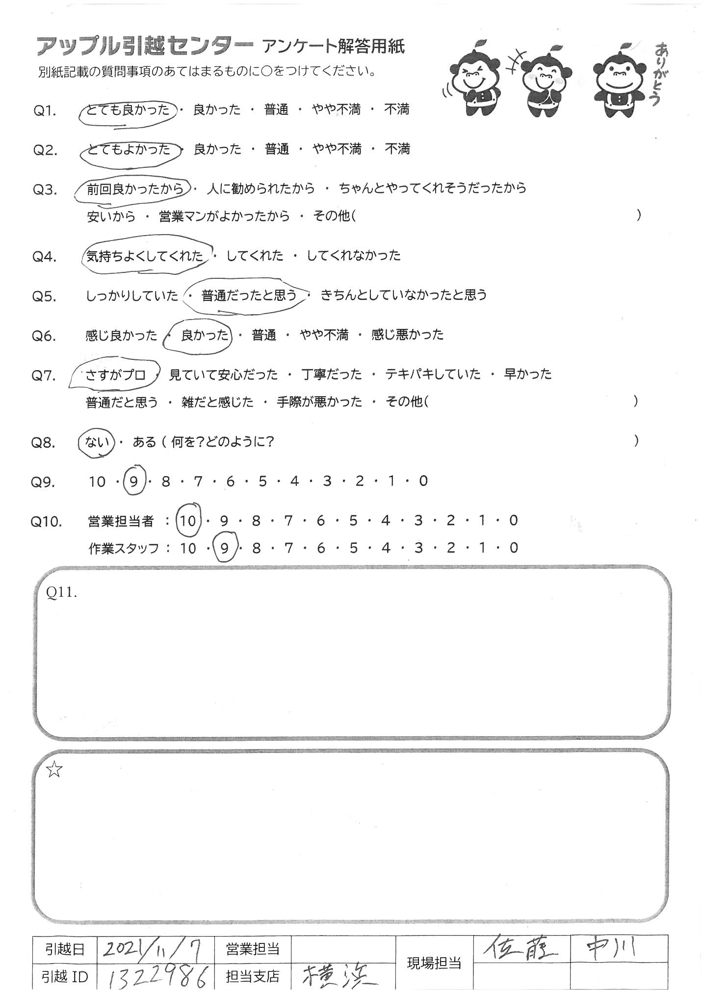 引越し日:2021年11月07日 エリア:神奈川県横浜市鶴見区