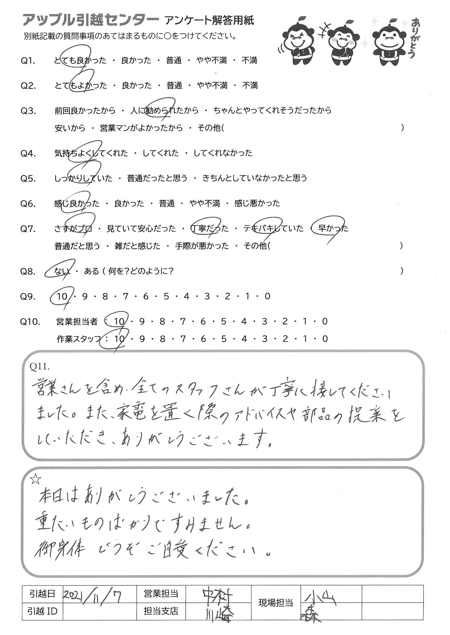 引越し日:2021年11月07日 エリア:神奈川県相模原市中央区