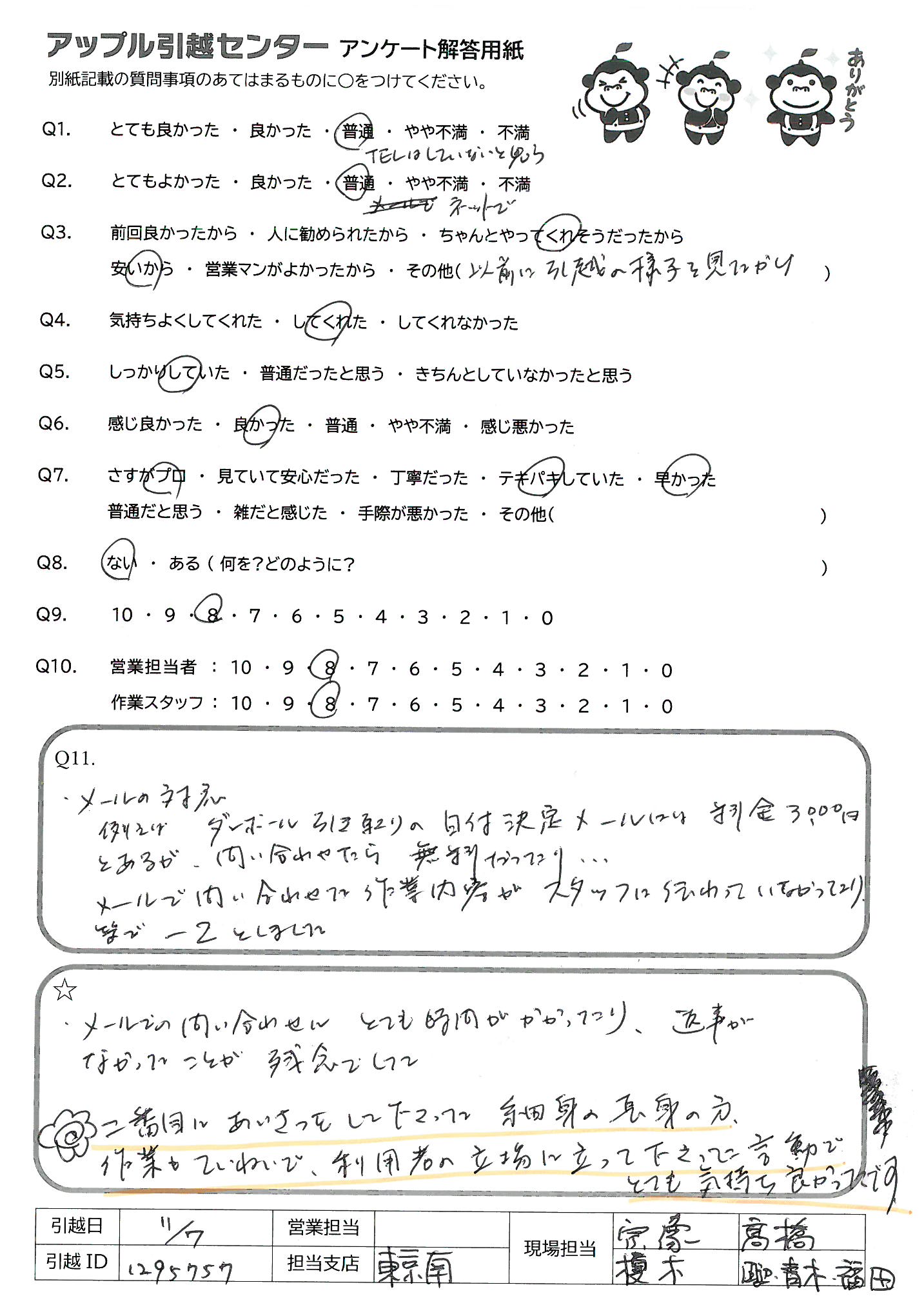 A.メールでの問い合わせにとても時間がかかったり、返事がなかったことが残念でした。 二番目にあいさつをして下さった細身の長身の方、作業もていねいで、利用者の立場に立って下さった言動がとても気持ち良かったです。