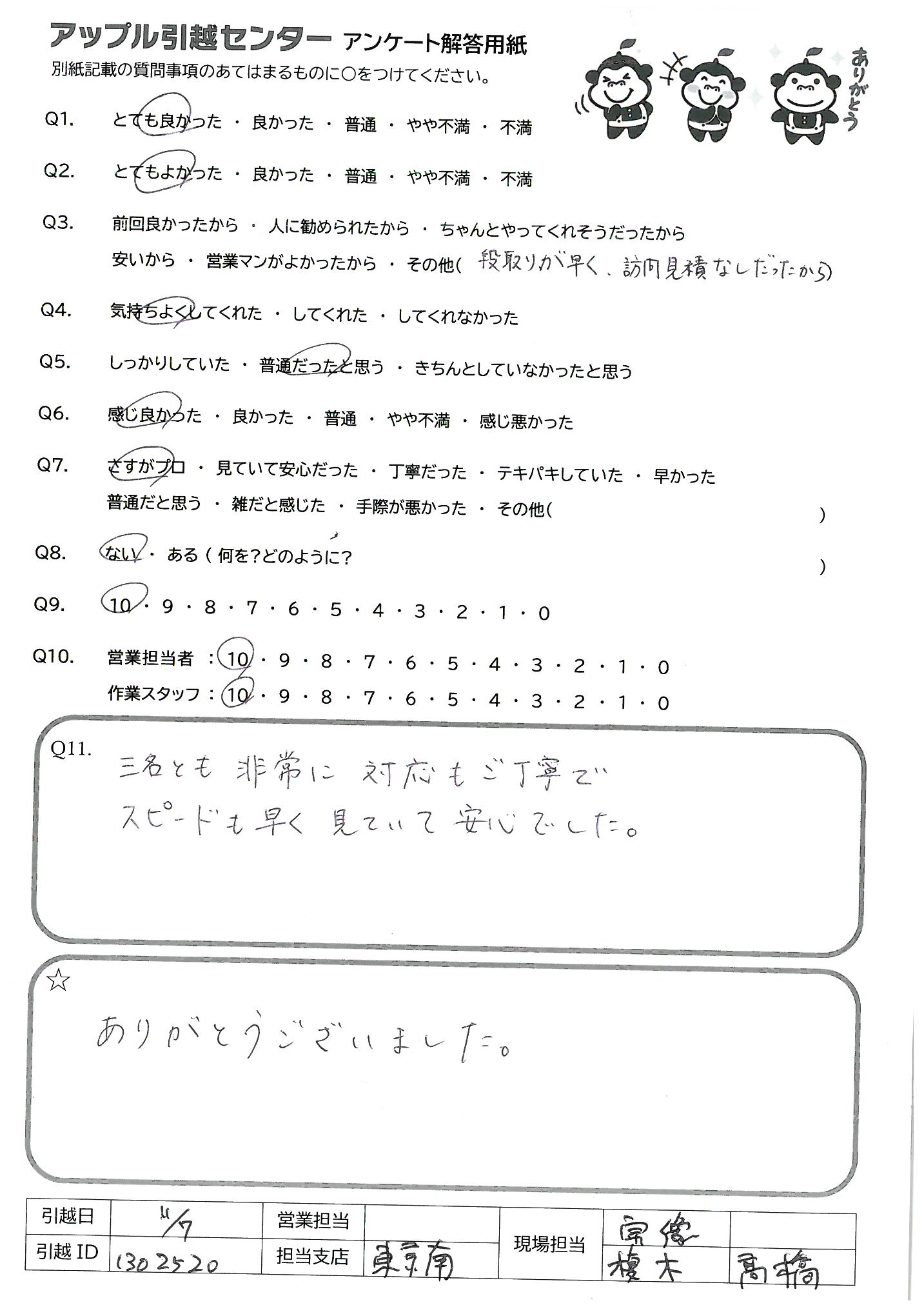 A.初めての1人の引っ越しでしたが、手際良く作業していただけて感謝しています。 友だちにも早速おすすめしました。 また、次の引っ越し時にもお願いをしたいと思っています。 ありがとうございました。