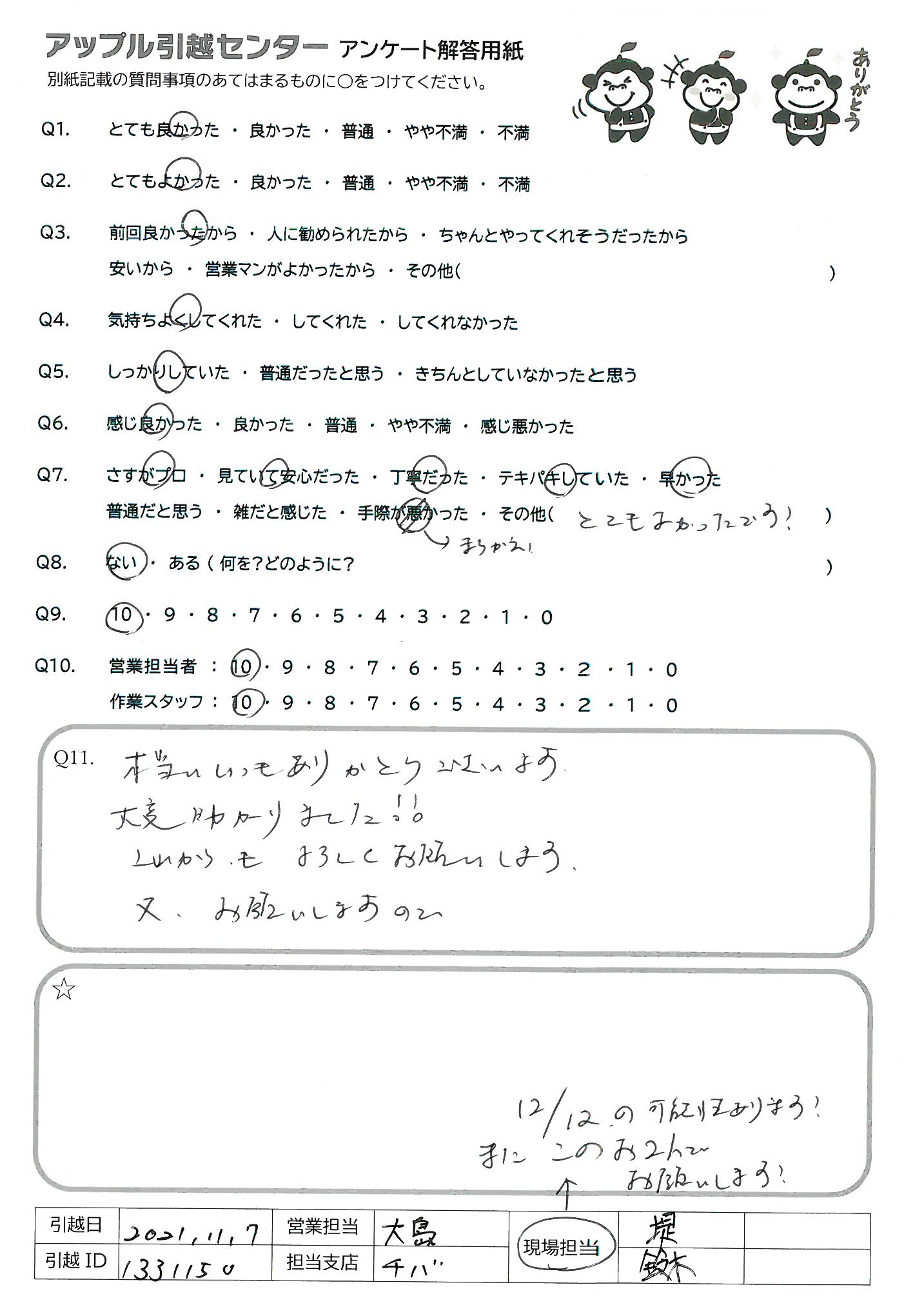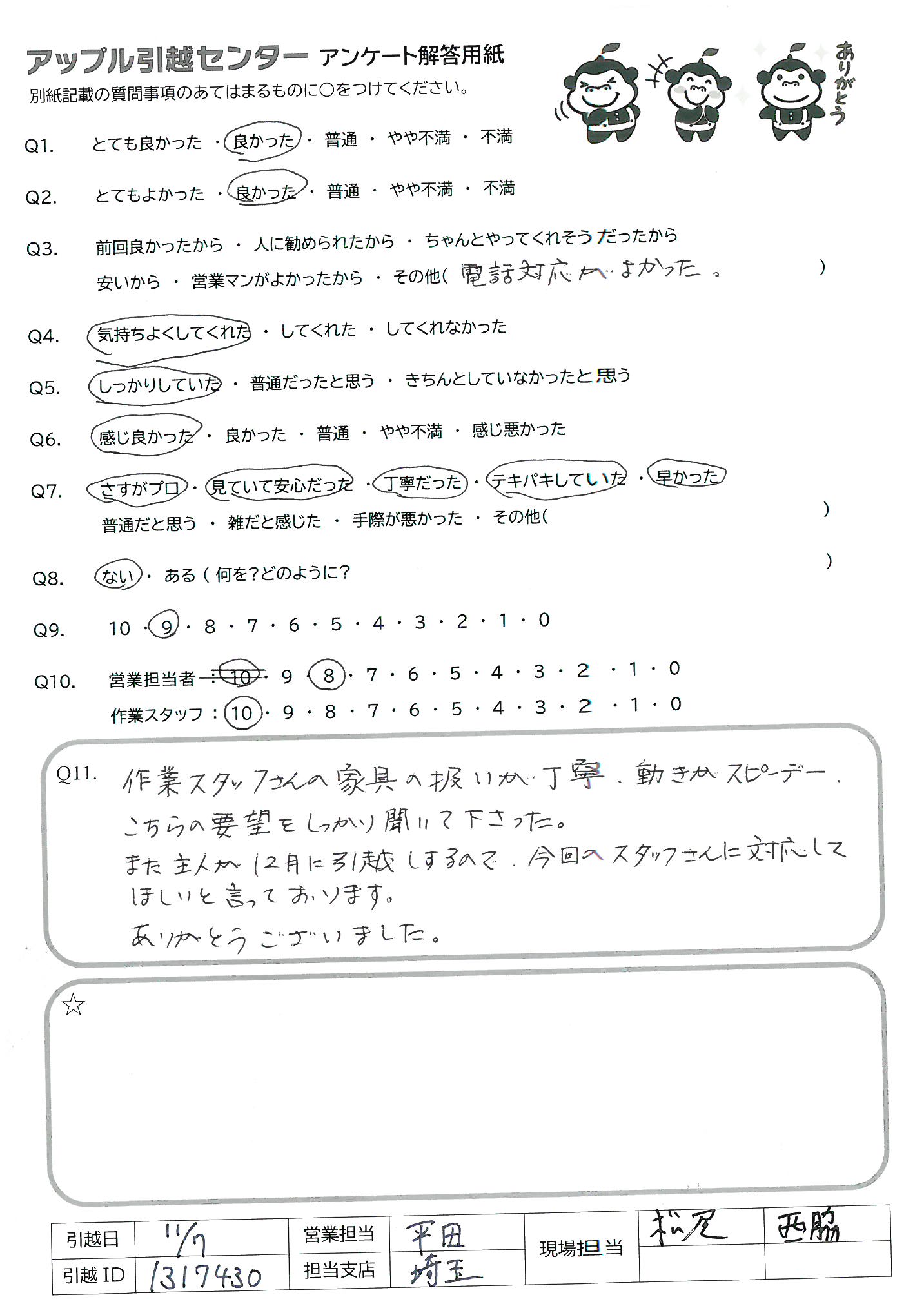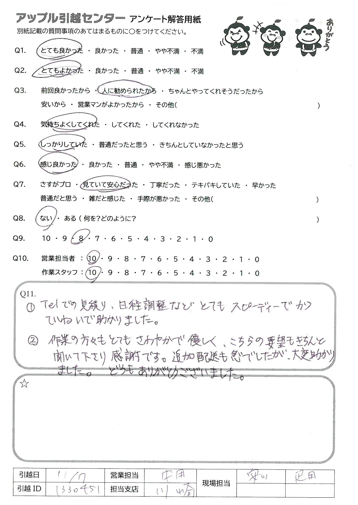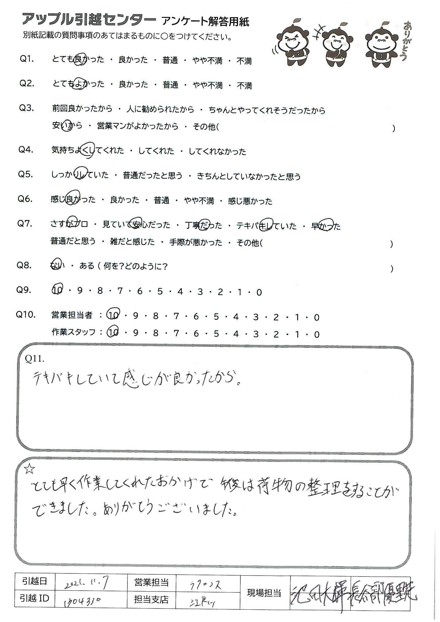 A.作業スタッフさんの家具の扱いが、丁寧。動きがスピーデー こちらの要望をしっかり聞いて下さった。 また主人が12月に引越しするので、今回のスタッフさんい対応してほしいと言っております。 ありがとうございました。