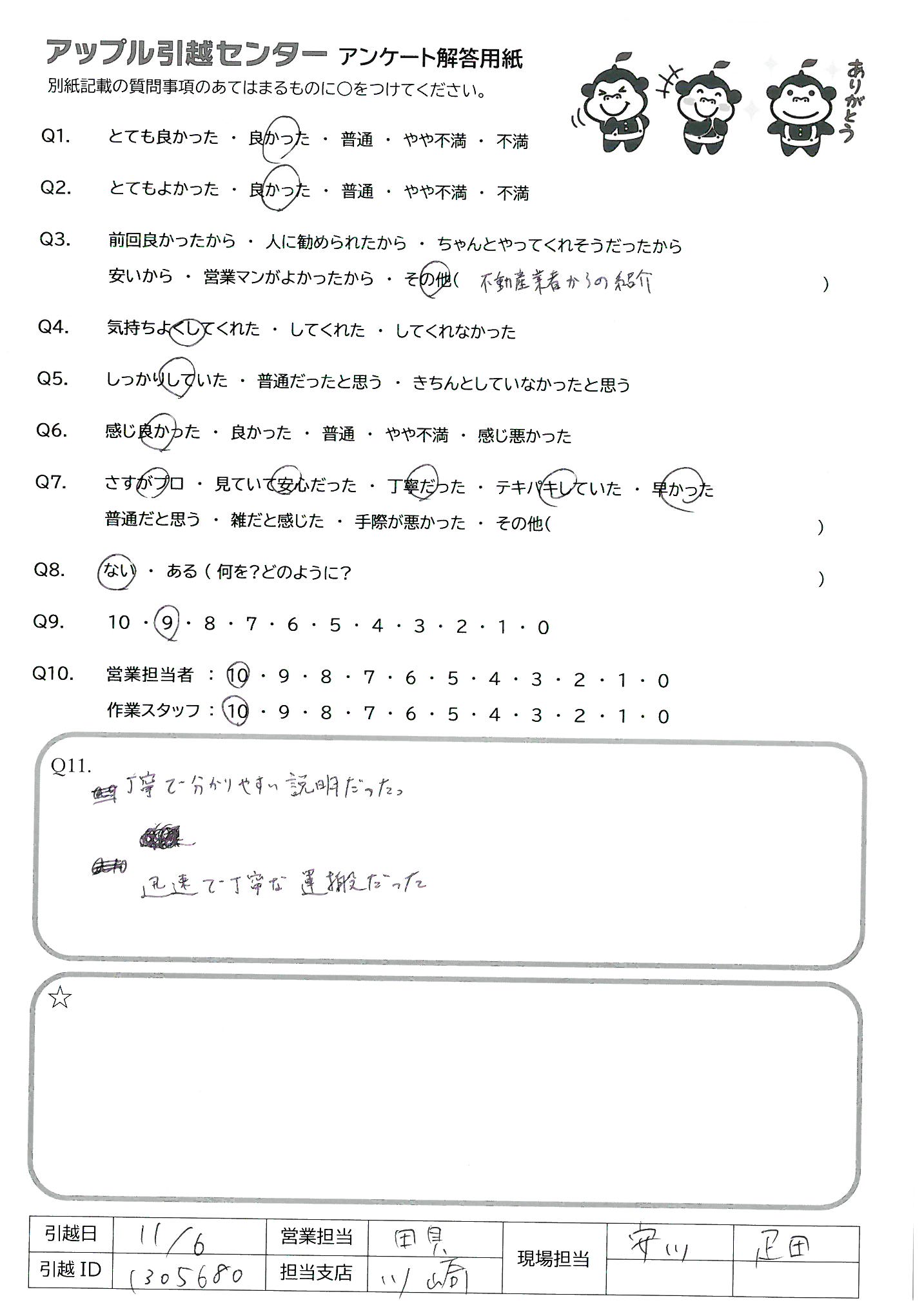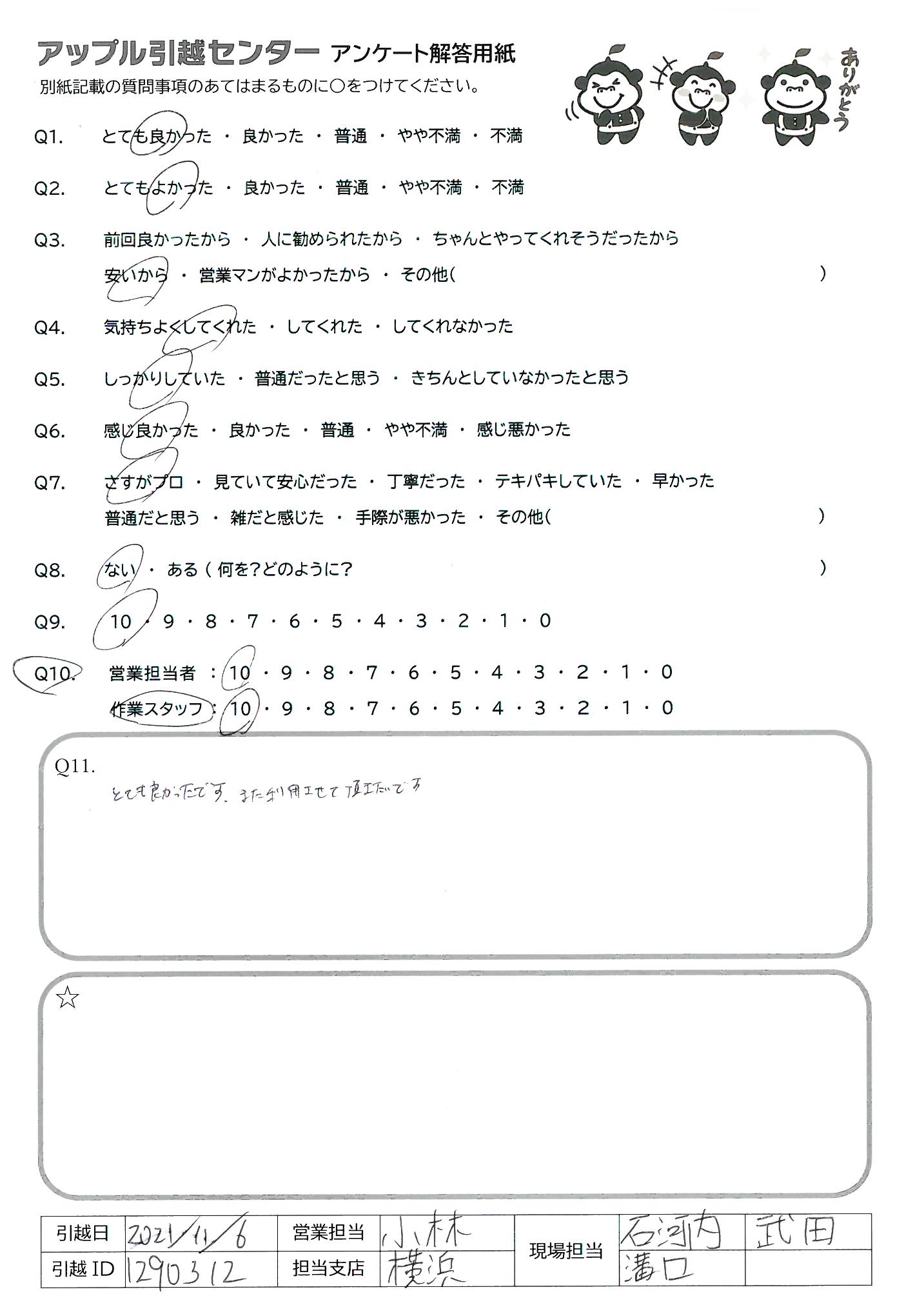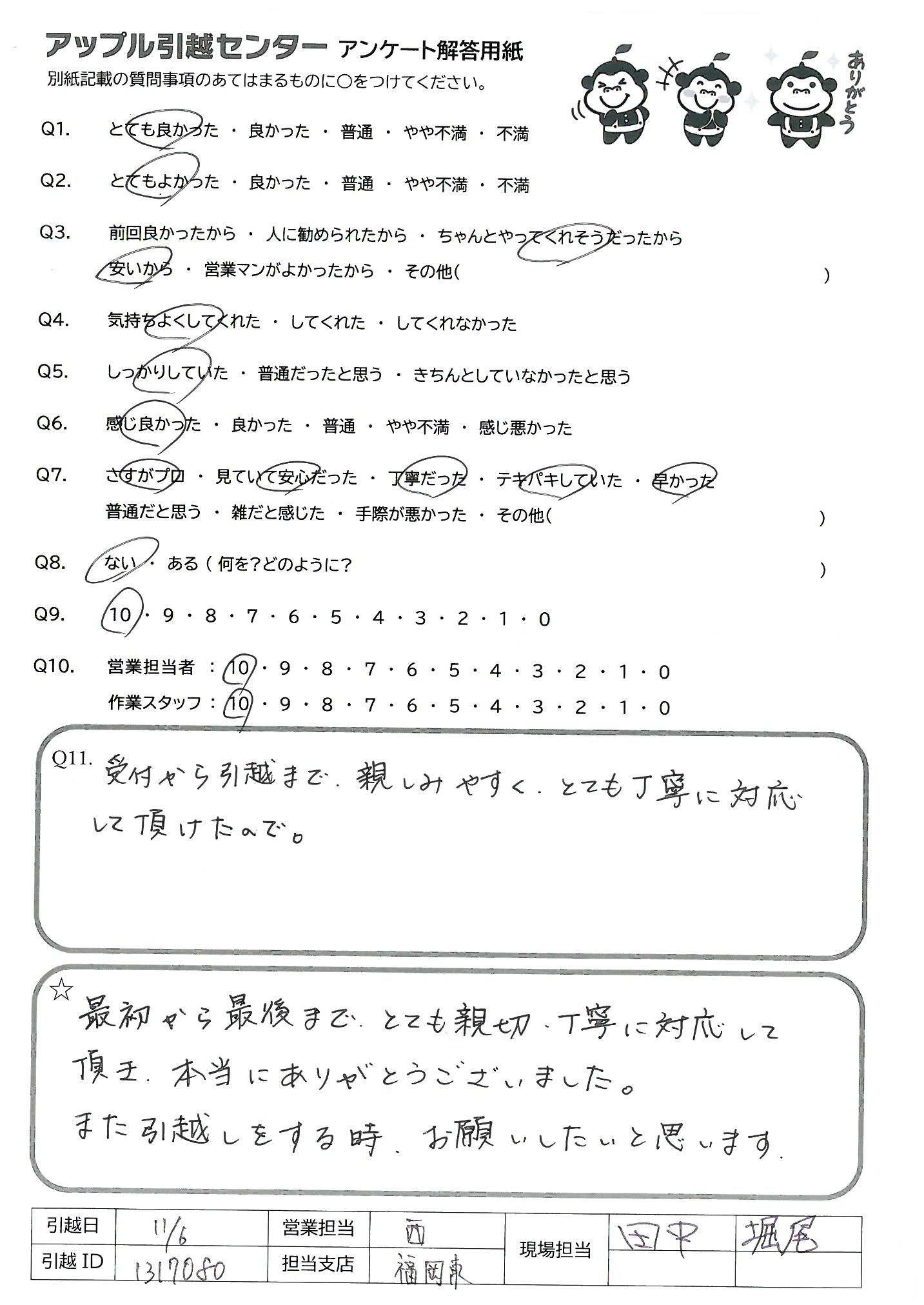 A.最初から最後までとても親切・丁寧に対応して頂き、本当にありがとうございました。 また引越しをする時、お願いしたいと思います。