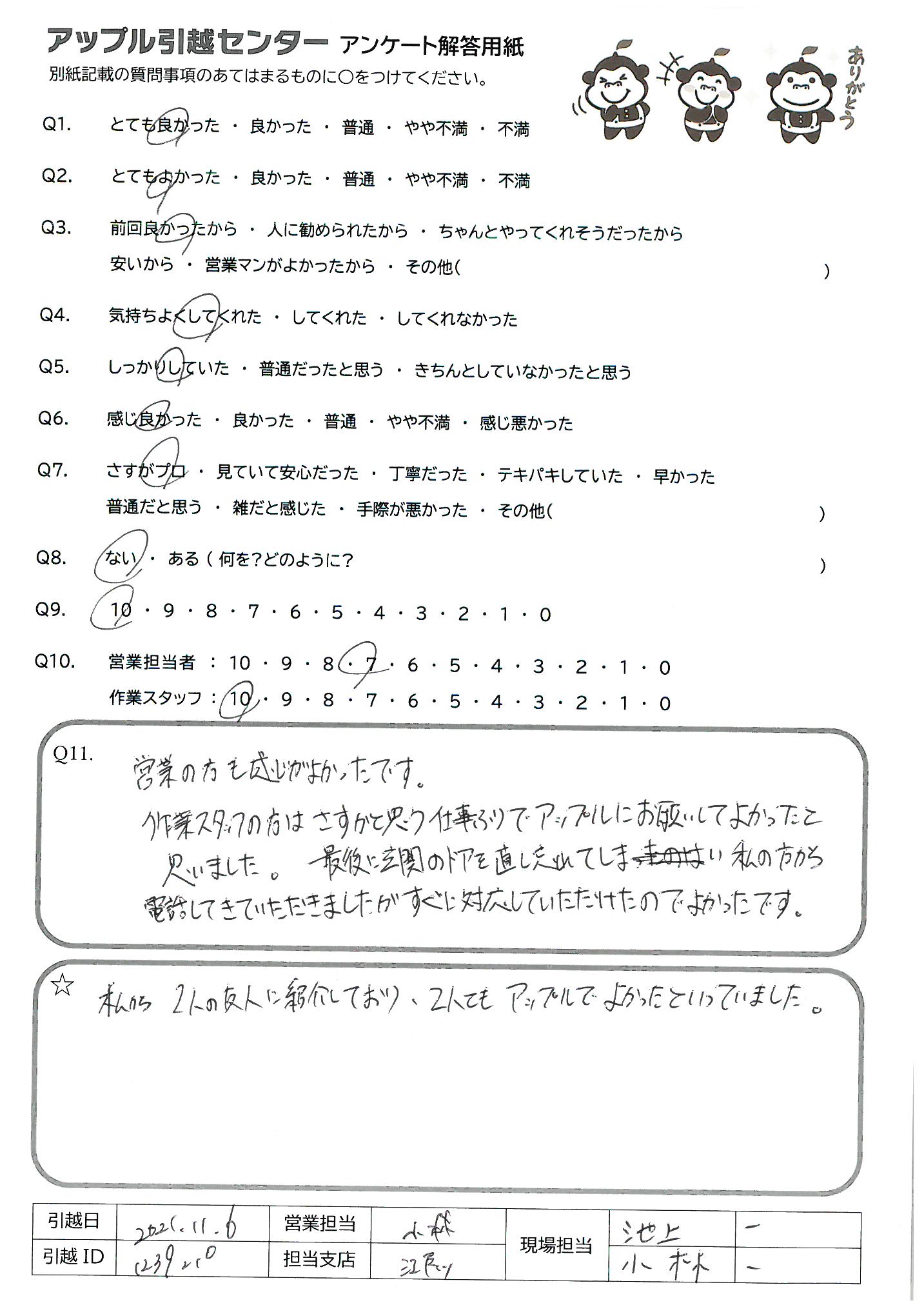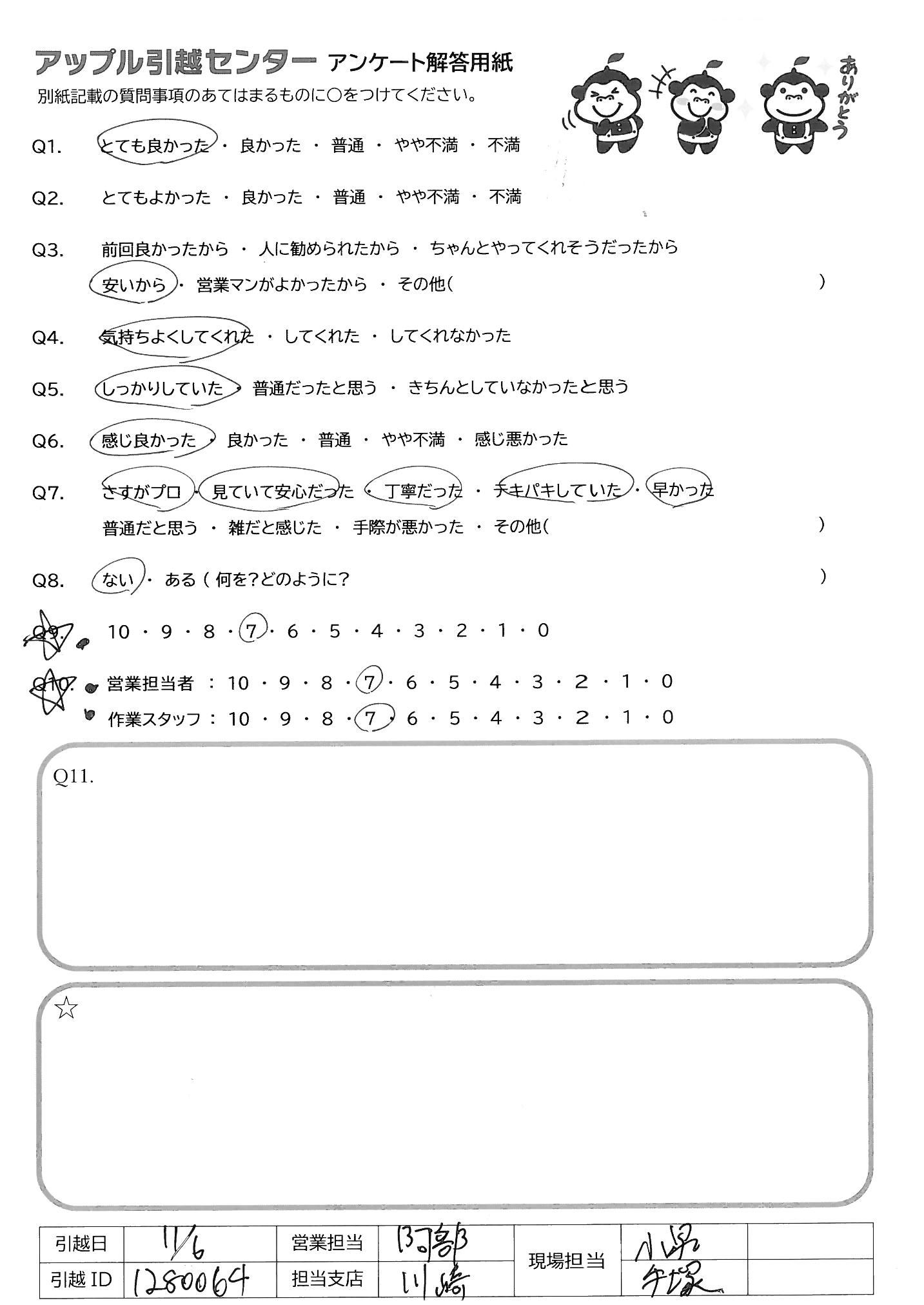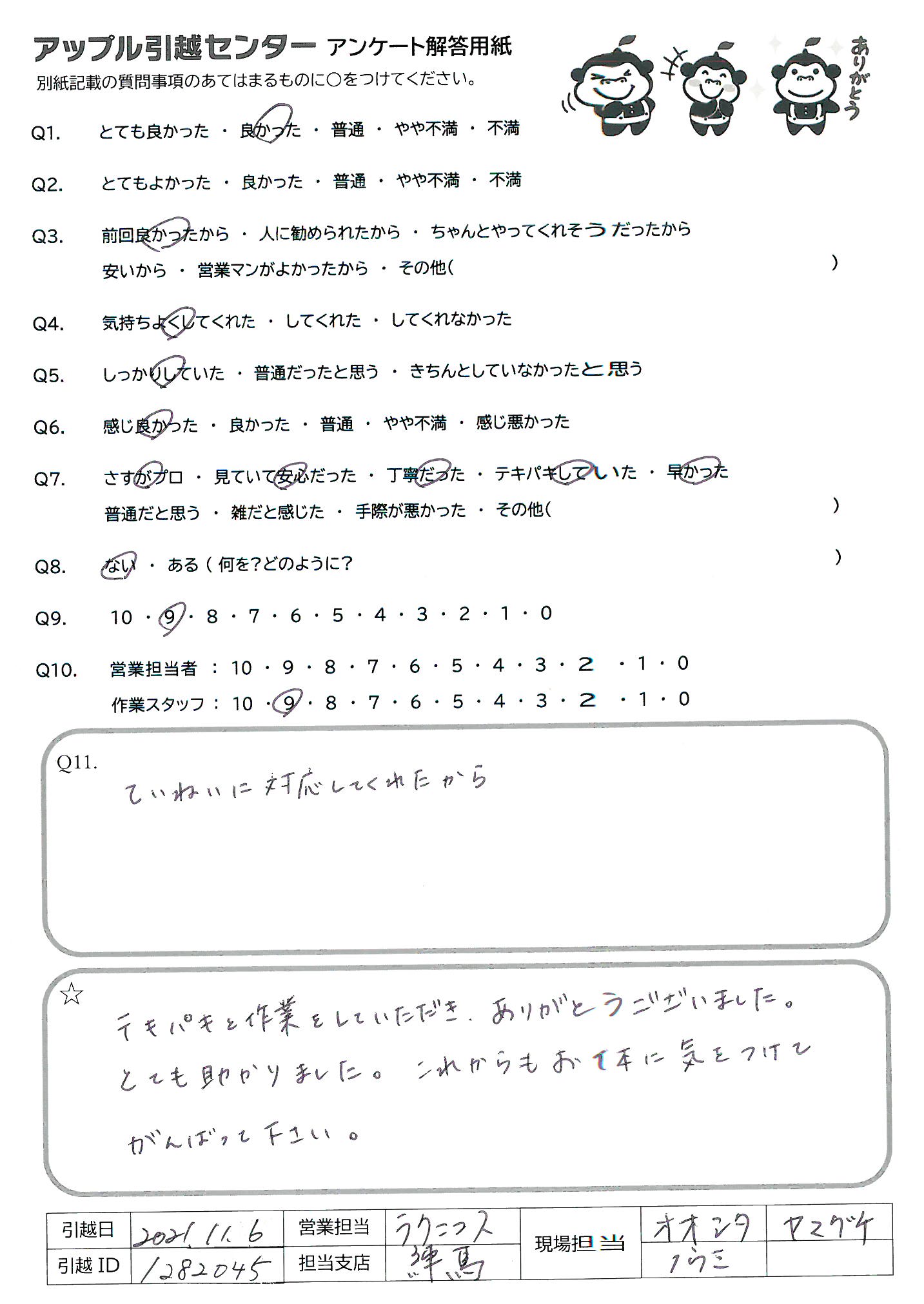 A.最初から最後までとても親切・丁寧に対応して頂き、本当にありがとうございました。 また引越しをする時、お願いしたいと思います。
