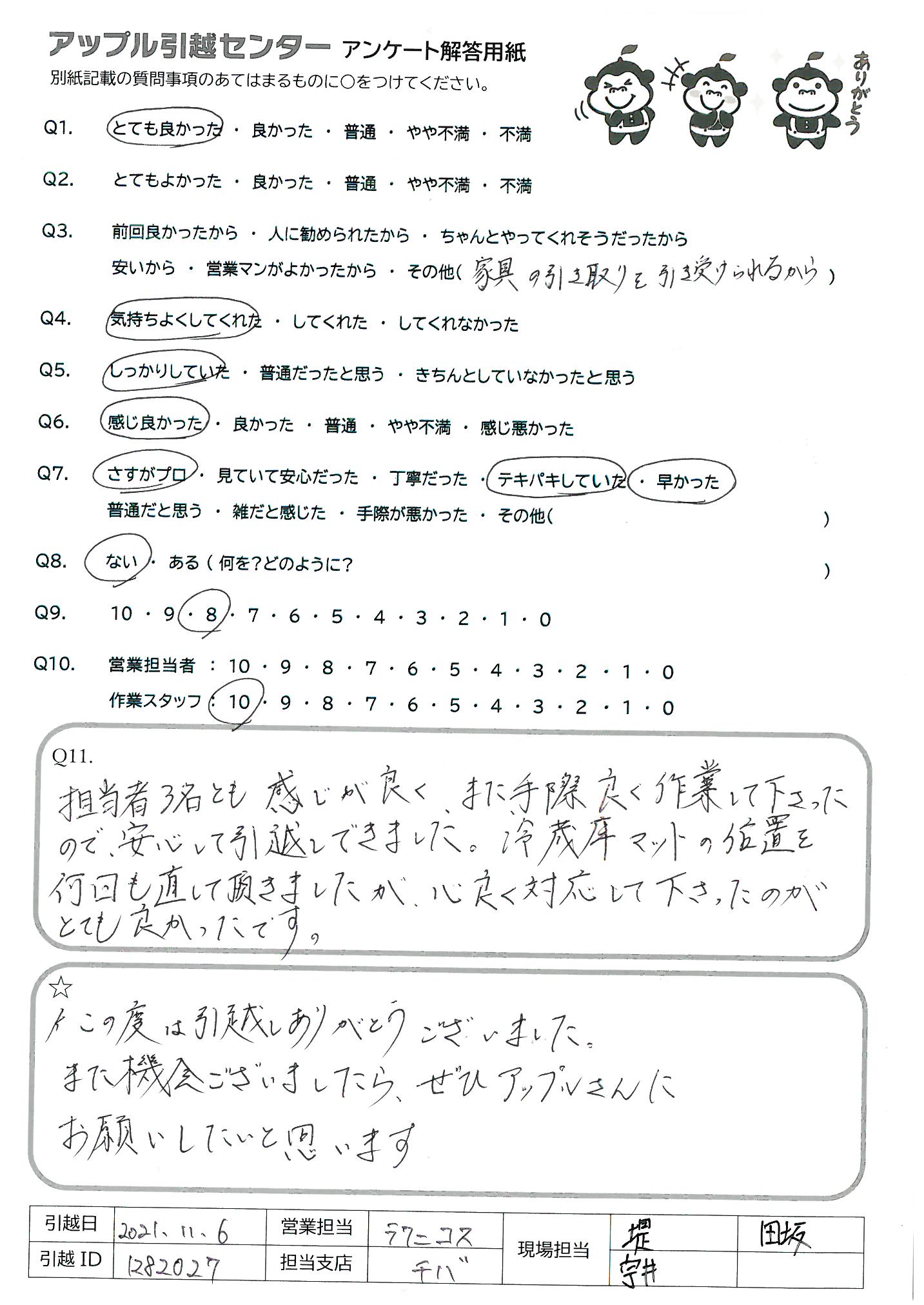 A.担当者3名とも感じが良く、また手際良く作業して下さったので、安心して引越しできました。冷蔵庫マットの位置を何回も直して頂きましたが、心良く対応して下さったのがとても良かったです。