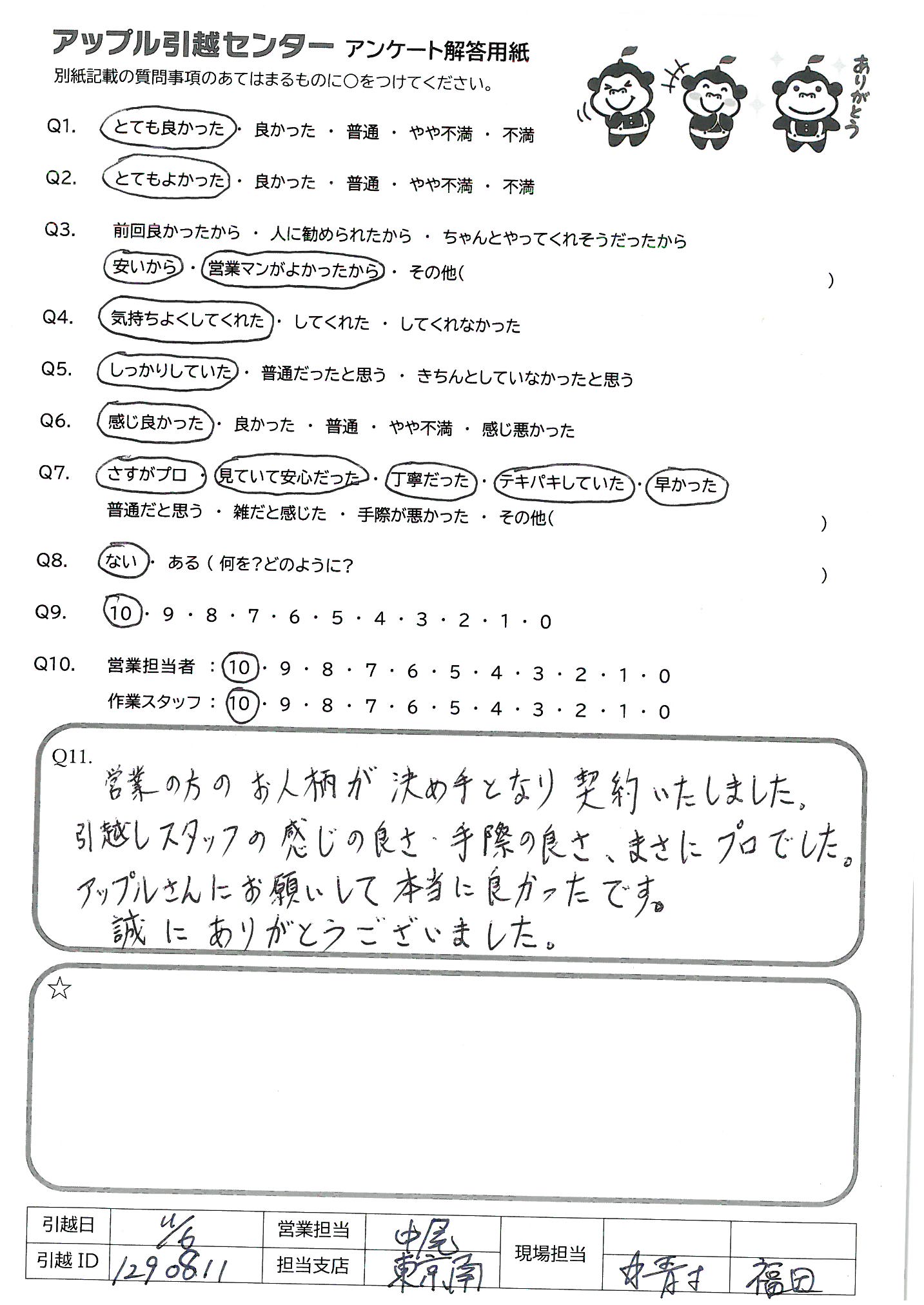 A.営業の方のお人柄が決め手となり契約いたしました。引越しスタッフの感じの良さ、手際の良さ、まさにプロでした。 アップルさんにお願いして本当に良かったです。 誠にありがとうございました。
