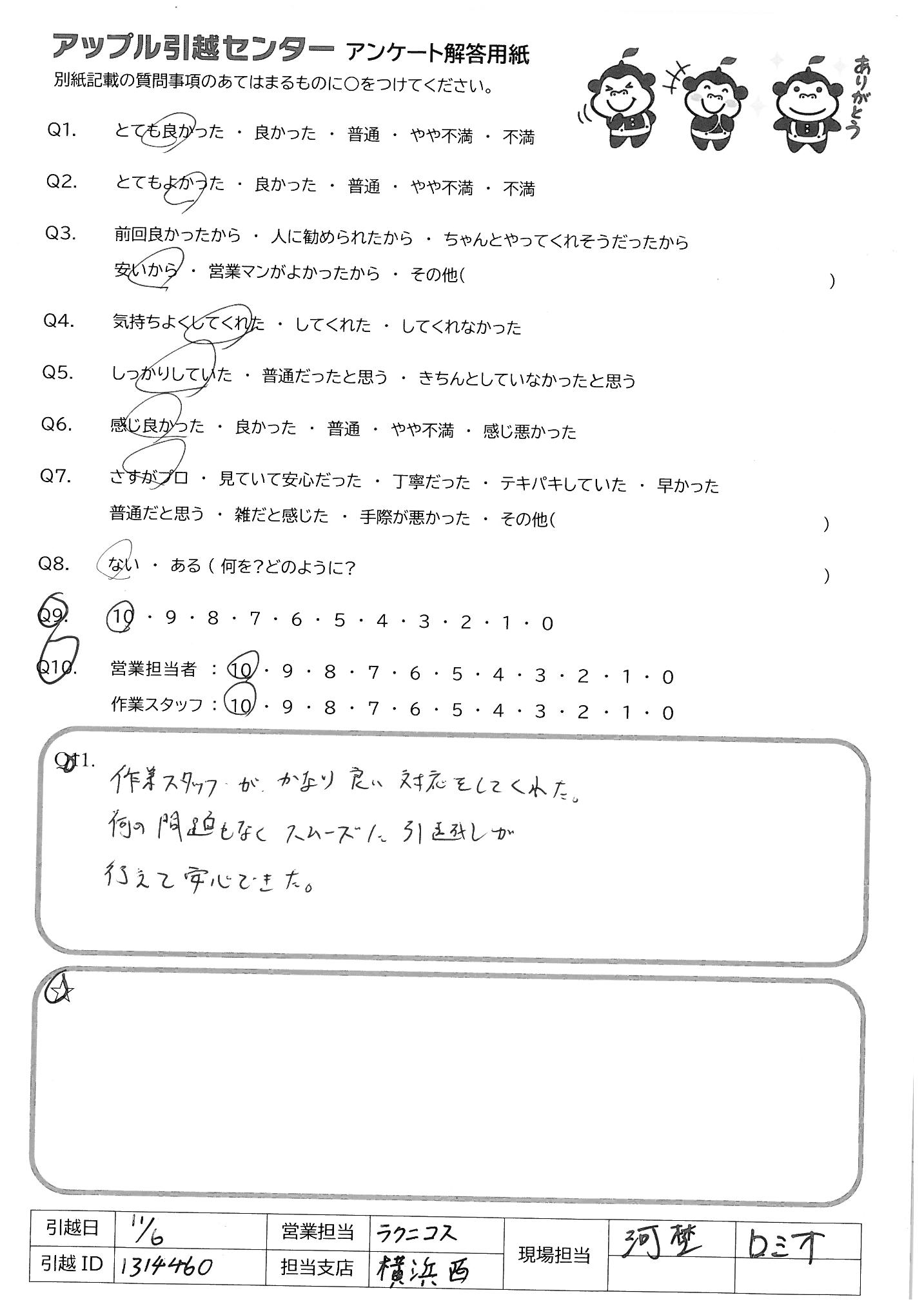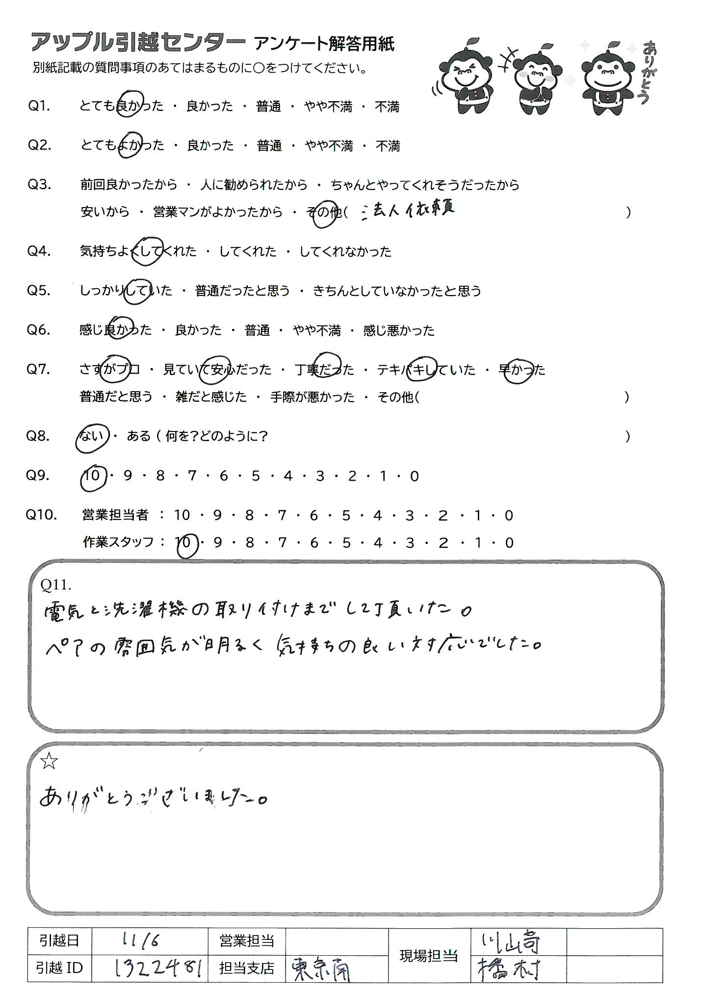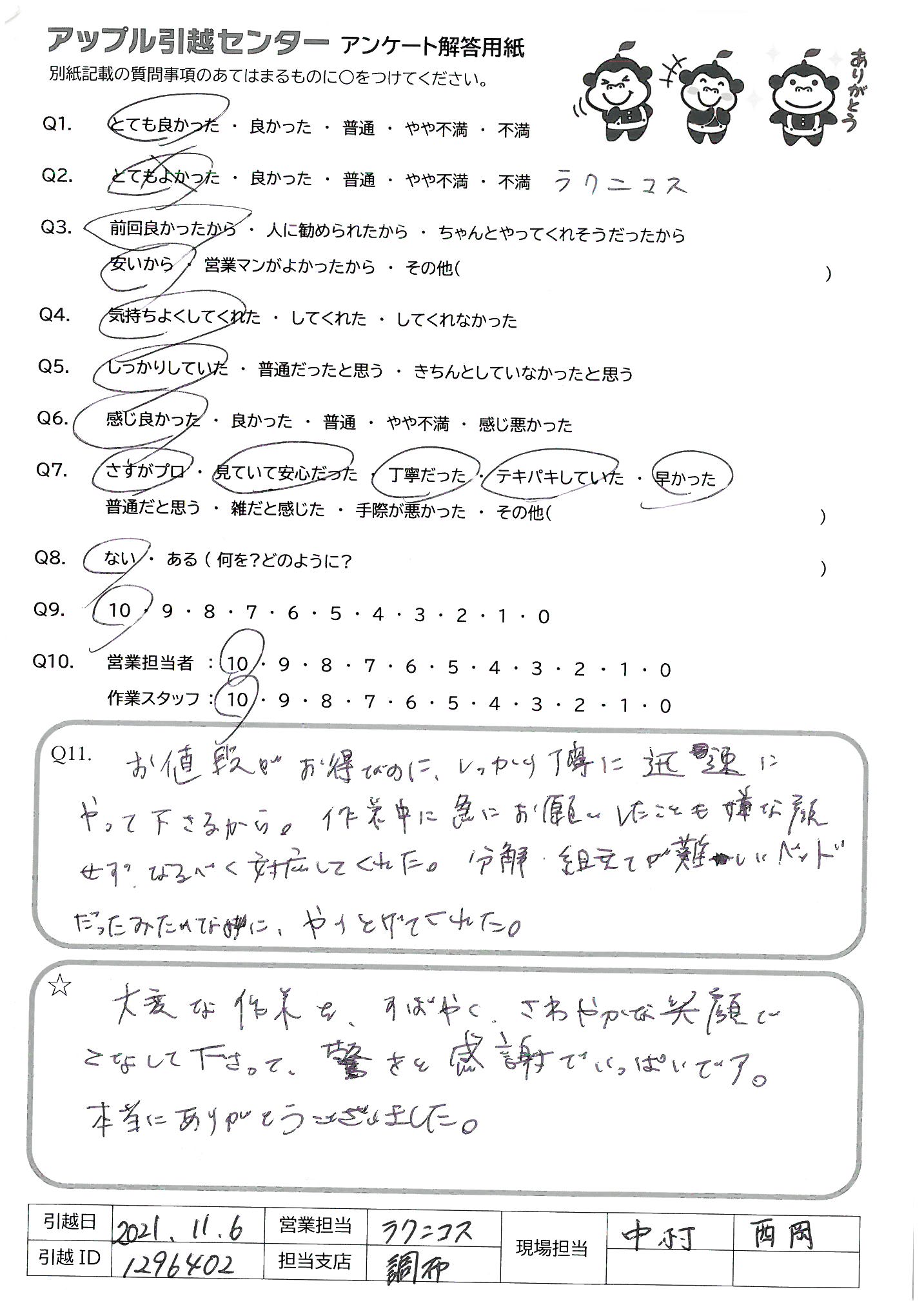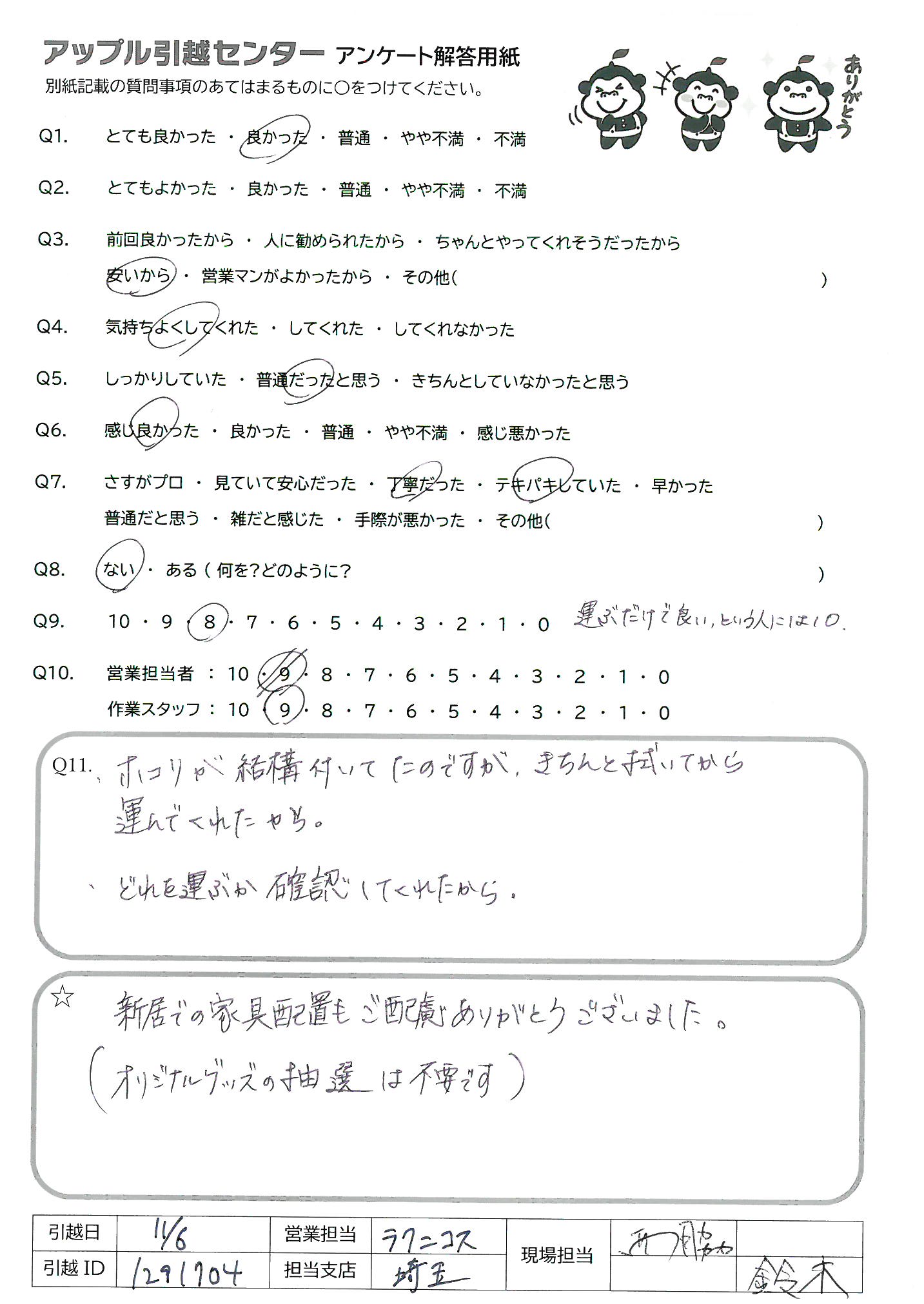 A.今回の引っ越しでは大変お世話になりました。おかげさまで無事新生活を始める事ができました。 作業やこちらの要望にも臨機応変に対応してくださり、アップルさんにお願いして良かったと思いました。次回引っ越しする機会がありましたら、また是非お願いしたいです。