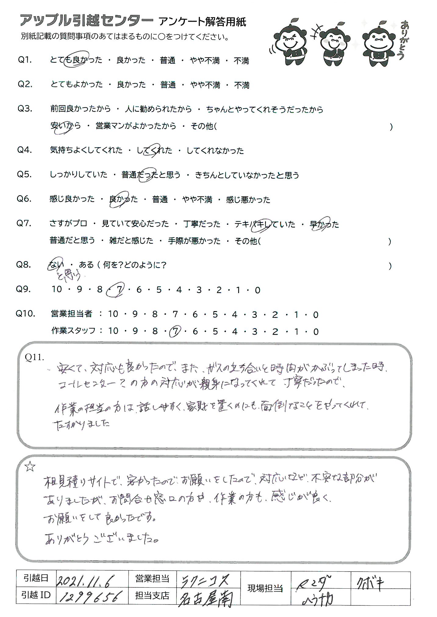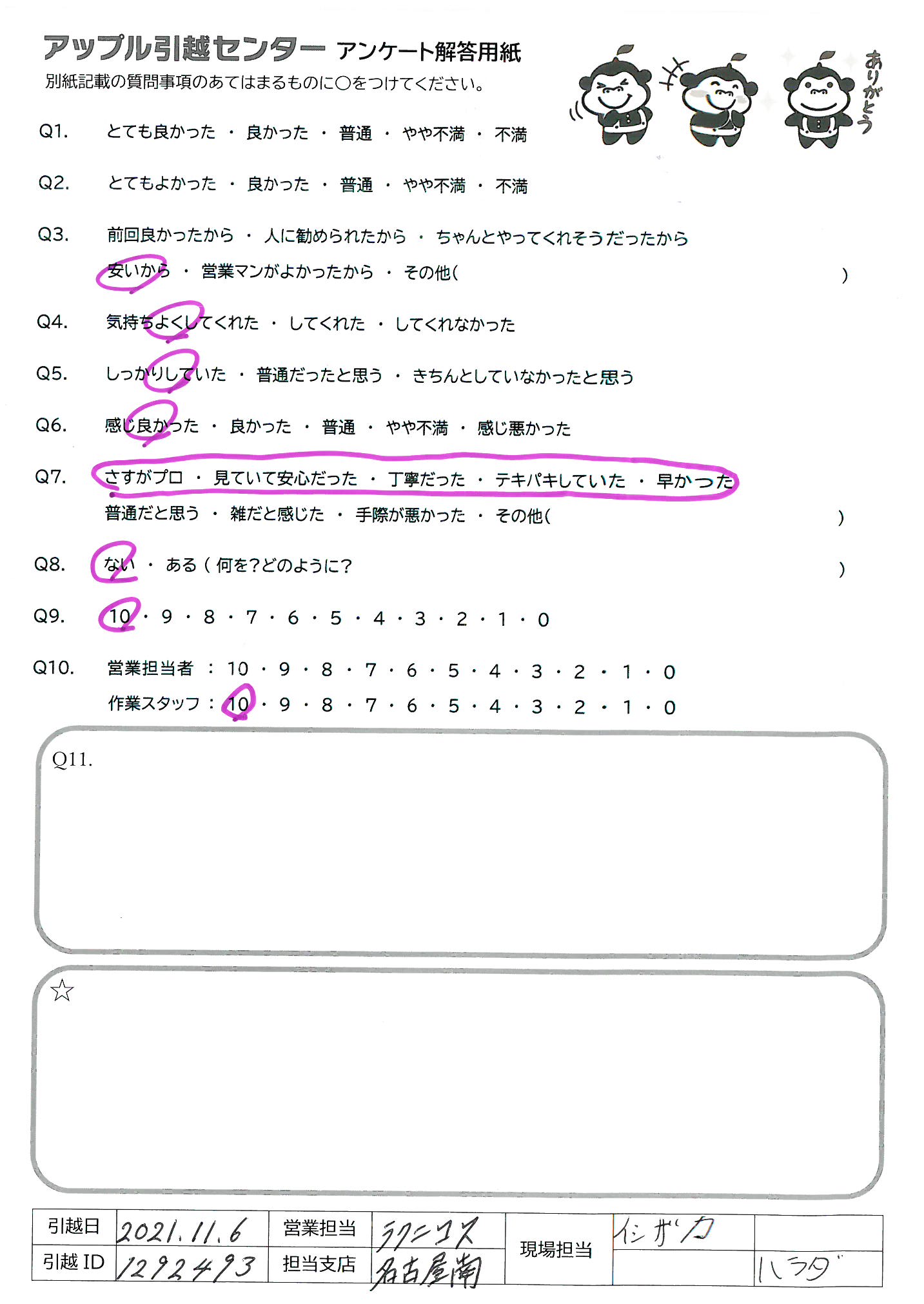 引越し日:2021年11月06日 エリア:愛知県名古屋市中区
