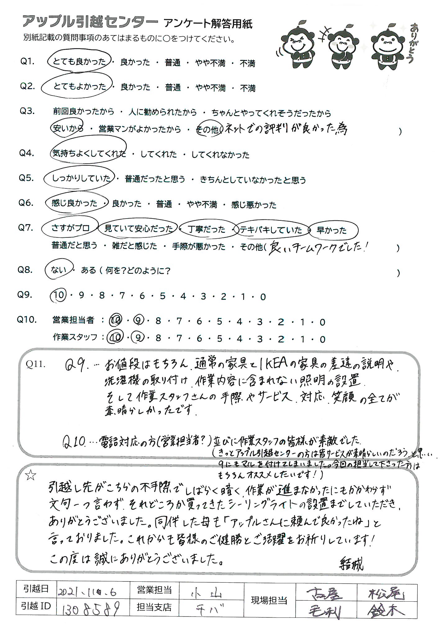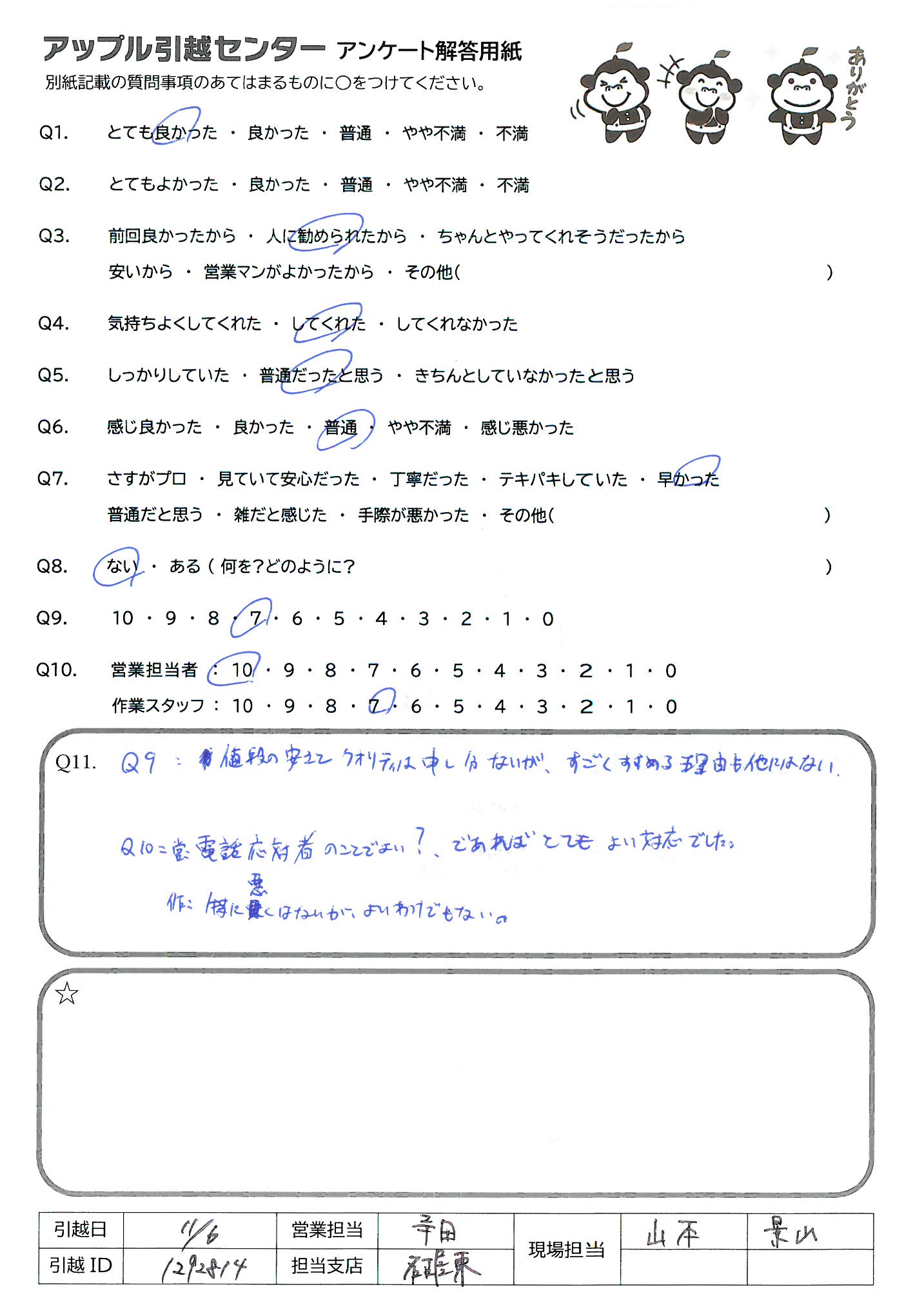 A.Q9-お値段はもちろん、通常の家具とIKEAの家具の差違の説明や、洗濯機の取り付け、作業内容に含まれない照明の設置、そして作業スタッフさんの手際やサービス、対応、笑顔の全てが素晴らしかったです Q10...電話対応の方(営業担当者?)並びに作業スタッフの皆様が素敵でした(きっとアップル引越センターの方は皆サービスが素晴らしいのだろうと思い、9にもマルを付けてしまいました。今回の担当して下さった方はもちろんオススメしたいです!)