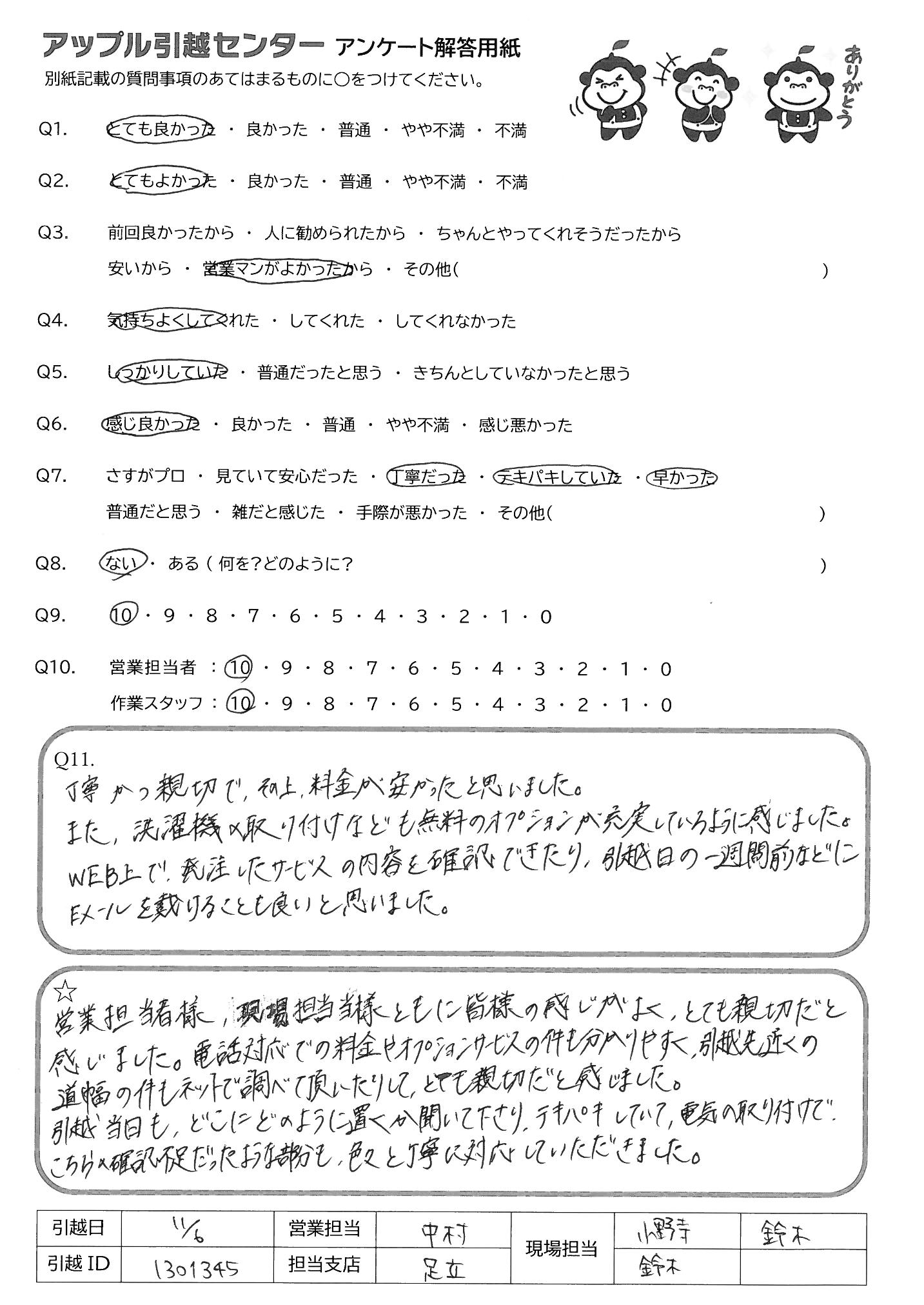 A.最初から最後まで丁寧な対応で、アップル引越しセンターに頼んで良かったと思います。ありがとうございました。