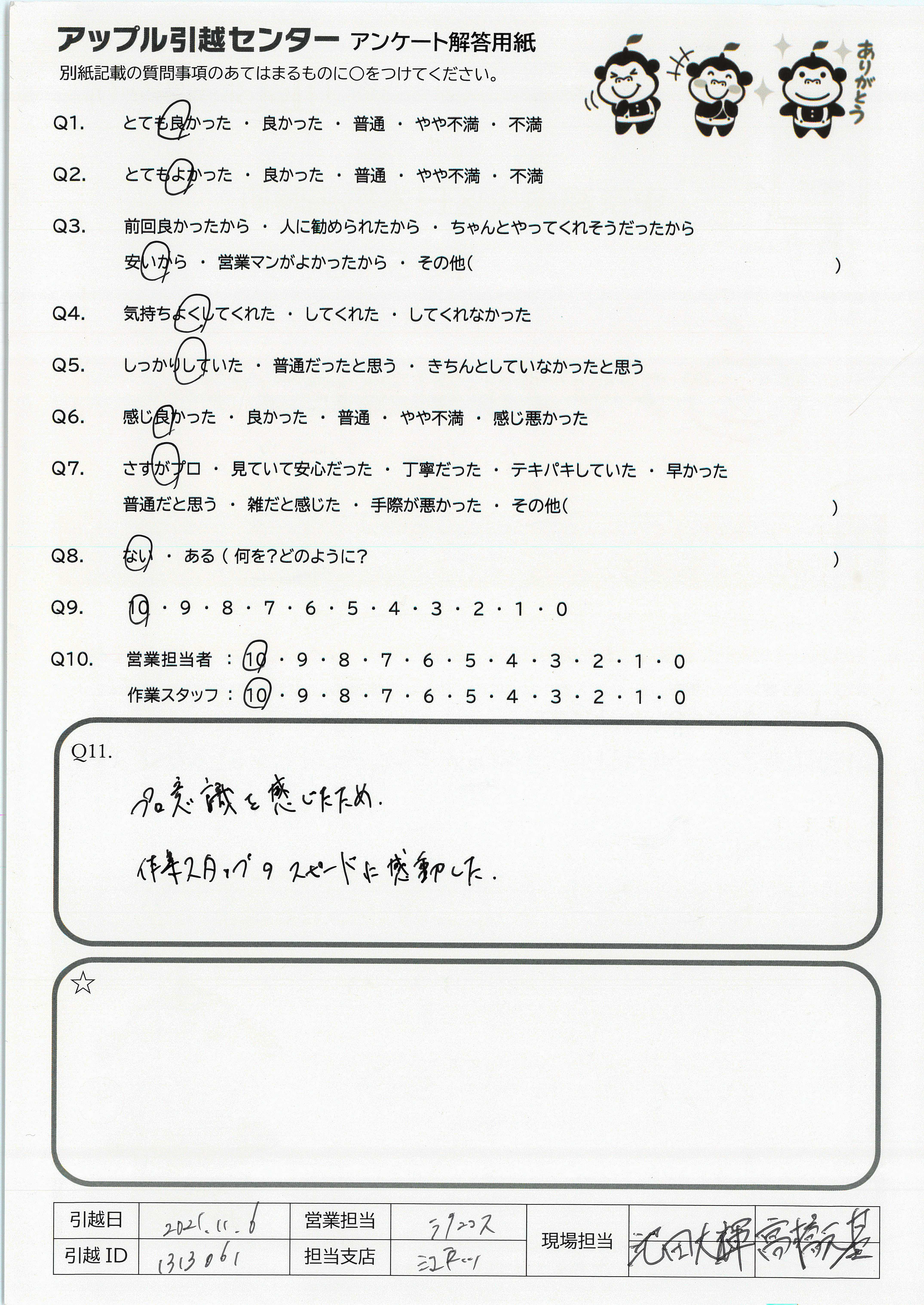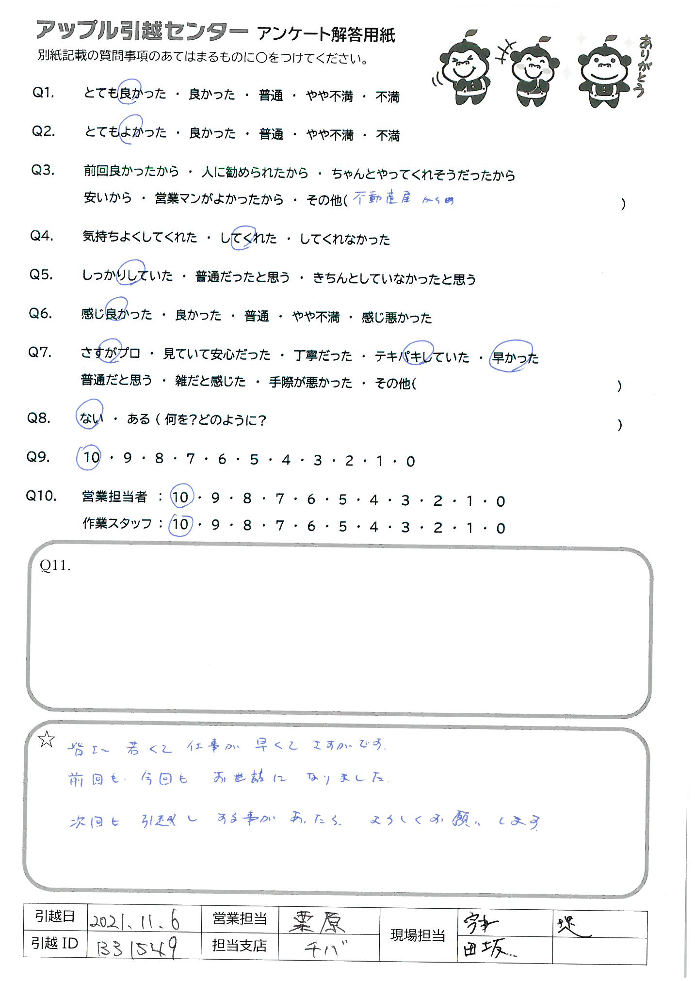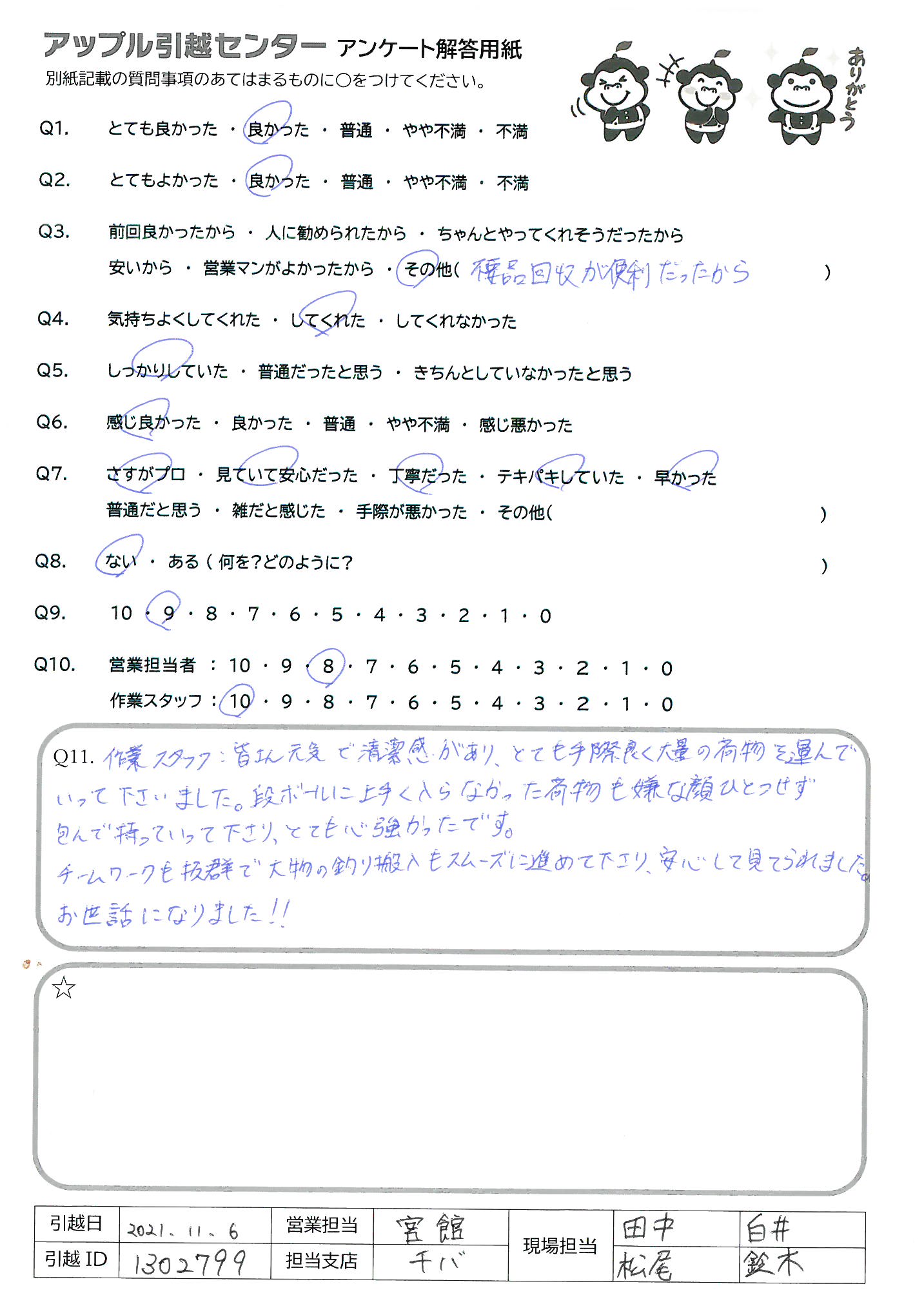 A.担当してくださったスタッフの皆様、本当にありがとうございました。 前回利用した時も知人に薦めましたが、今回も引越しを検討している知人がいたら薦めようと思いました。 また引越しの機会がありましたら、何卒よろしくお願いいたします。