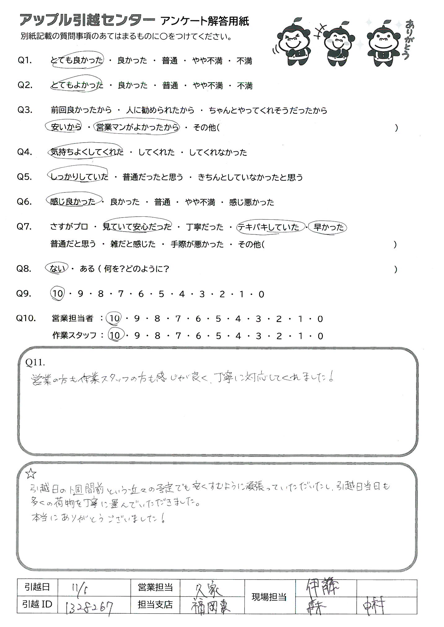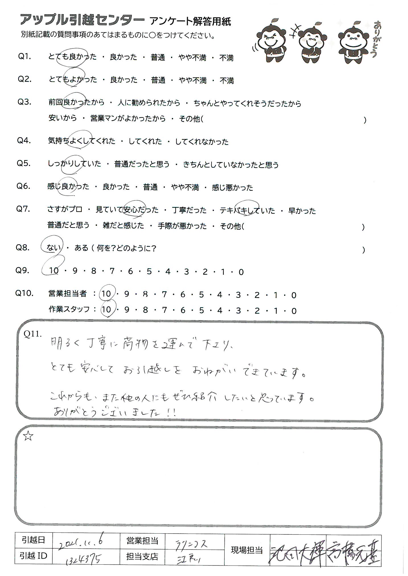 A.前回同様、丁寧に対応していただきとても助かりました。 運び出す際も前から付いているキズの確認をしてくださったり、お外で梱包しますね~と声掛けをしてくださったりと、こちらが不安にならないよう気にかけてくれていたように感じました。 今回が2度目の利用になりますが、また引越しをする際にはアップルさんにお願いしたいと思います。 この度はありがとうございました。