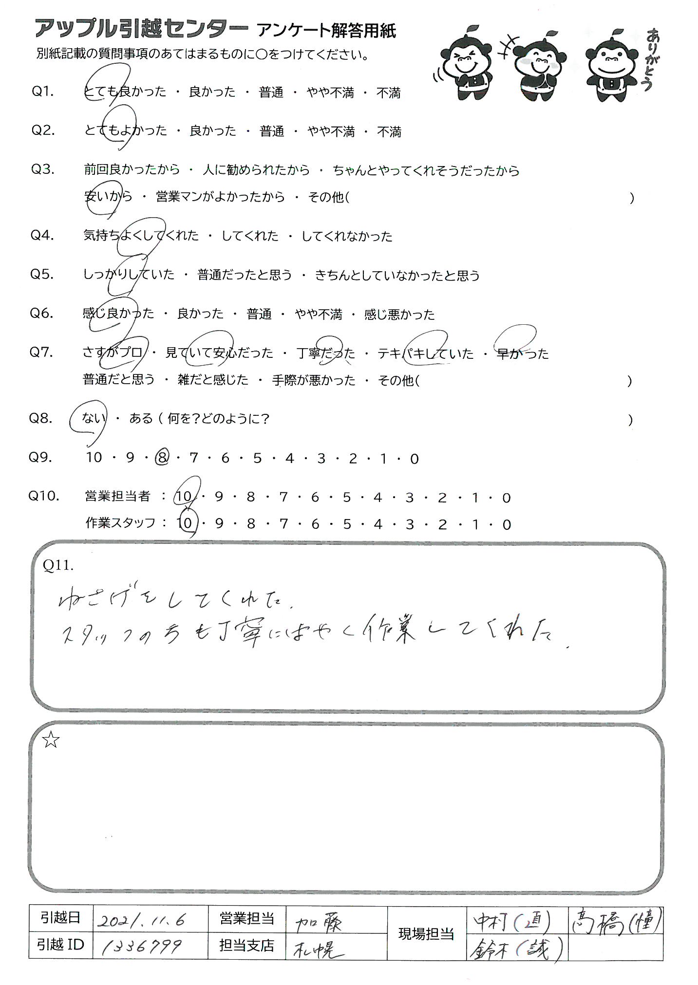 引越し日:2021年11月06日 エリア:北海道札幌市白石区