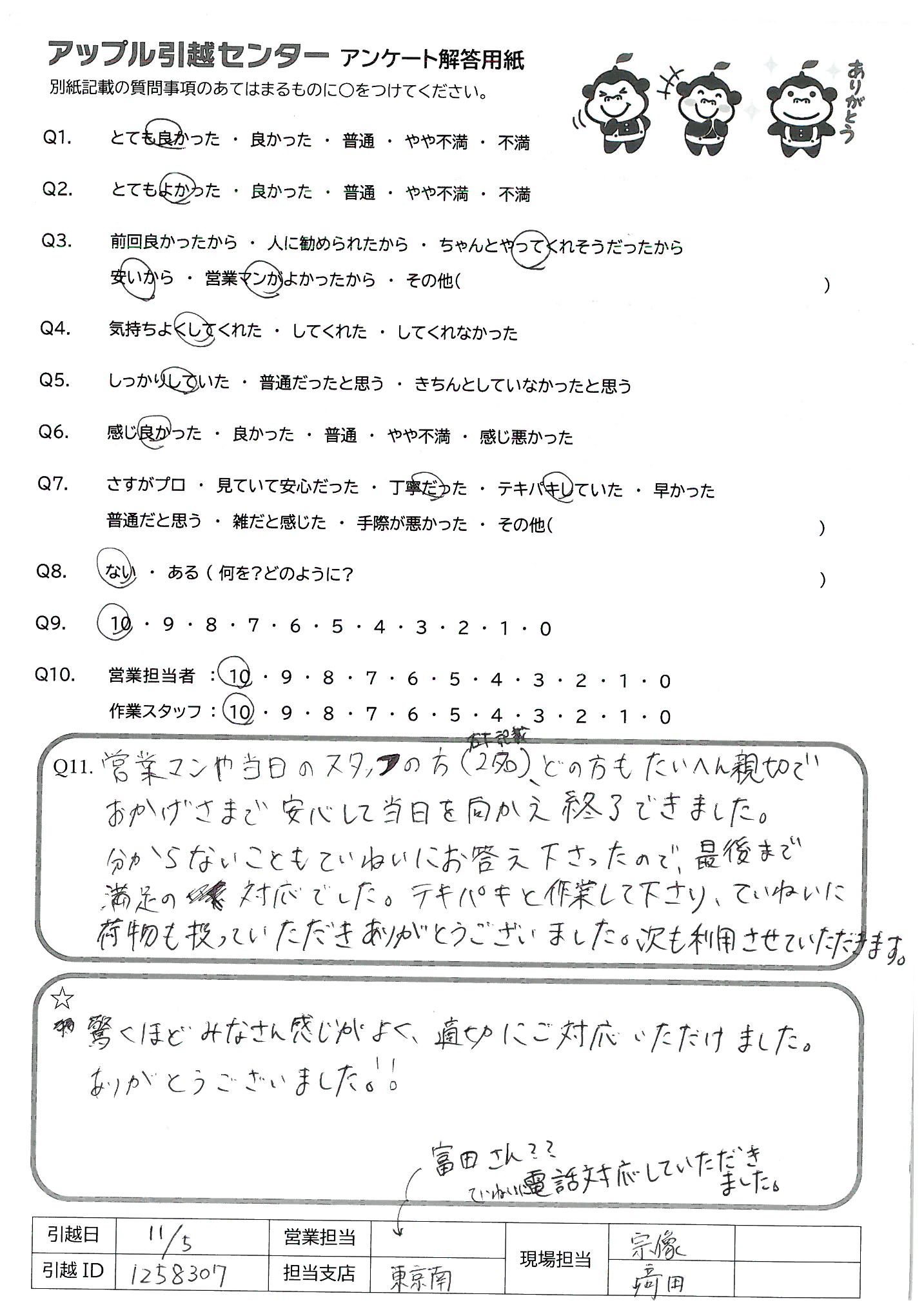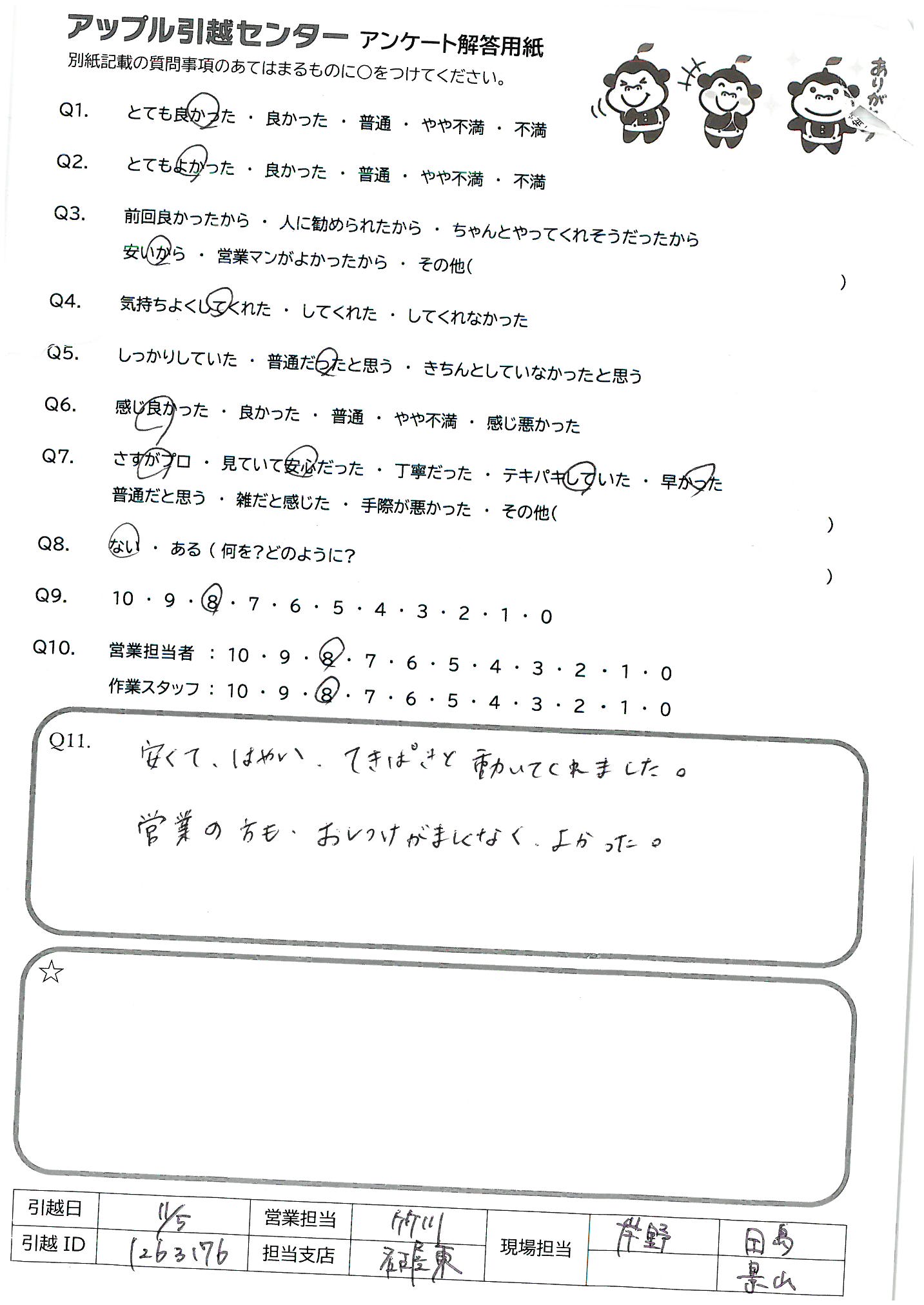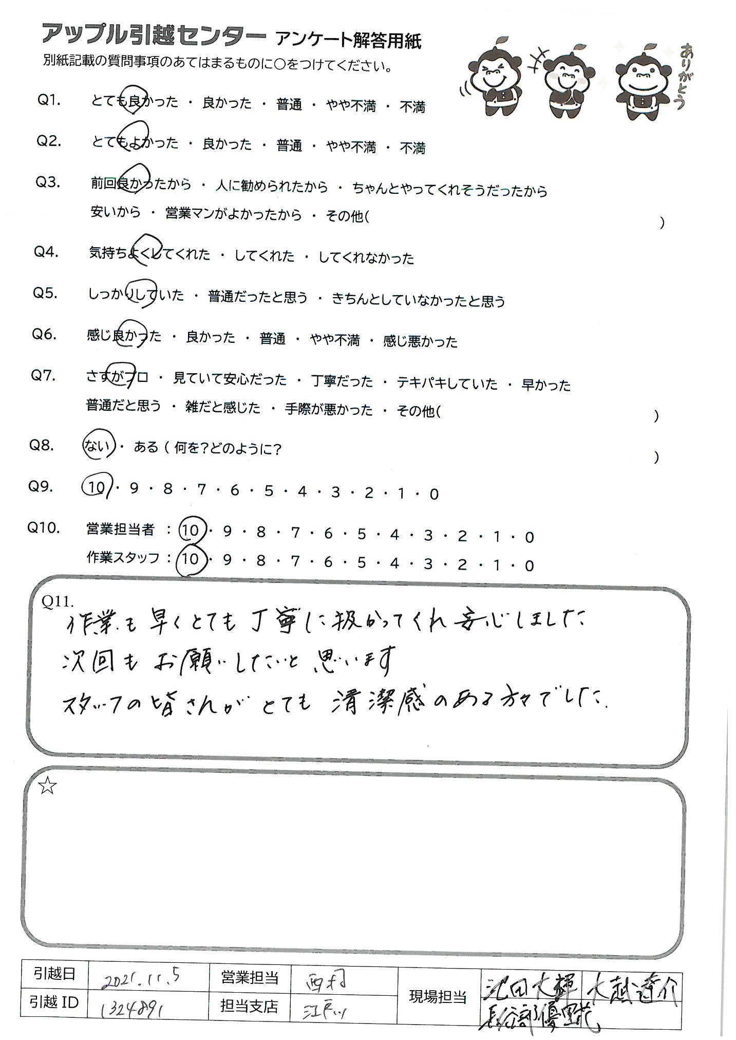 A.営業マンや当日のスタッフの方(2名)、どの方もたいへん親切でおかげさまで安心して当日を向かえ終了できました。分からないこともていねいにお答え下さったので、最後まで満足のいく対応でした。テキパキと作業して下さり、ていねいに荷物も扱っていただきありがとうございました。次も利用させていただきます。