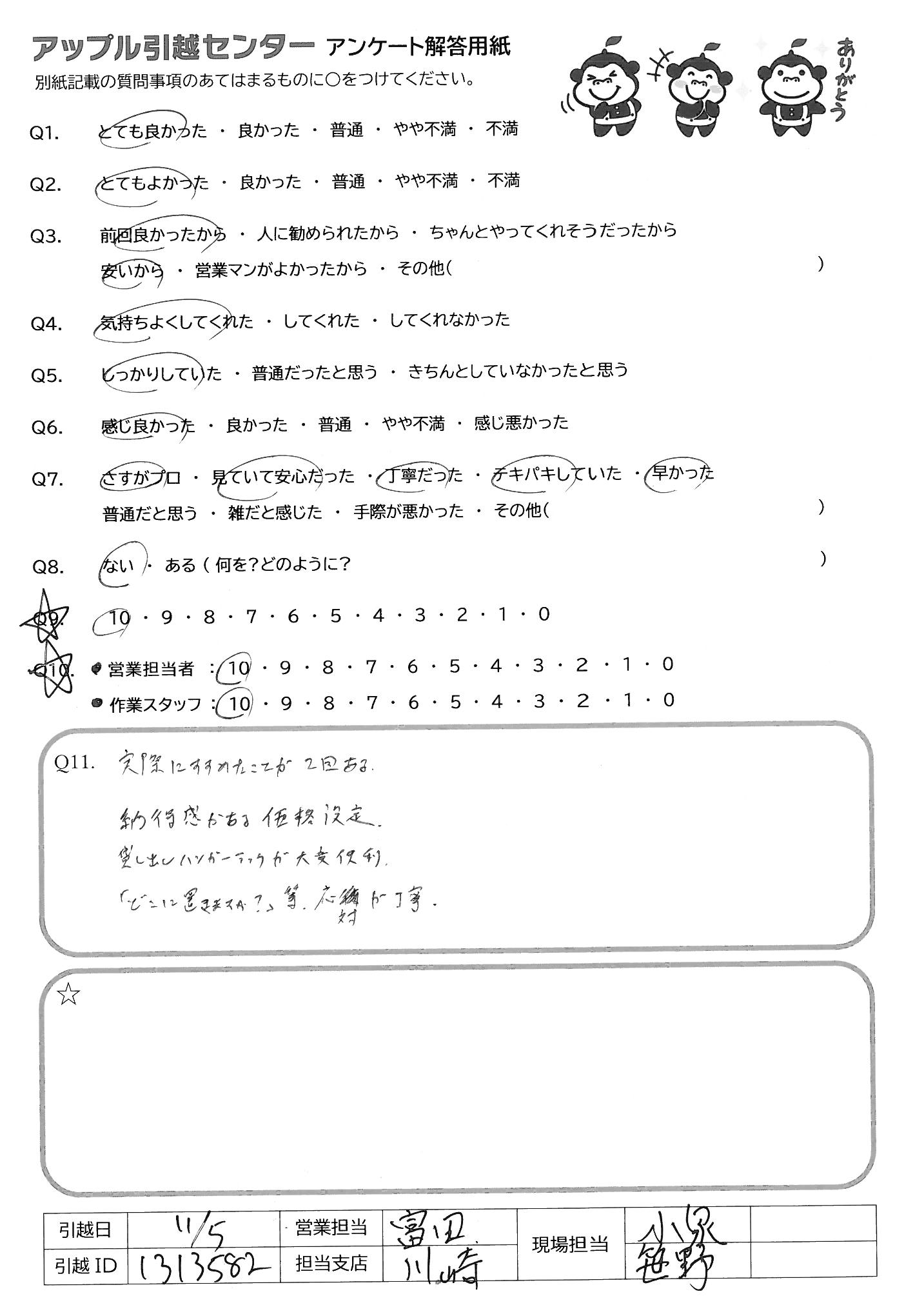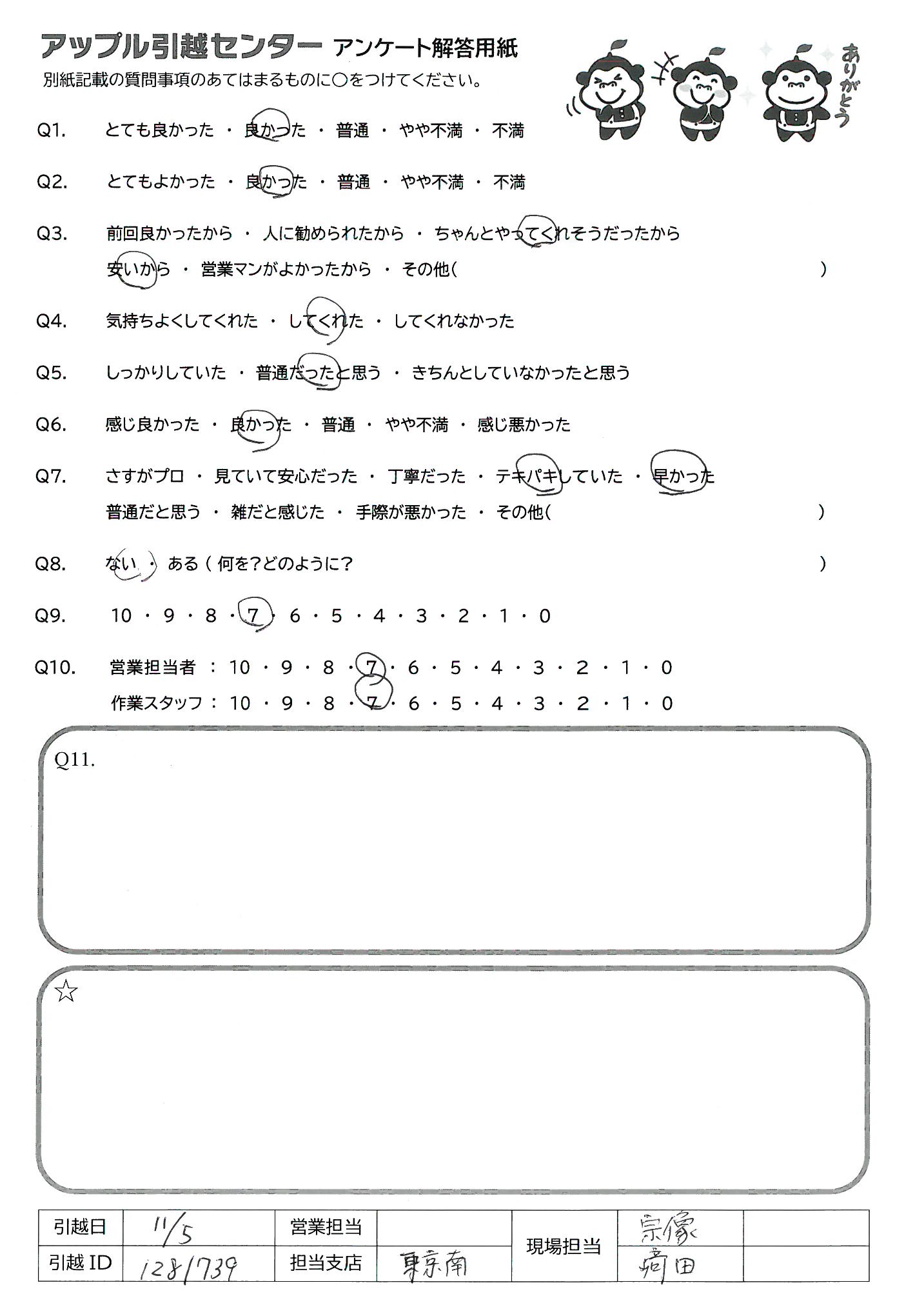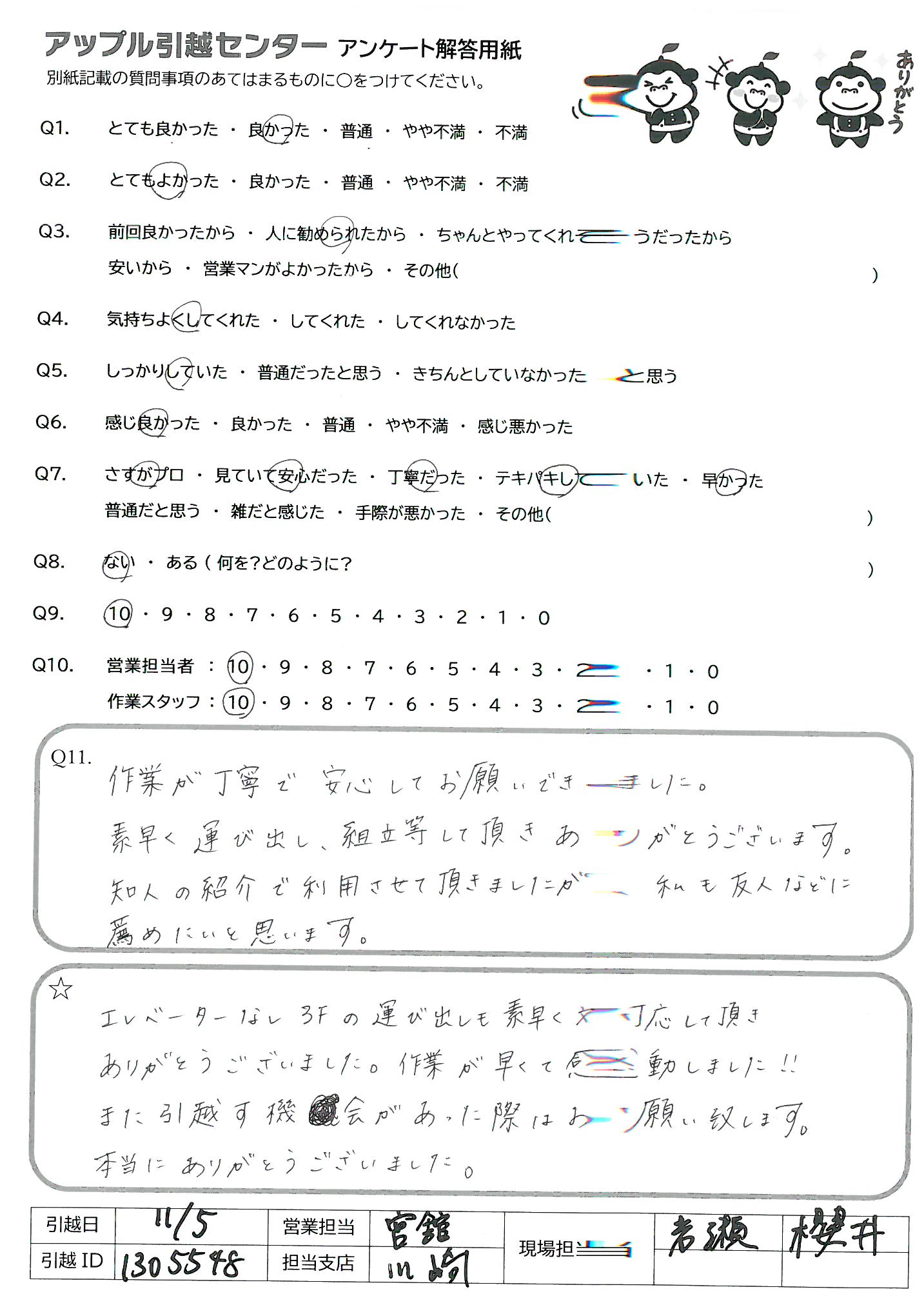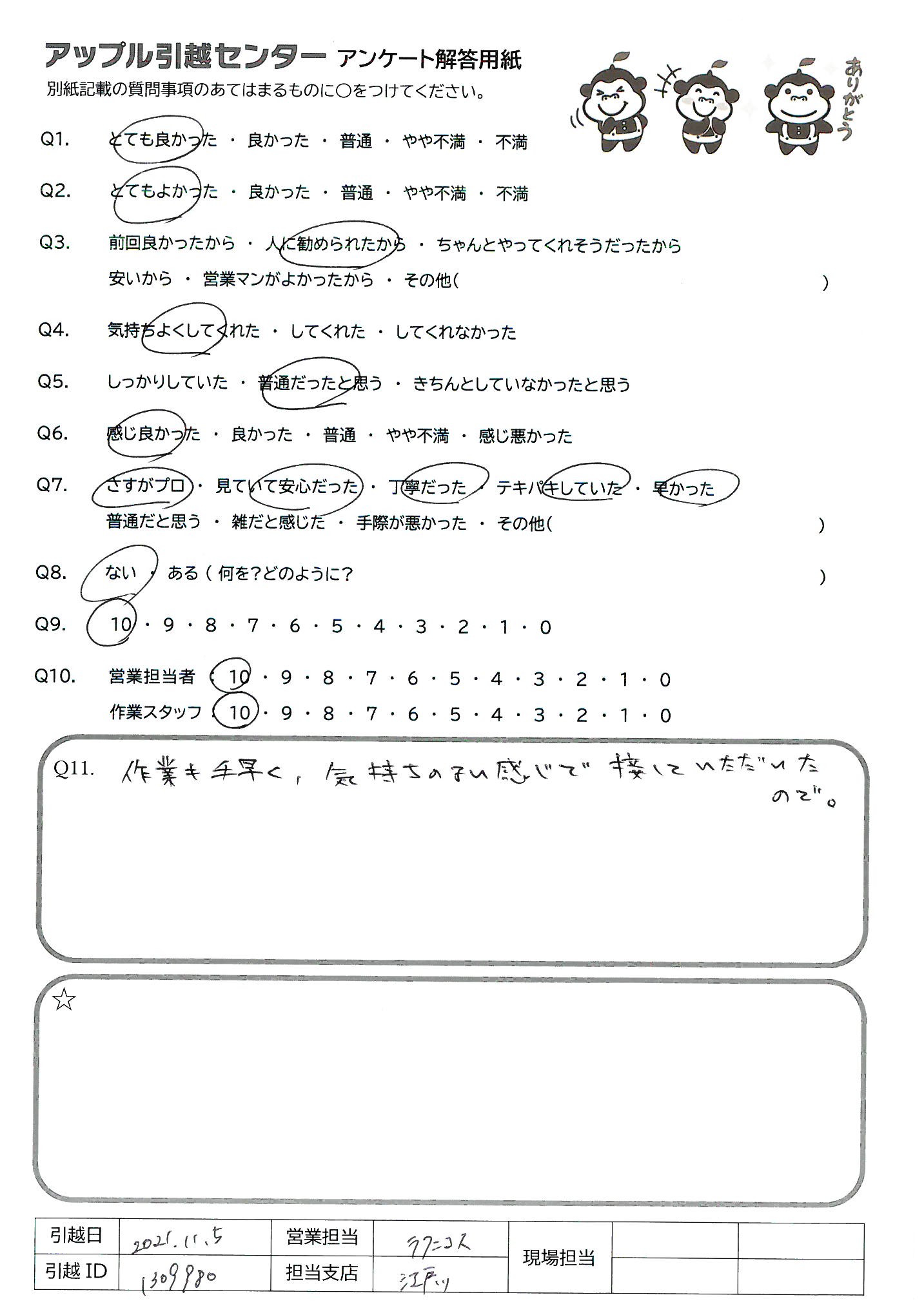A.営業マンや当日のスタッフの方(2名)、どの方もたいへん親切でおかげさまで安心して当日を向かえ終了できました。分からないこともていねいにお答え下さったので、最後まで満足のいく対応でした。テキパキと作業して下さり、ていねいに荷物も扱っていただきありがとうございました。次も利用させていただきます。