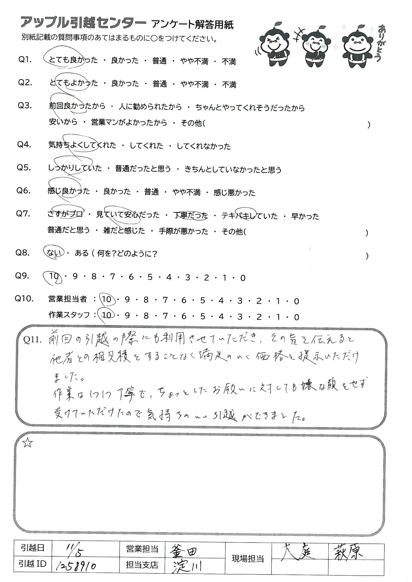 A.前回の引越の際にも利用させていただき、その旨を伝えると他社との相見積をすることなく満足のいく価格を提示いただけました。作業は1つ1つ丁寧で、ちょっとしたお願いに対しても嫌な顔をせず受けていただけたので気持ちのいい引越ができました。