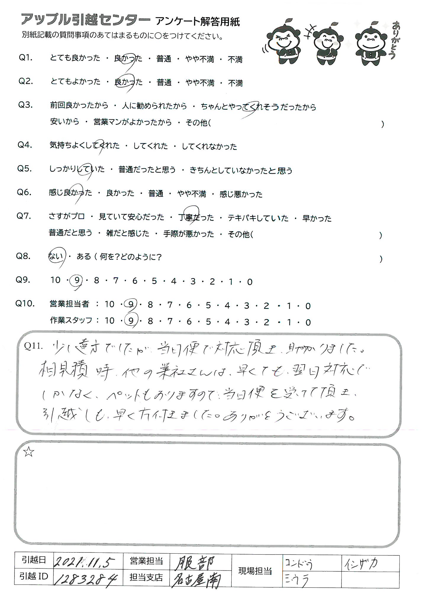 引越し日:2021年11月05日 エリア:愛知県名古屋市北区