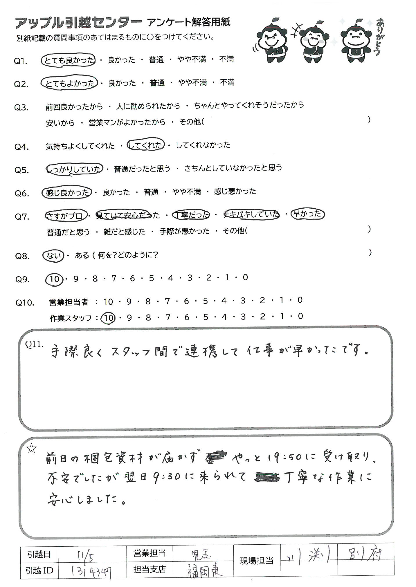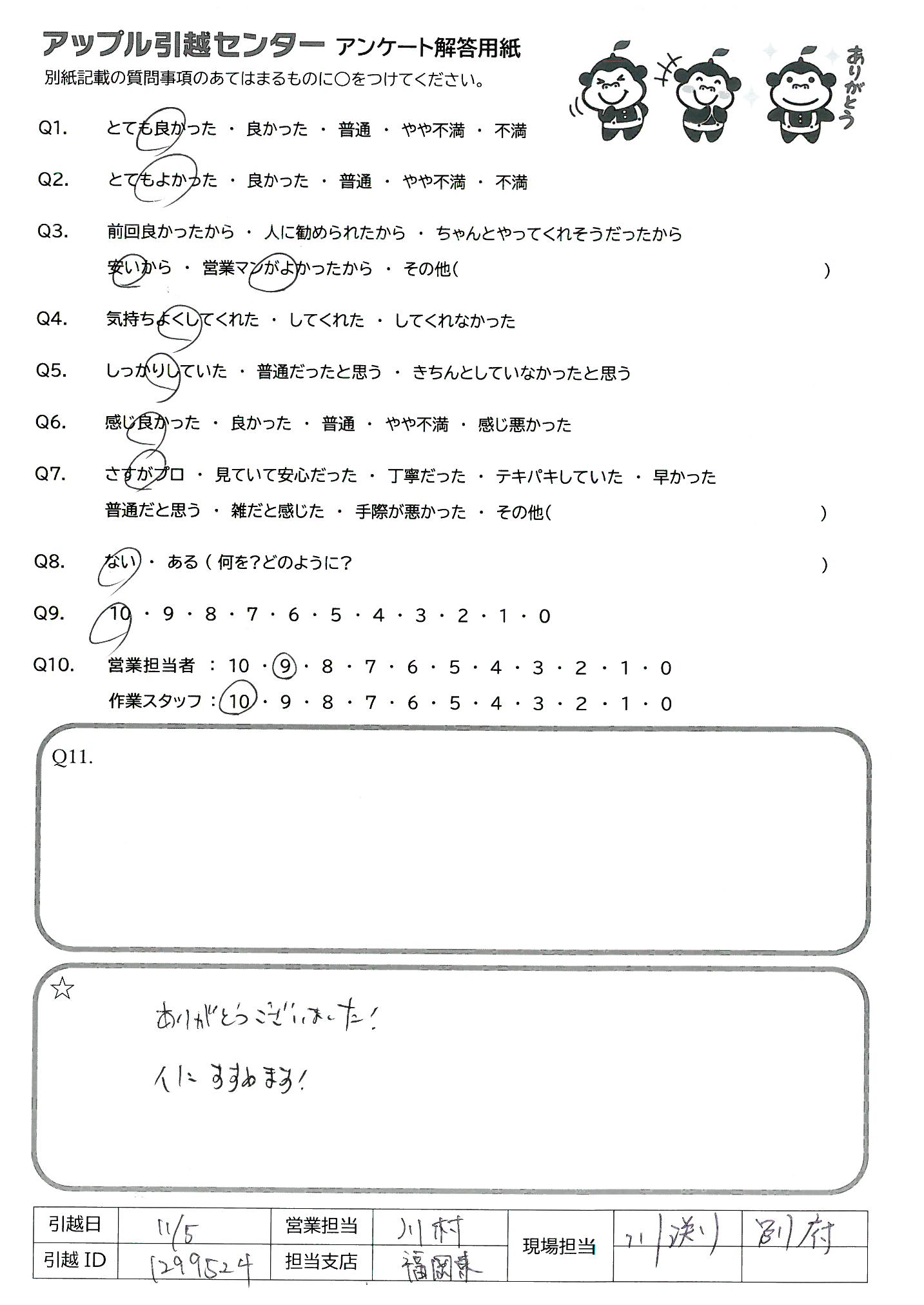 引越し日:2021年11月05日 エリア:福岡県福岡市東区