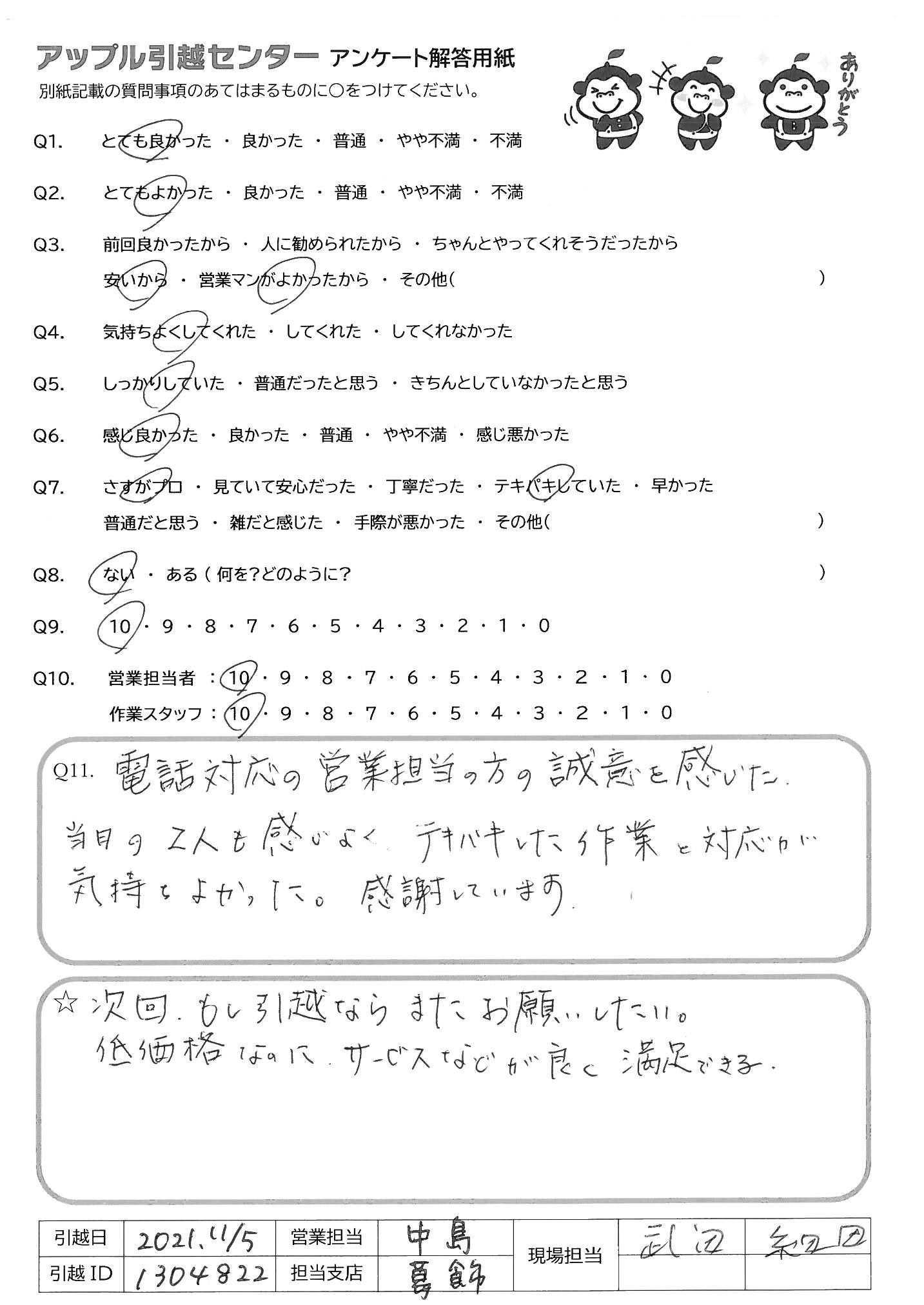 A.次回、もし引越ならまたお願いしたい。 低価格なのに、サービスなどが良く満足できる。