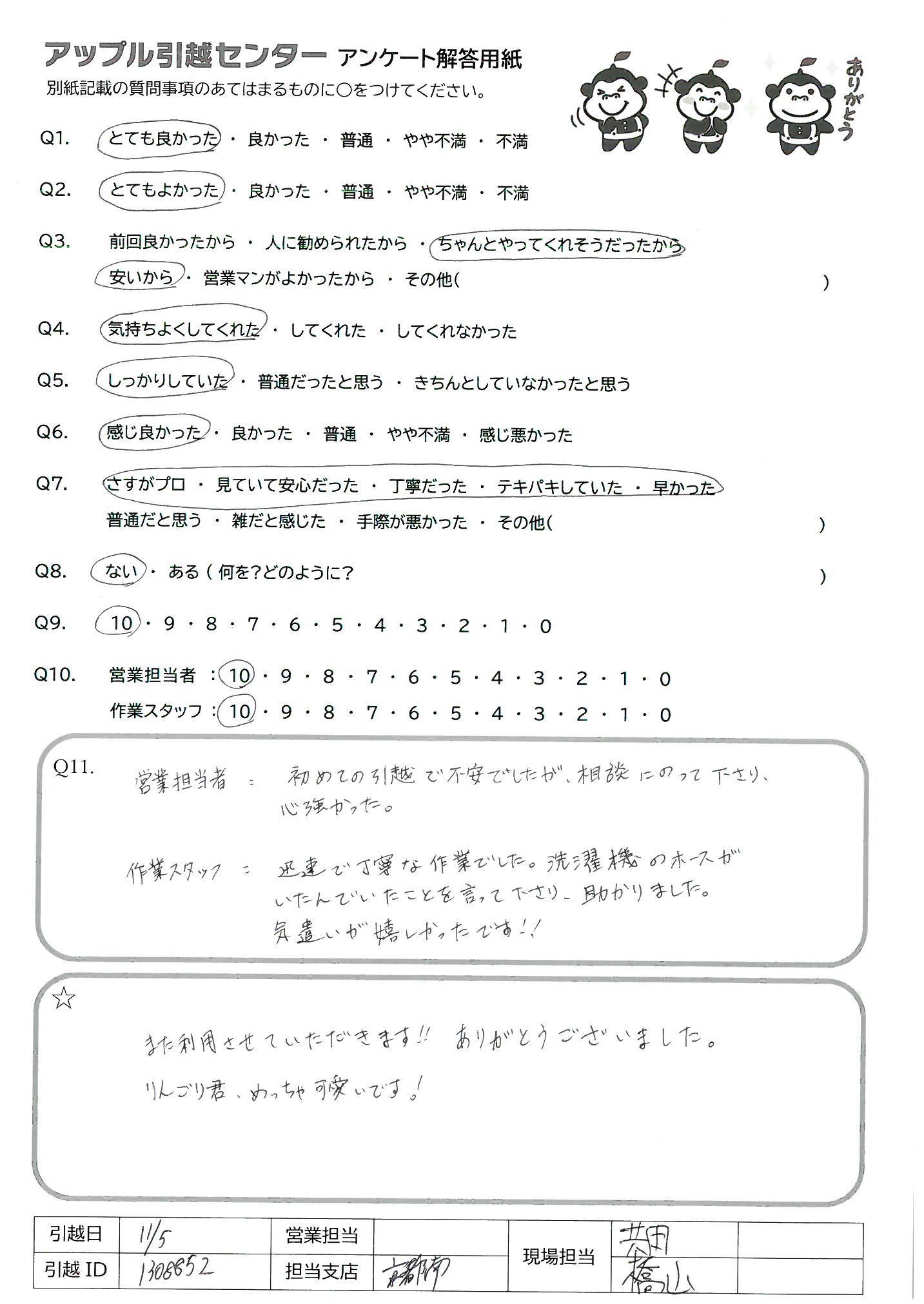 A.営業担当者:初めての引越で不安でしたが、相談にのって下さり、心強かった。 作業スタッフ:迅速で丁寧な作業でした。洗濯機のホースがいたんでいたことを言って下さり、助かりました。気遣いが嬉しかったです!!