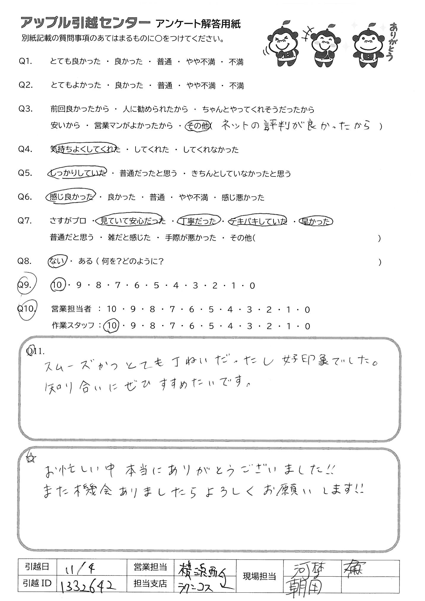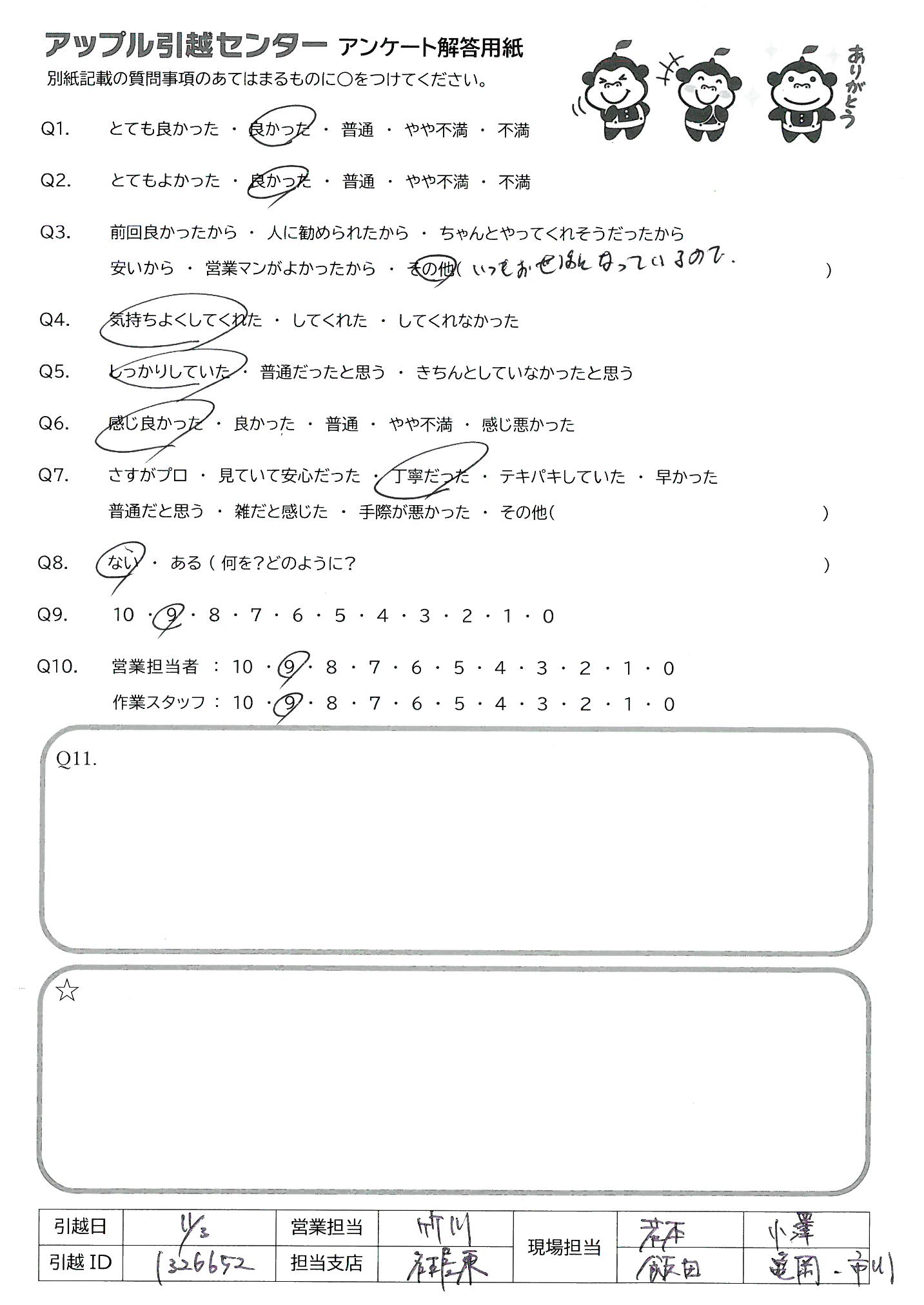 A.作業員の方は丁寧で完璧でした。 営業の方は、算段が甘かったのか、 ダンボールが足りなかったり、トラックが一台では足りない、 養生が足りないといったことが色々発生し、結果として作業終了が深夜になってしまったので、 その辺りはもう少し改善していただけたらと思いました。