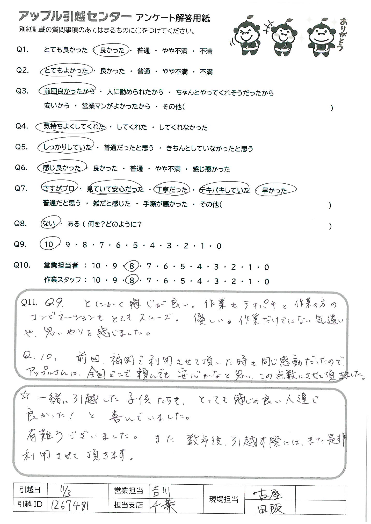 A.一緒に引越した子供たちも、とっても感じの良い人達で良かった!と喜んでいました。 有難うございました。また数年後引越す際には、また是非利用させて頂きます。