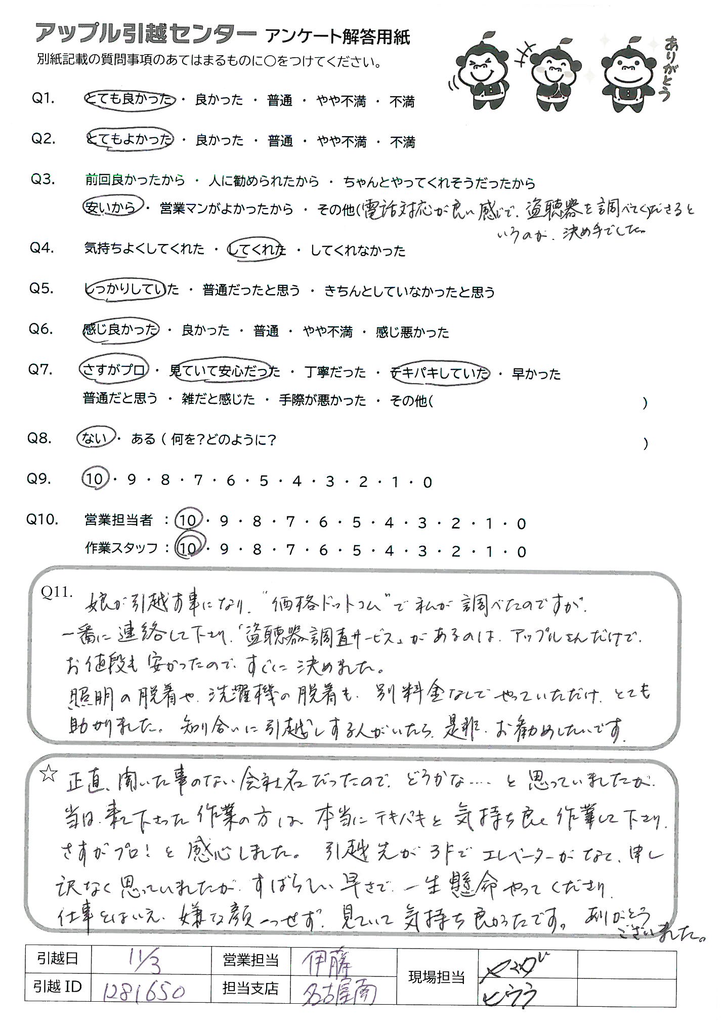 A.電話やメールでの対応はとても丁寧で分かりやすく こちらが聞きたいことを全て明確に教えていただいたので満足しています。 細かいことですが、メールでやり取りの時に名乗らない場合がありましたのでその点が少し気になりました。 急いで回答してくれたのかなとは思いますが誰と話しているのかは把握しておきたいと思ったので満点にはしてないです。それ以外はとても満足しています。 作業スタッフの方は、こちらの要望通りに対応していただけて、とても助かりました。 こちらが慌てていたのですが冷静に対応いただけで結果的予想よりも早く積み込みや荷降ろし作業が終わり大変満足しています。