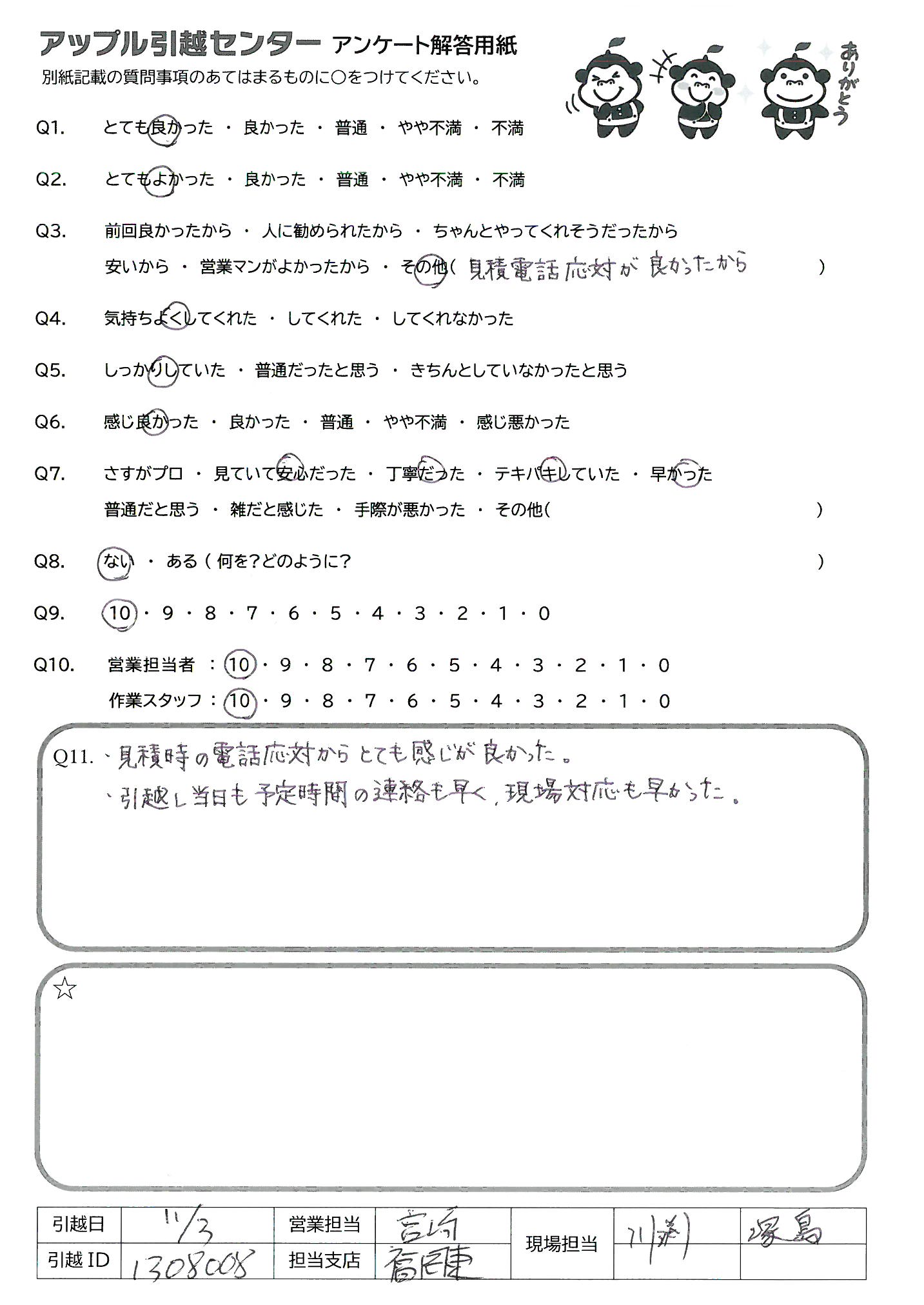 A.・見積時の電話応対からとても感じがよかった。 ・引越し当日も予定時間の連絡も早く、現場対応も早かった。