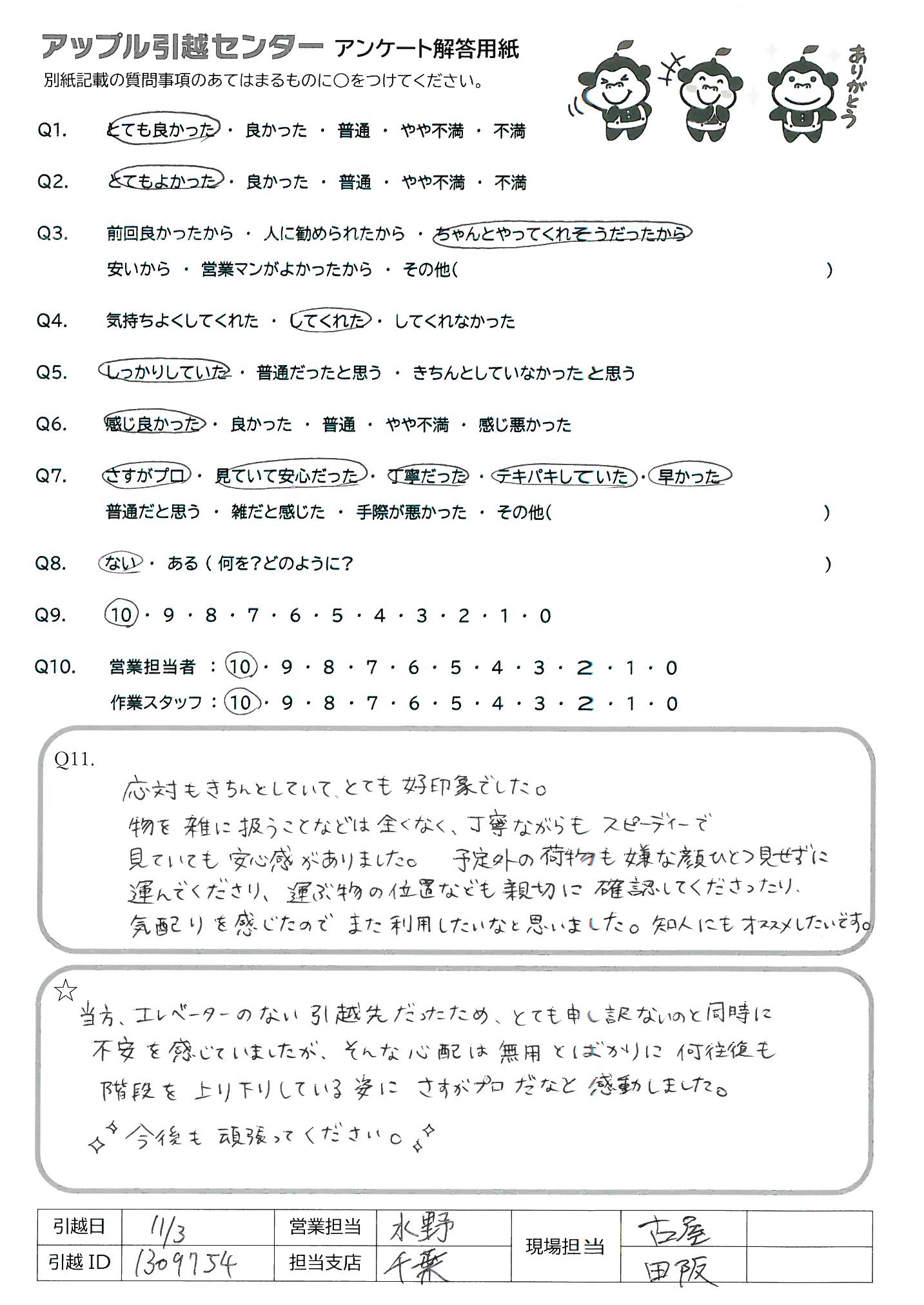 A.当方、エレベーターのない引越先だったため、とても申し訳ないのと同時に不安を感じていましたが、そんな心配は無用とばかりに何往復も階段を上り下りをしている姿にさすがプロだなと感動しました。 今後もがんばってください。